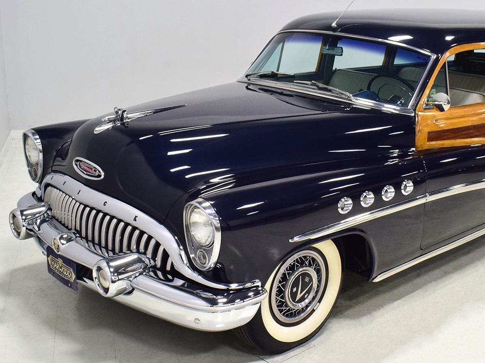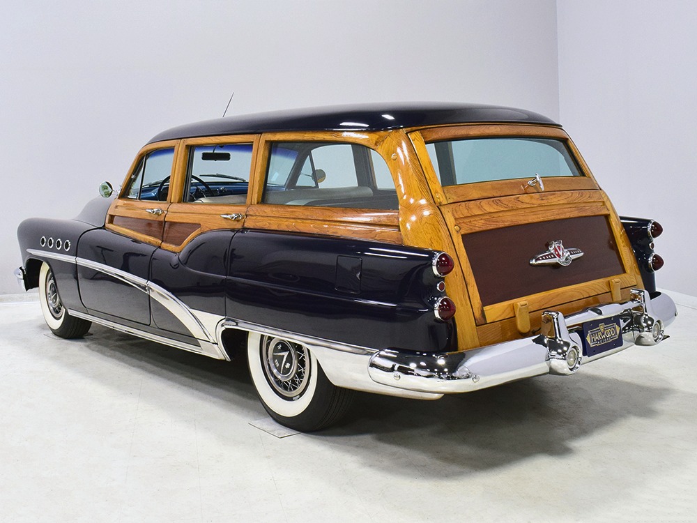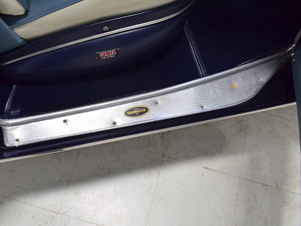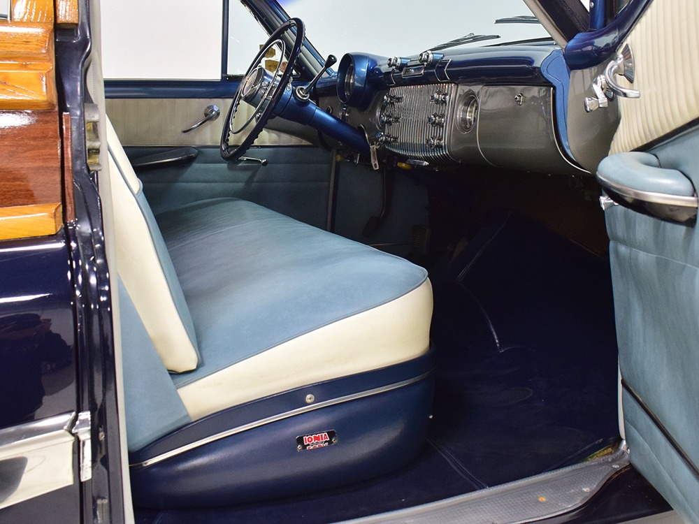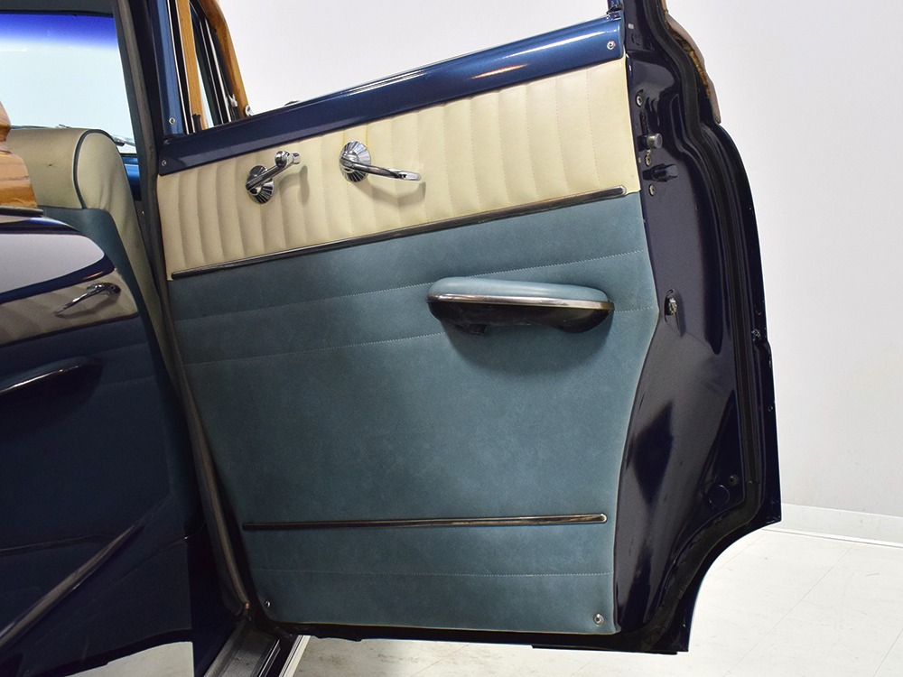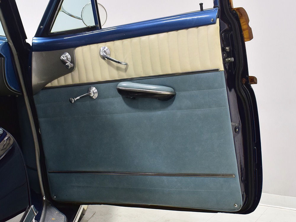 Experts suggest that perhaps 20 or 25 1953 Roadmaster woodies remain, but there’s no way to know for sure. What we do know is that this handsome Imperial Blue Roadmaster wagon is not only one of the prettiest wagons we’ve ever featured, but also one of the best. Going over it carefully, we can find no evidence that anything serious has ever been replaced—the wood appears entirely original, there are no patches in the floor, no replacement body panels, nothing. So they started with an extremely good car when it was comprehensively restored about 15 years ago. Judging by the stickers on the driver’s vent window, it appears to have lived at least part of its life in Boston, as there are Boston Yacht Club parking passes dating to 1967 as well as a pass for the Mystic River bridge. But if it lived all its life there, it certainly wasn’t a daily driver in the winter, because it’s extremely straight and very well preserved throughout. It is worth noting that the color was changed from the original code 52 Verde Green to what appears to be code 53 Imperial Blue. The dramatic contrast between the dark blue paint and the light wood is simply beautiful, and it surely looks better today than it did when it was green. And since they used another factory color, there’s no deduction in judging—nice! Another bonus is that you know the restoration was thorough, because there’s zero evidence of any green paint on the car. If you’re not checking the trim tag, you’d never know this car hasn’t been blue all its life. Someone did this one correctly.