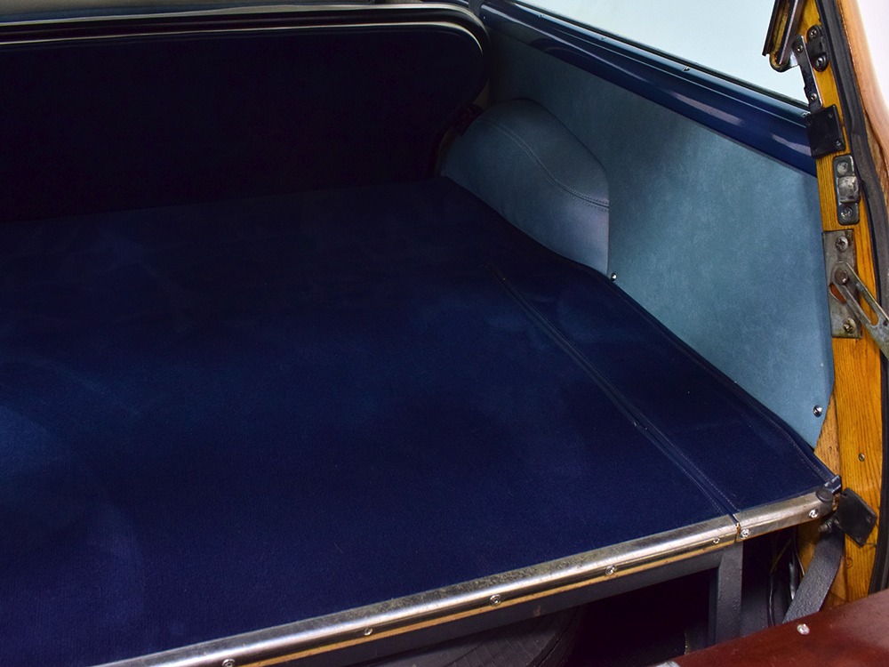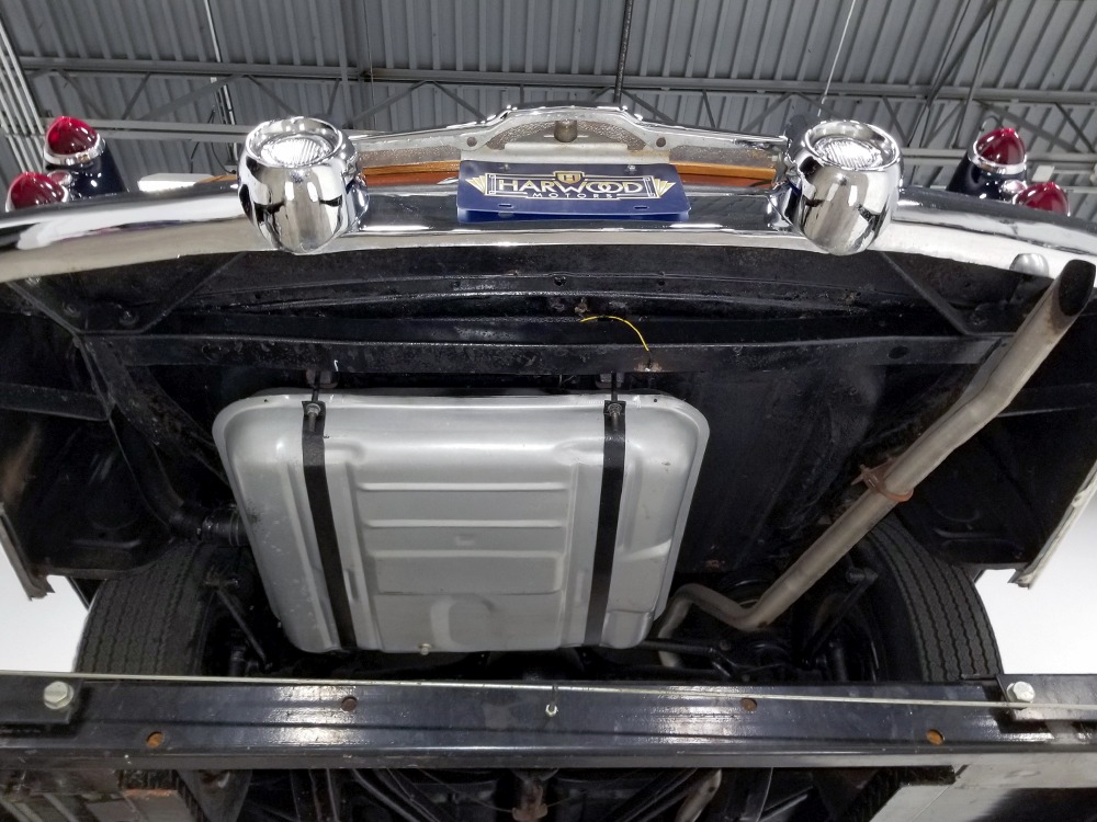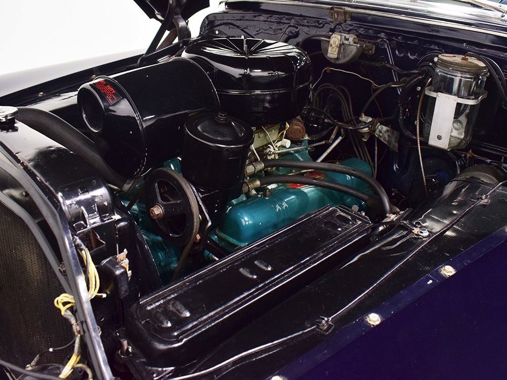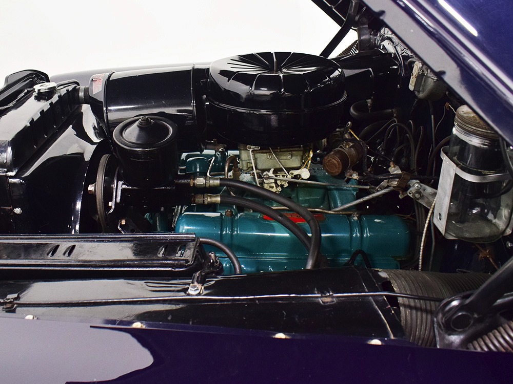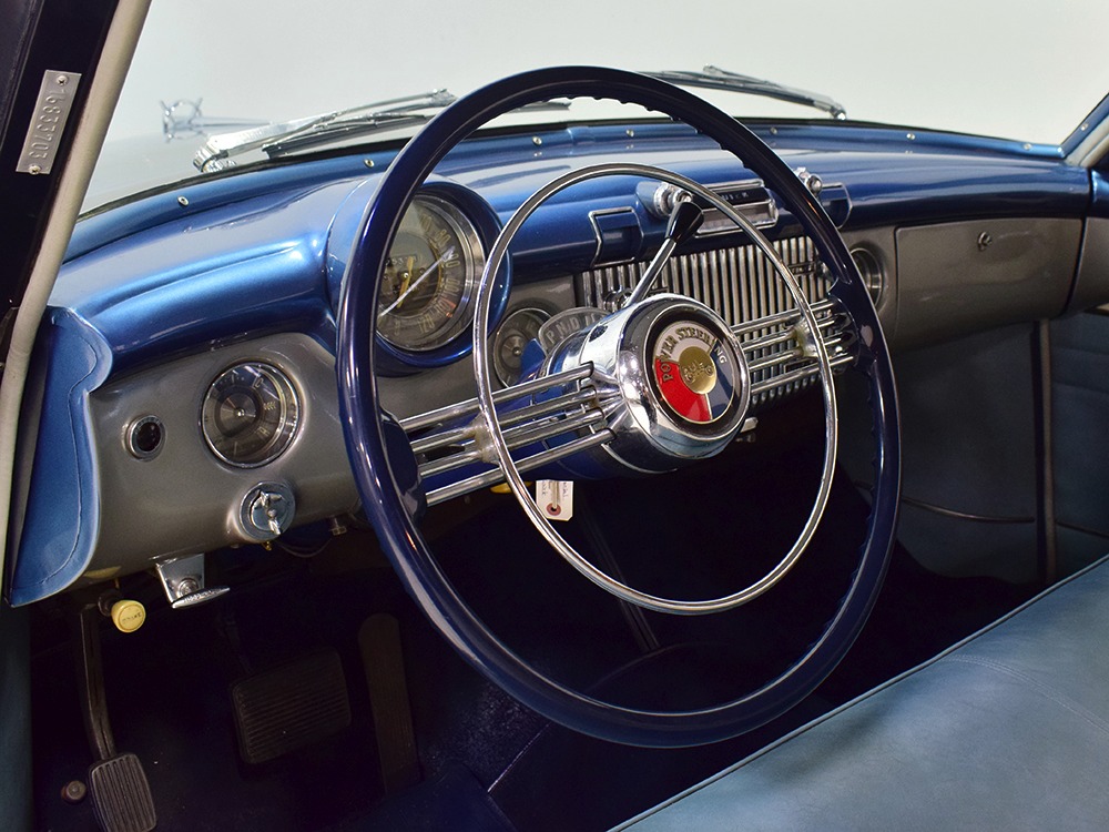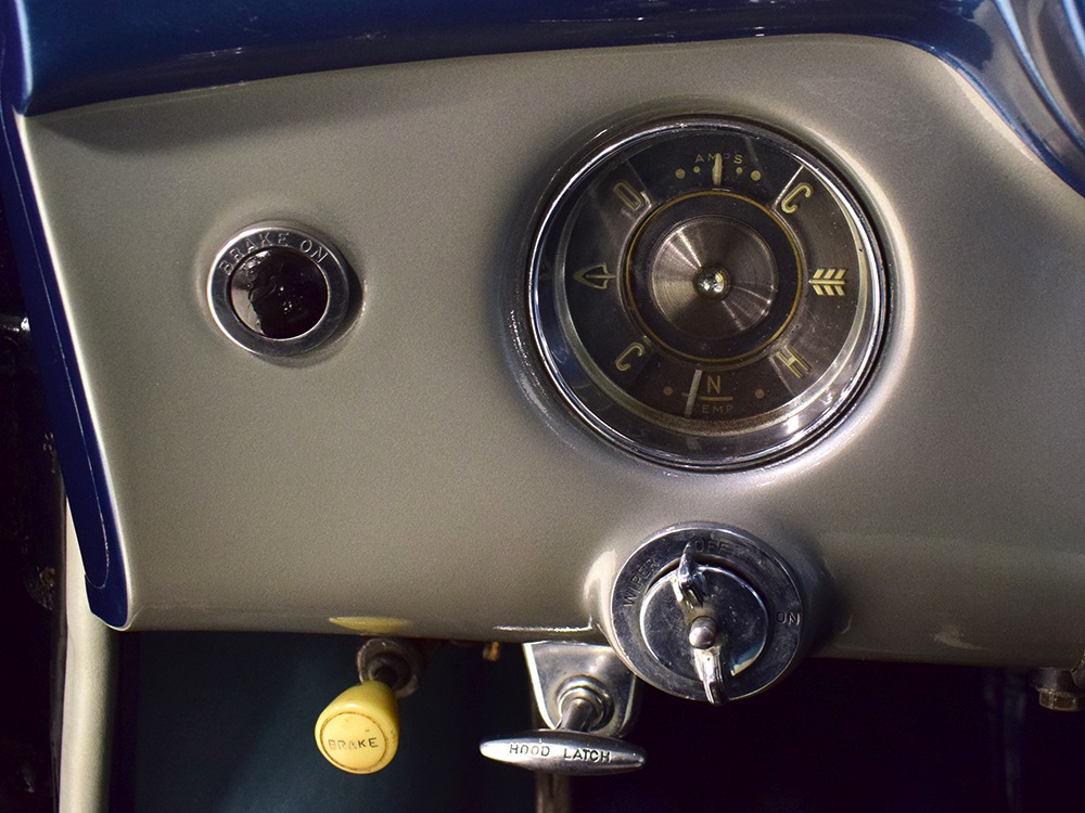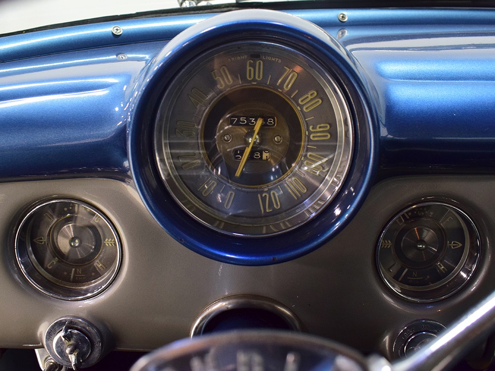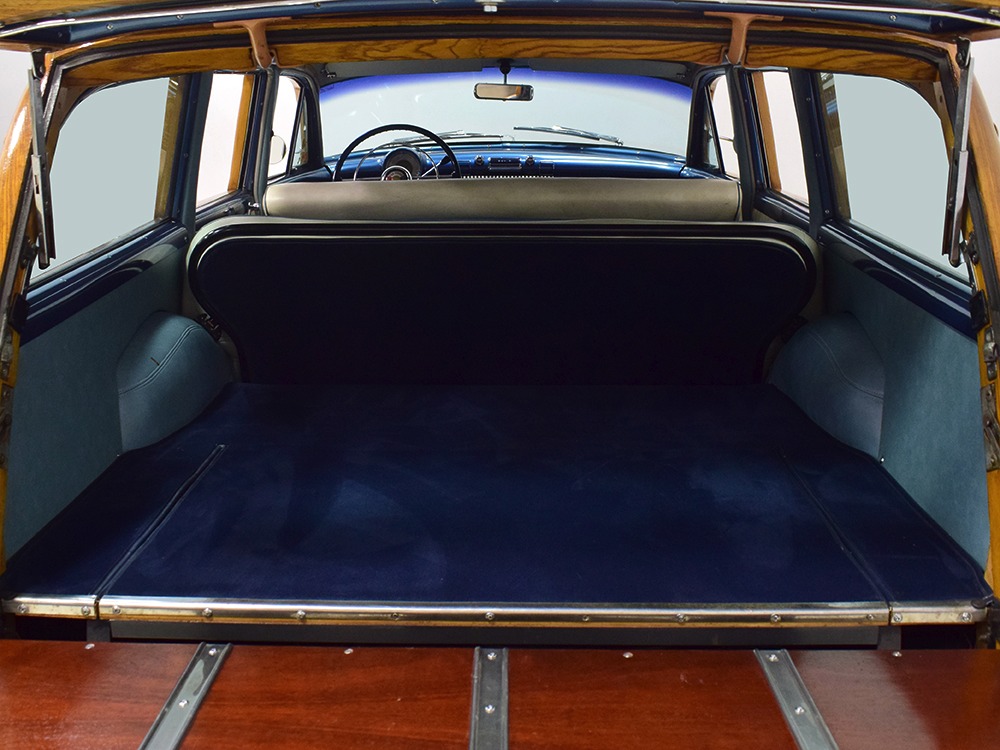 As with the exterior, the interior was changed from green to blue, another factory-correct combination that works quite well with the dark Imperial Blue bodywork. Everything that you can see or touch was restored or replaced during the restoration, and the rear carpets were just replaced this year so they’re as-new. The two-tone dash is stylish and should look familiar to Buick fans, with the speedometer front and center and the auxiliary dials flanking the steering column. All the gauges are fully operational except the clock, which is typical, and we strongly believe the 75,358 miles showing on the odometer are a correct, authentic reading. The original signal-seeking Sonomatic AM radio is sadly not operational, but everything else works like it should: lights, signals, heater, defroster, and even the emergency brake warning light glows brightly and I will personally vouch for the heater’s efficacy as we took it for a test drive on a rather brisk December morning (you can see the ride and drive video here: https://www.youtube.com/watch?v=9V8sjRVL4y4). Upholstery is correct throughout and the steering wheel is unique to the ‘53s and includes a 50th anniversary emblem on the horn button, which matches the one on the front bumper. There’s plenty of wood highlighting the interior, including the gorgeous tailgate, which is just a work of art. Lift the floor panel and you’ll find a full-sized spare tire and jack assembly underneath.