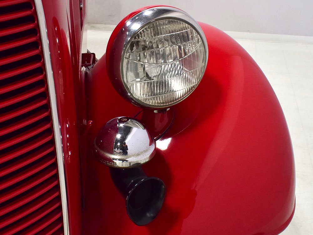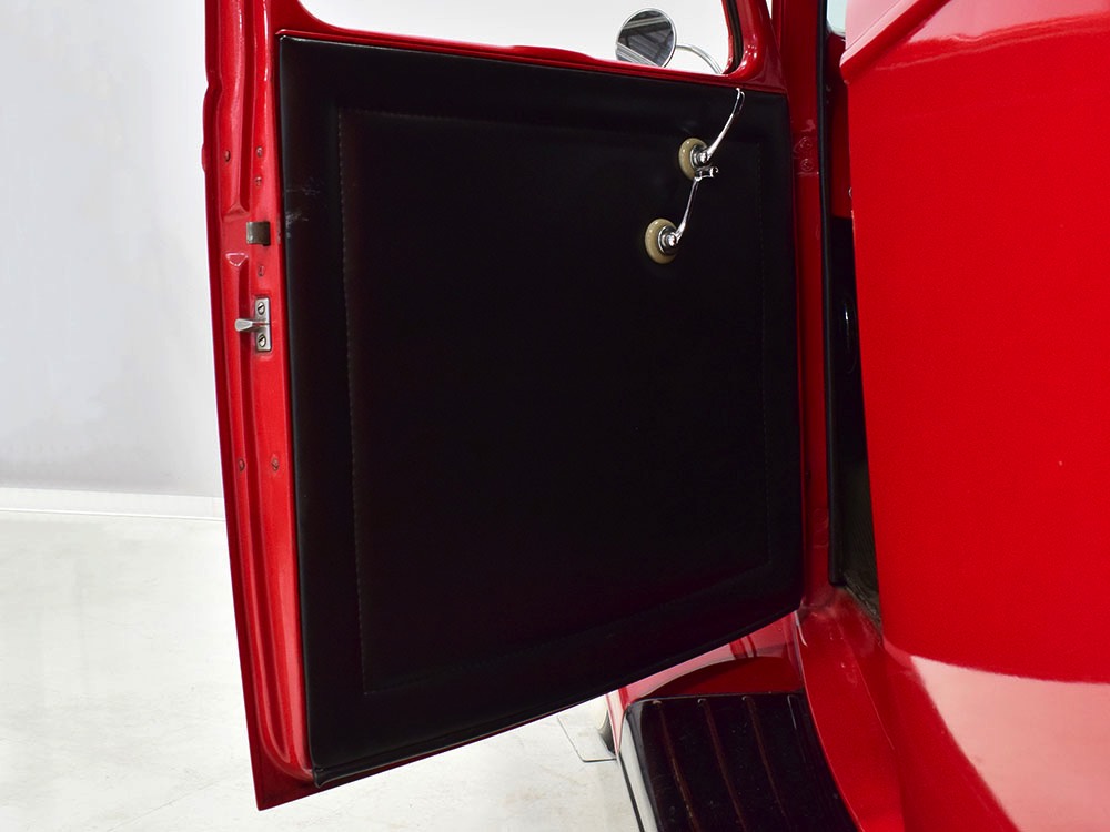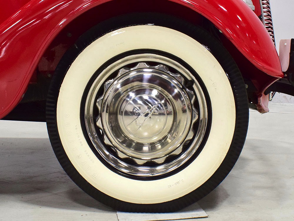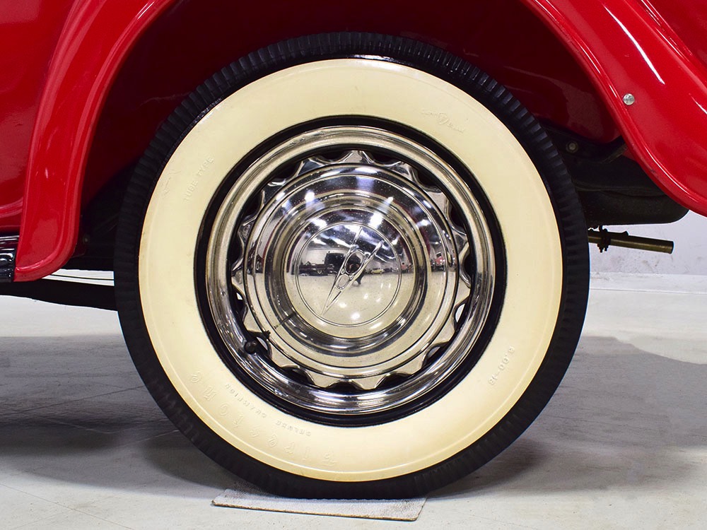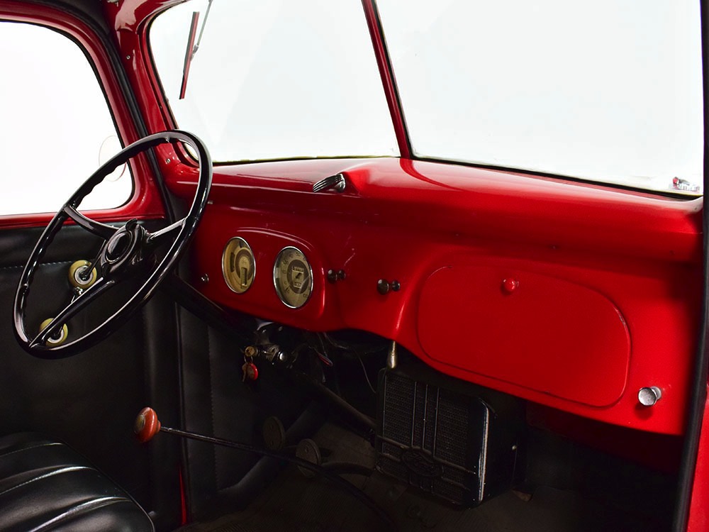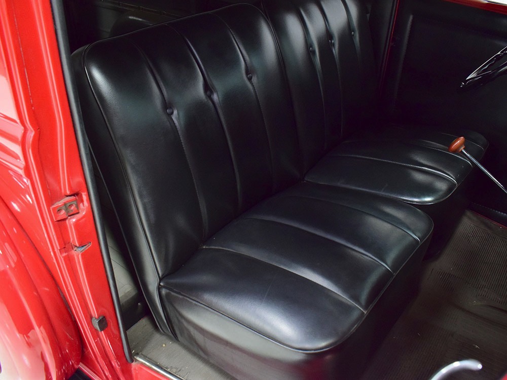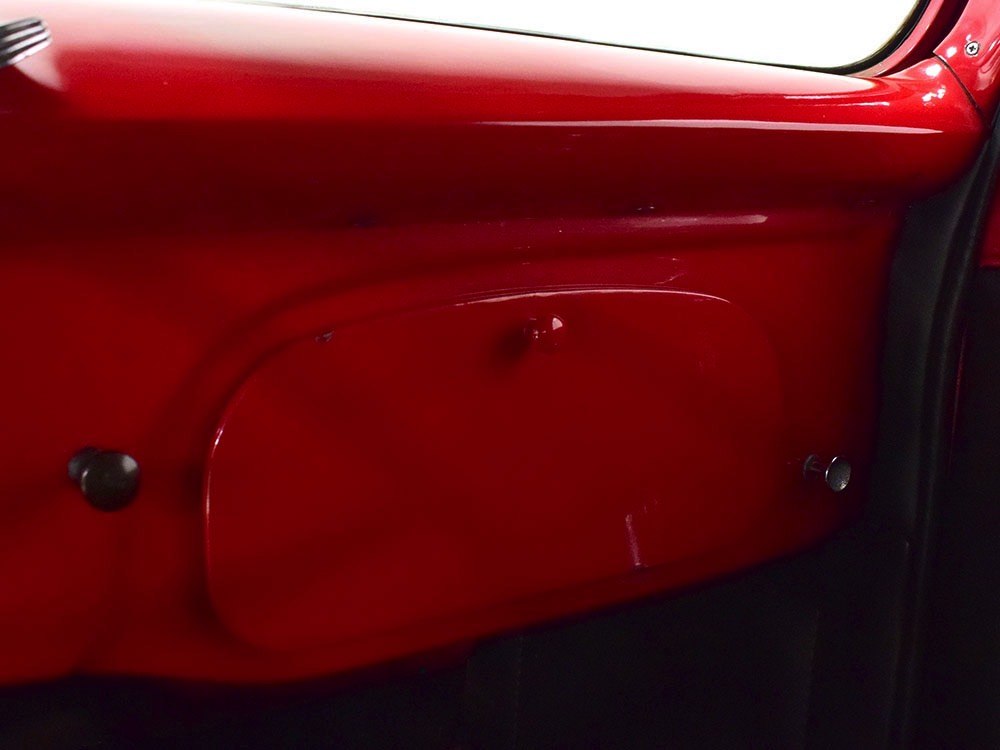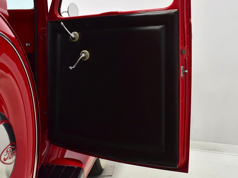 Although panel trucks were the workhorses of the ‘30s, Ford only built about 7800 panel deliveries like this bright red truck. The 1937 trucks were heavily redesigned with a new grille, bumpers, and hood to further distinguish them from their automotive siblings, although they maintain many car-like features. The proportions are excellent, showing that an artist was at work in the redesign, not just an engineer interested in maximizing practicality. The big barrel-shaped grill still echoes Ford design, as do the headlights and twin horns, but it’s more substantial and fits the bigger delivery bodywork. Beautiful details include the ornate body moldings and built-in side-mounted spare tire with a matching metal cover—nice! The bright red livery with hand-painted lettering is how it has looked from Day One, and while Henry Ford himself didn’t much care for red paint, it sure looks good here! We believe the mileage of 28,615 is authentic (it was only doing local deliveries, after all) and as a result the body never really had much of a chance to get rusty or banged up. We do have extensive restoration photos, but none show any serious metal work or body rot, so it feels surprisingly tight and solid even today. Sure, there are signs of use and age after 25 years of show duty, but it still presents extremely well and we find it almost irresistible sitting here in the showroom. Add in a few chrome details, including the optional rear bumper, add some sparkle and we love the Ford Blue ’85’ emblems (representing 85 horsepower) on the hood and the single industrial-style rear taillight, and you get one of the prettiest commercial vehicles we’ve seen in a long time.