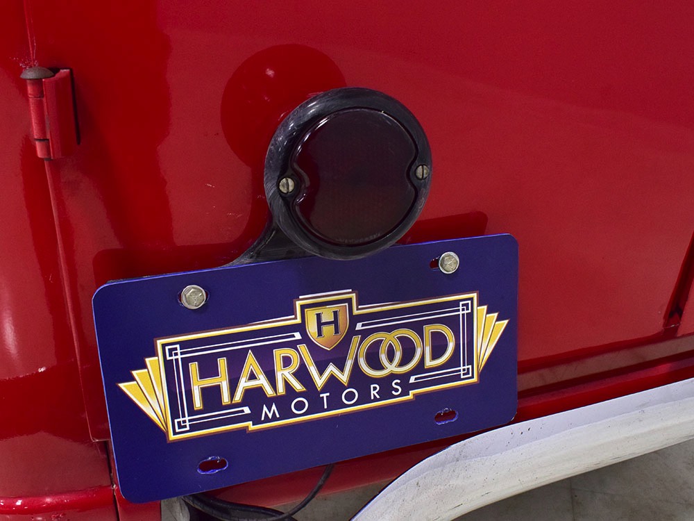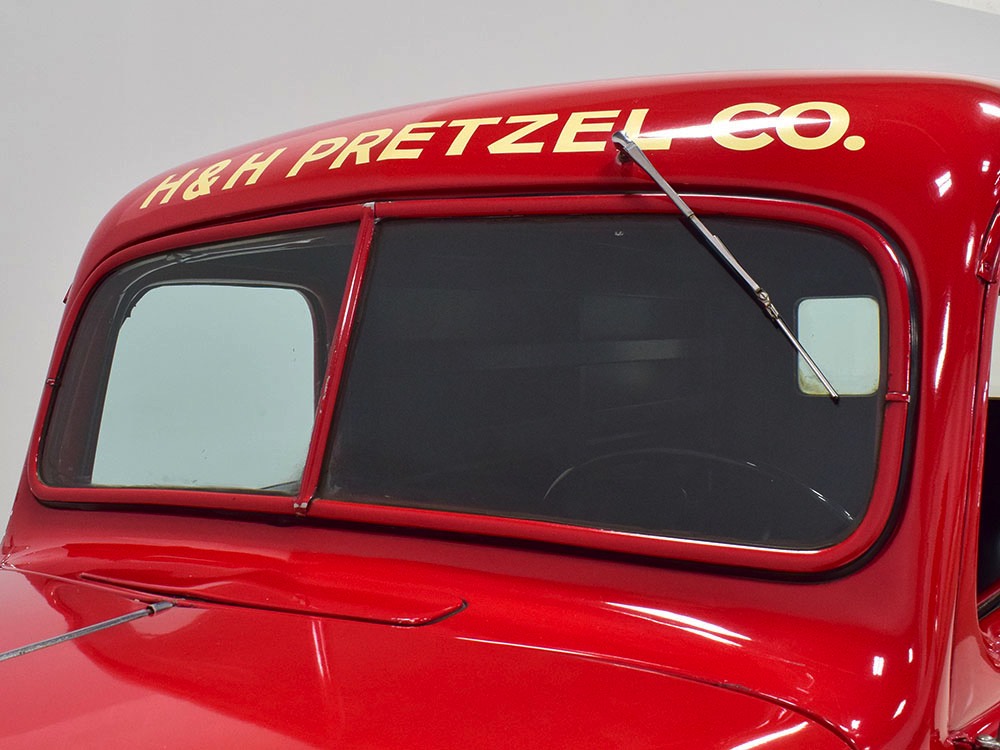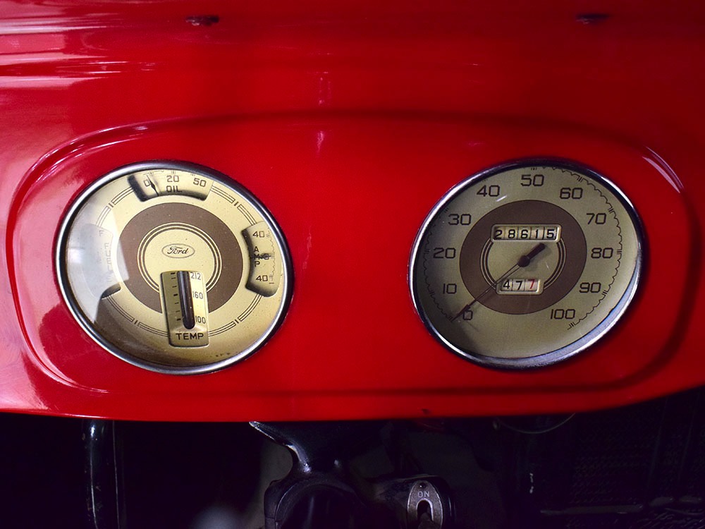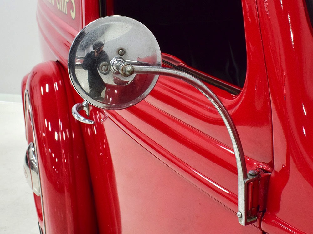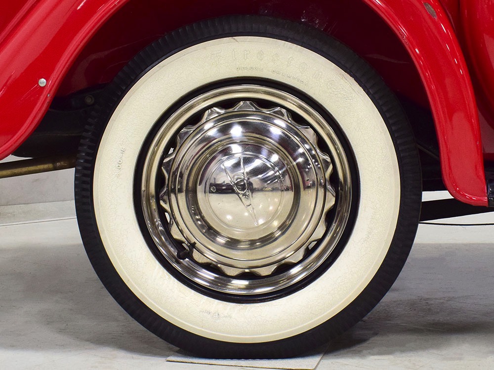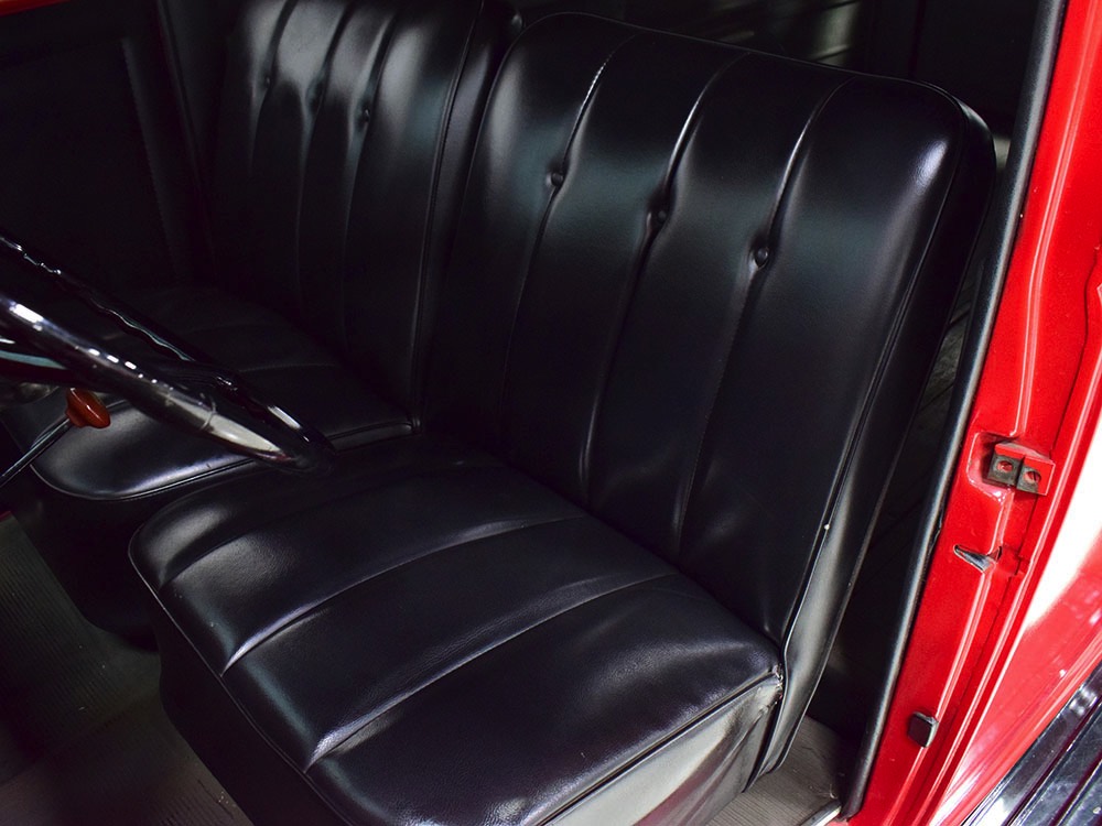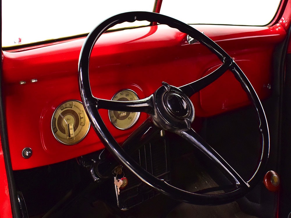 Although panel trucks were the workhorses of the ‘30s, Ford only built about 7800 panel deliveries like this bright red truck. The 1937 trucks were heavily redesigned with a new grille, bumpers, and hood to further distinguish them from their automotive siblings, although they maintain many car-like features. The proportions are excellent, showing that an artist was at work in the redesign, not just an engineer interested in maximizing practicality. The big barrel-shaped grill still echoes Ford design, as do the headlights and twin horns, but it’s more substantial and fits the bigger delivery bodywork. Beautiful details include the ornate body moldings and built-in side-mounted spare tire with a matching metal cover—nice! The bright red livery with hand-painted lettering is how it has looked from Day One, and while Henry Ford himself didn’t much care for red paint, it sure looks good here! We believe the mileage of 28,615 is authentic (it was only doing local deliveries, after all) and as a result the body never really had much of a chance to get rusty or banged up. We do have extensive restoration photos, but none show any serious metal work or body rot, so it feels surprisingly tight and solid even today. Sure, there are signs of use and age after 25 years of show duty, but it still presents extremely well and we find it almost irresistible sitting here in the showroom. Add in a few chrome details, including the optional rear bumper, add some sparkle and we love the Ford Blue ’85’ emblems (representing 85 horsepower) on the hood and the single industrial-style rear taillight, and you get one of the prettiest commercial vehicles we’ve seen in a long time.