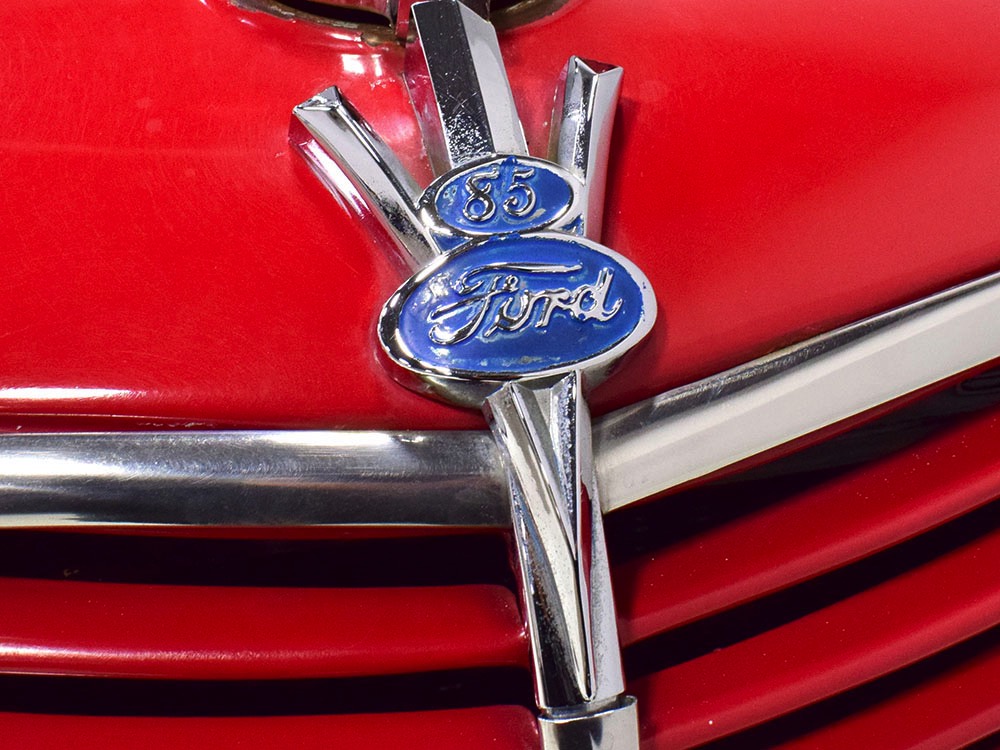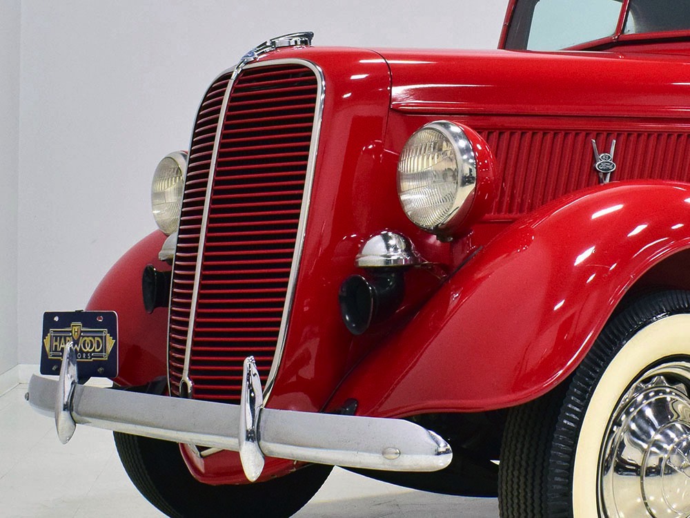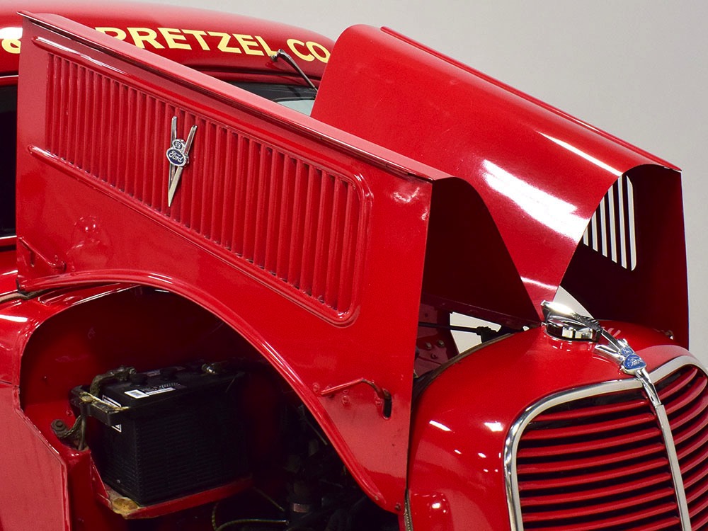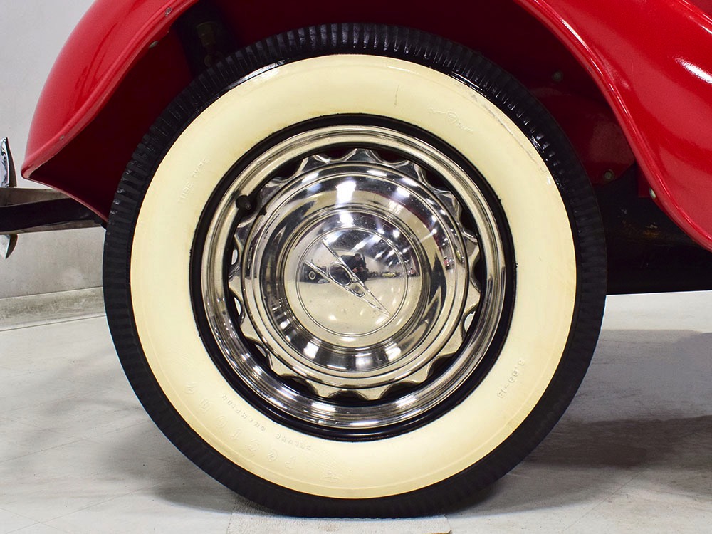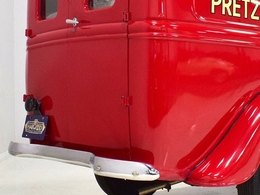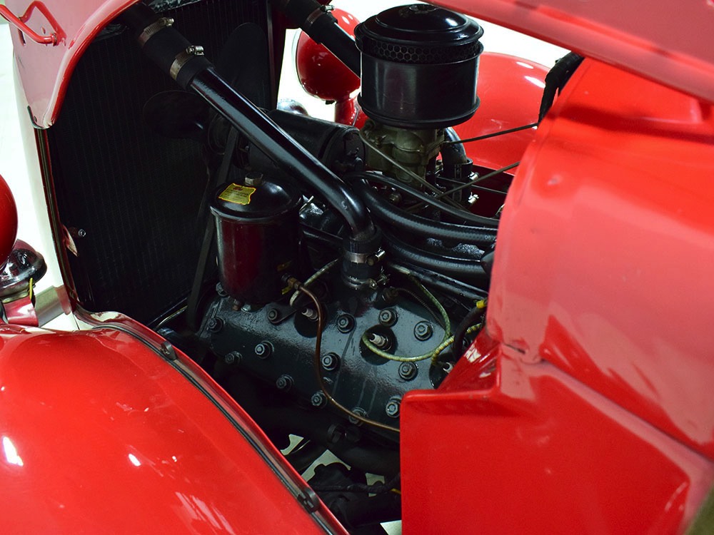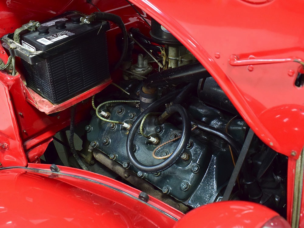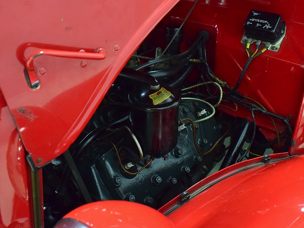Although panel trucks were the workhorses of the ‘30s, Ford only built about 7800 panel deliveries like this bright red truck. The 1937 trucks were heavily redesigned with a new grille, bumpers, and hood to further distinguish them from their automotive siblings, although they maintain many car-like features. The proportions are excellent, showing that an artist was at work in the redesign, not just an engineer interested in maximizing practicality. The big barrel-shaped grill still echoes Ford design, as do the headlights and twin horns, but it’s more substantial and fits the bigger delivery bodywork. Beautiful details include the ornate body moldings and built-in side-mounted spare tire with a matching metal cover—nice! The bright red livery with hand-painted lettering is how it has looked from Day One, and while Henry Ford himself didn’t much care for red paint, it sure looks good here! We believe the mileage of 28,615 is authentic (it was only doing local deliveries, after all) and as a result the body never really had much of a chance to get rusty or banged up. We do have extensive restoration photos, but none show any serious metal work or body rot, so it feels surprisingly tight and solid even today. Sure, there are signs of use and age after 25 years of show duty, but it still presents extremely well and we find it almost irresistible sitting here in the showroom. Add in a few chrome details, including the optional rear bumper, add some sparkle and we love the Ford Blue ’85’ emblems (representing 85 horsepower) on the hood and the single industrial-style rear taillight, and you get one of the prettiest commercial vehicles we’ve seen in a long time.