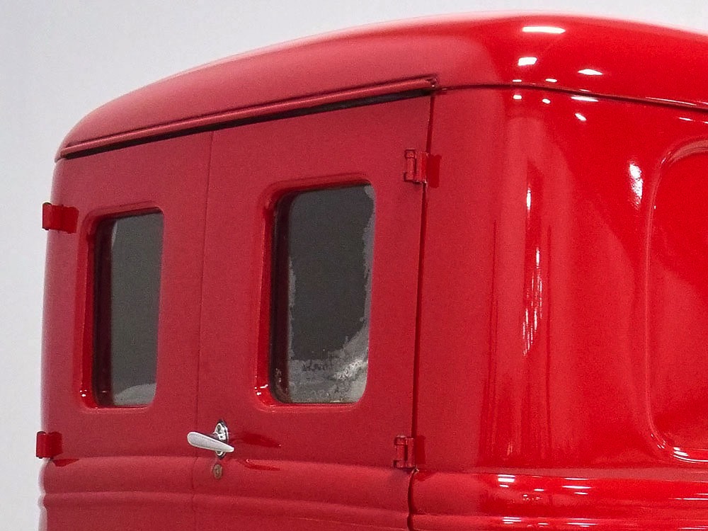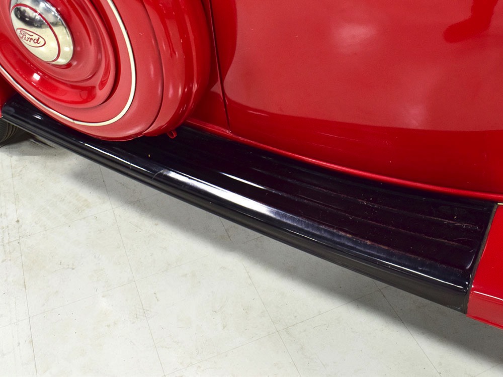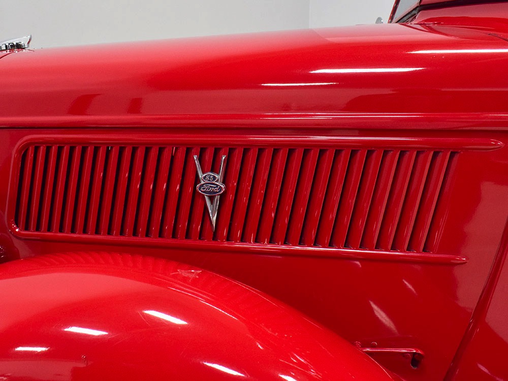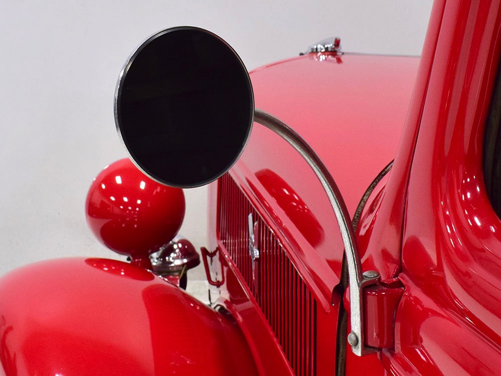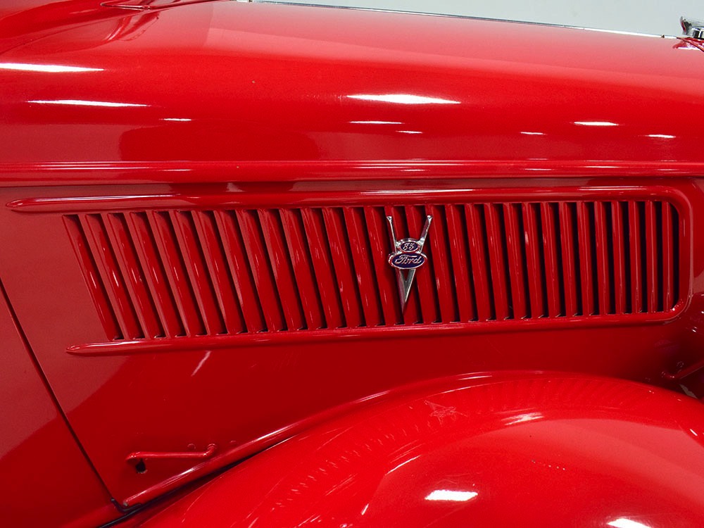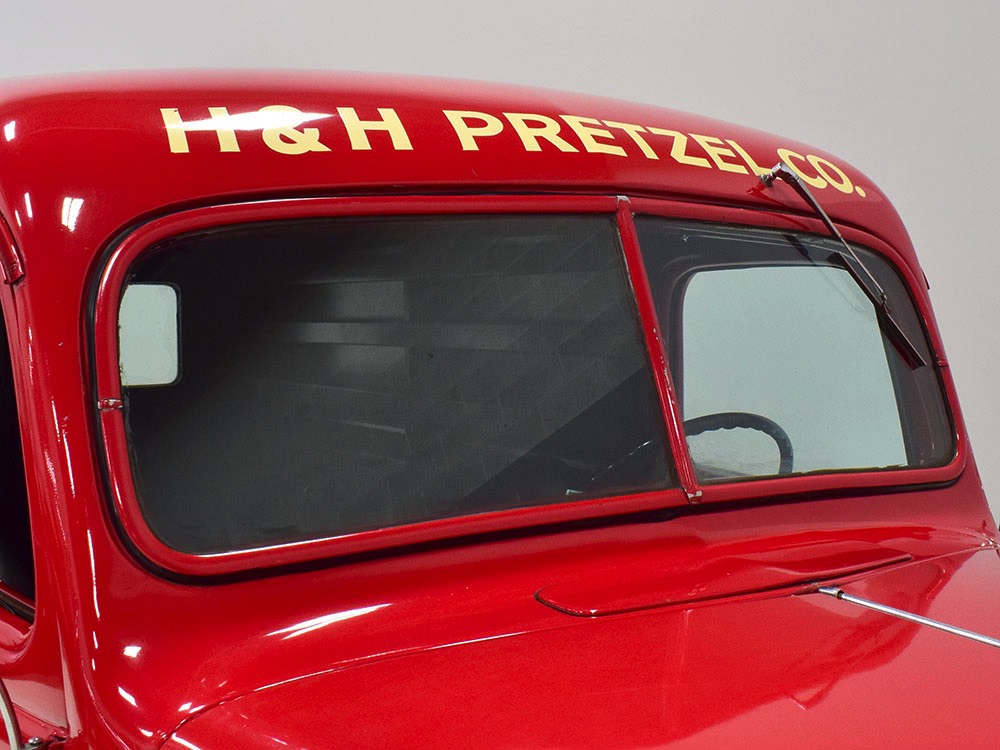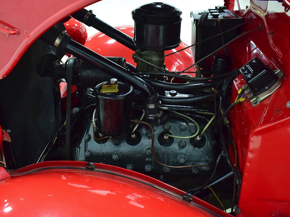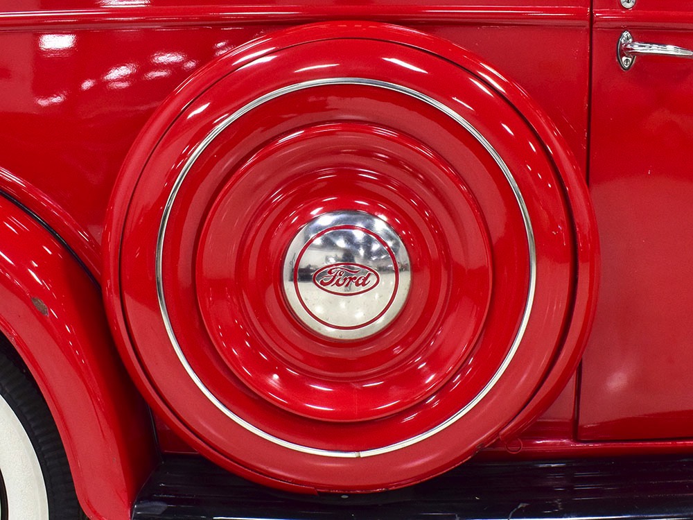 Although panel trucks were the workhorses of the ‘30s, Ford only built about 7800 panel deliveries like this bright red truck. The 1937 trucks were heavily redesigned with a new grille, bumpers, and hood to further distinguish them from their automotive siblings, although they maintain many car-like features. The proportions are excellent, showing that an artist was at work in the redesign, not just an engineer interested in maximizing practicality. The big barrel-shaped grill still echoes Ford design, as do the headlights and twin horns, but it’s more substantial and fits the bigger delivery bodywork. Beautiful details include the ornate body moldings and built-in side-mounted spare tire with a matching metal cover—nice! The bright red livery with hand-painted lettering is how it has looked from Day One, and while Henry Ford himself didn’t much care for red paint, it sure looks good here! We believe the mileage of 28,615 is authentic (it was only doing local deliveries, after all) and as a result the body never really had much of a chance to get rusty or banged up. We do have extensive restoration photos, but none show any serious metal work or body rot, so it feels surprisingly tight and solid even today. Sure, there are signs of use and age after 25 years of show duty, but it still presents extremely well and we find it almost irresistible sitting here in the showroom. Add in a few chrome details, including the optional rear bumper, add some sparkle and we love the Ford Blue ’85’ emblems (representing 85 horsepower) on the hood and the single industrial-style rear taillight, and you get one of the prettiest commercial vehicles we’ve seen in a long time.