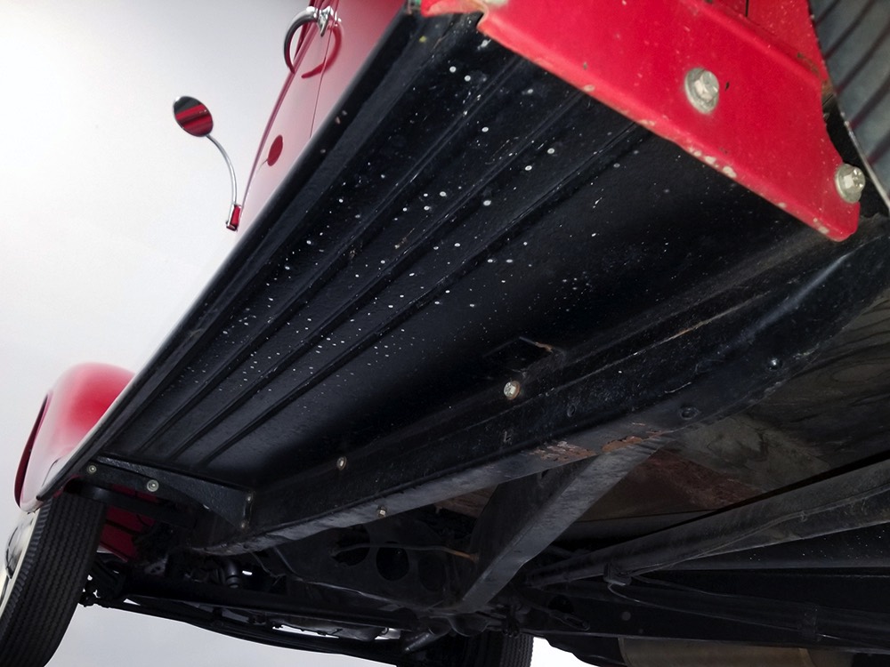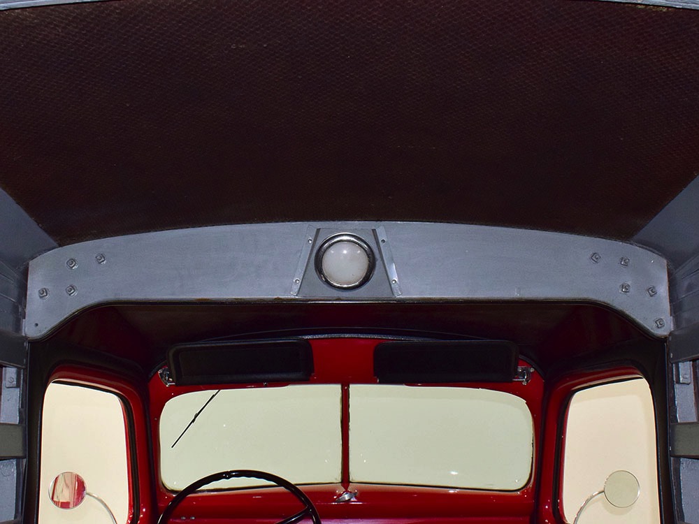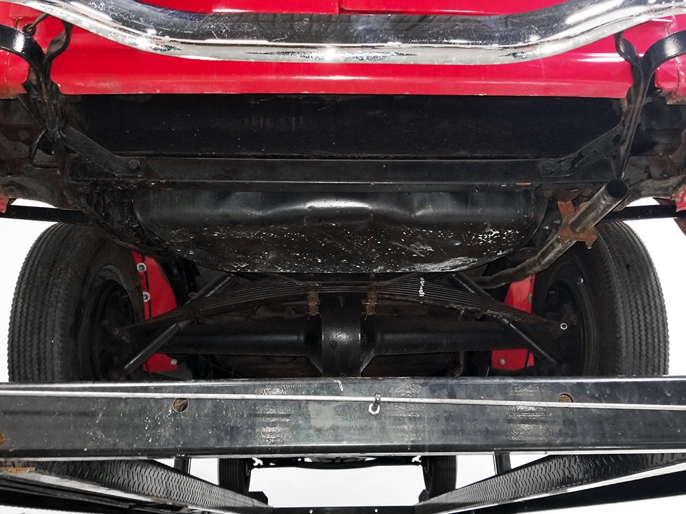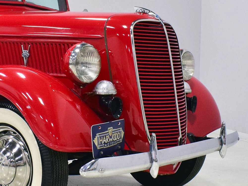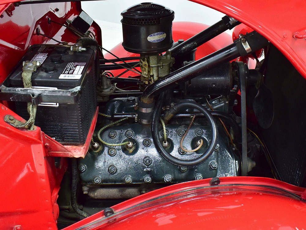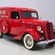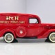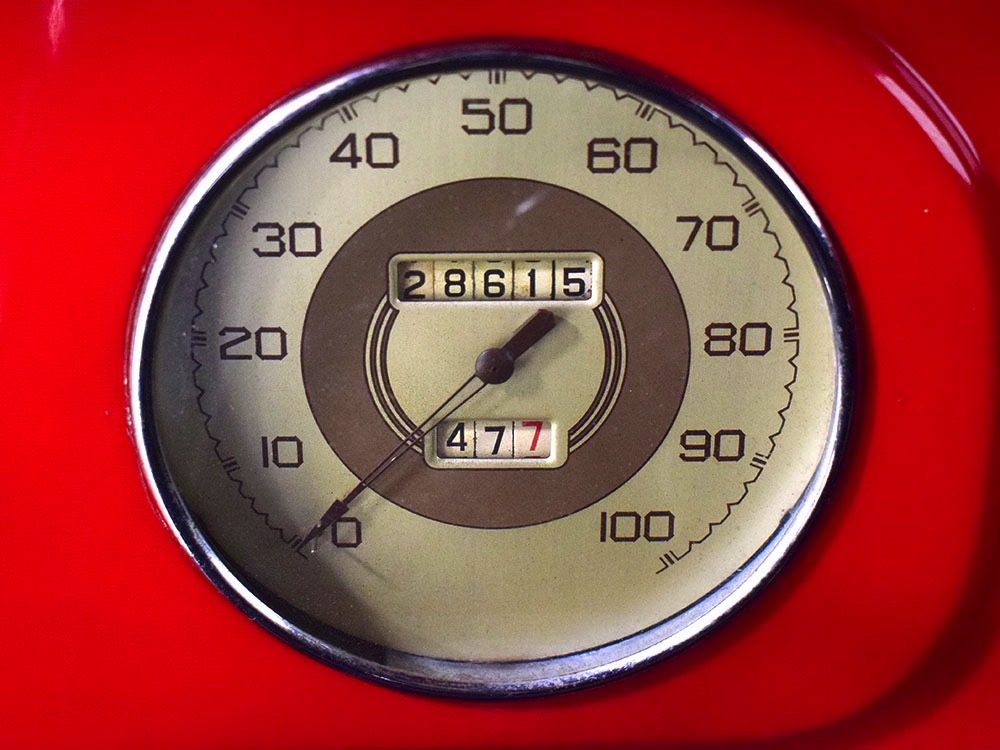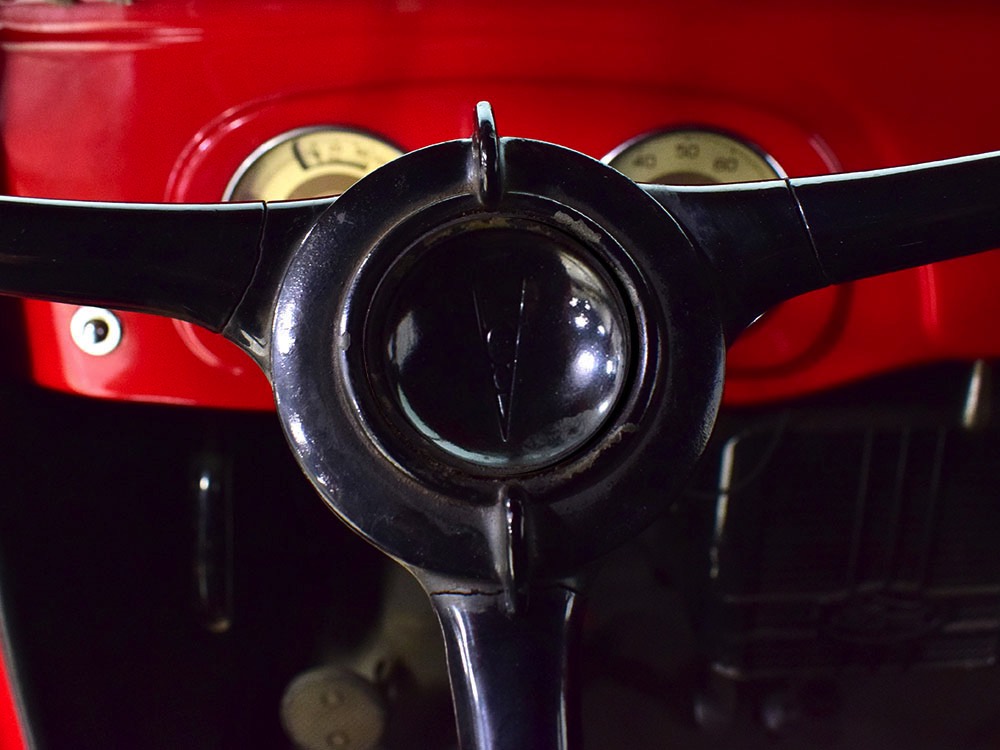 Although panel trucks were the workhorses of the ‘30s, Ford only built about 7800 panel deliveries like this bright red truck. The 1937 trucks were heavily redesigned with a new grille, bumpers, and hood to further distinguish them from their automotive siblings, although they maintain many car-like features. The proportions are excellent, showing that an artist was at work in the redesign, not just an engineer interested in maximizing practicality. The big barrel-shaped grill still echoes Ford design, as do the headlights and twin horns, but it’s more substantial and fits the bigger delivery bodywork. Beautiful details include the ornate body moldings and built-in side-mounted spare tire with a matching metal cover—nice! The bright red livery with hand-painted lettering is how it has looked from Day One, and while Henry Ford himself didn’t much care for red paint, it sure looks good here! We believe the mileage of 28,615 is authentic (it was only doing local deliveries, after all) and as a result the body never really had much of a chance to get rusty or banged up. We do have extensive restoration photos, but none show any serious metal work or body rot, so it feels surprisingly tight and solid even today. Sure, there are signs of use and age after 25 years of show duty, but it still presents extremely well and we find it almost irresistible sitting here in the showroom. Add in a few chrome details, including the optional rear bumper, add some sparkle and we love the Ford Blue ’85’ emblems (representing 85 horsepower) on the hood and the single industrial-style rear taillight, and you get one of the prettiest commercial vehicles we’ve seen in a long time.