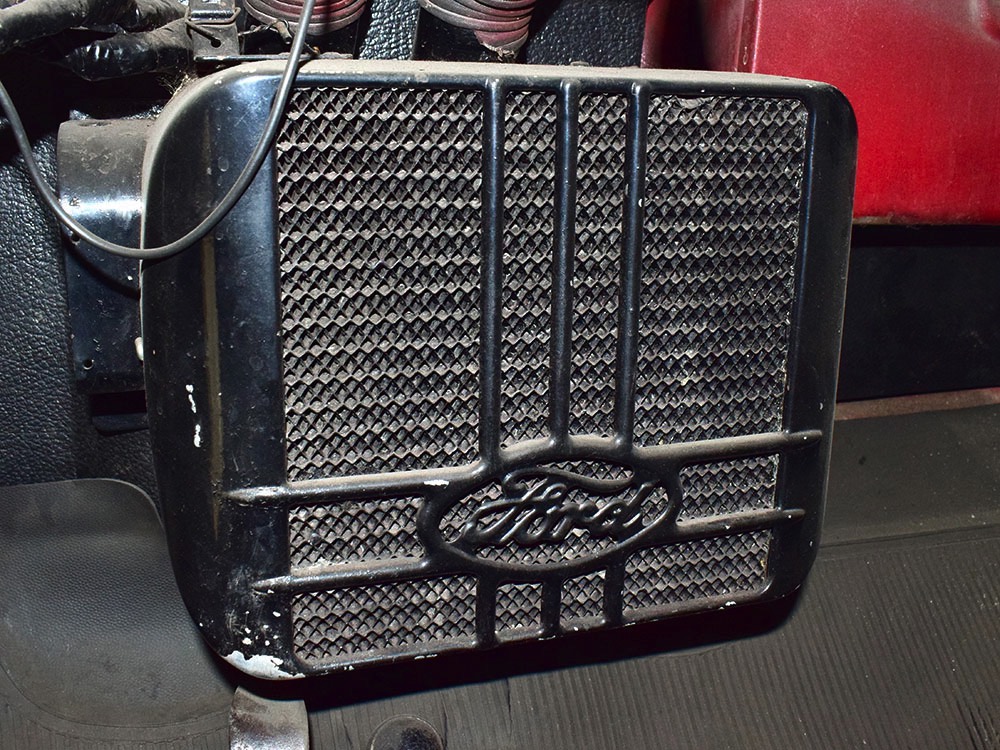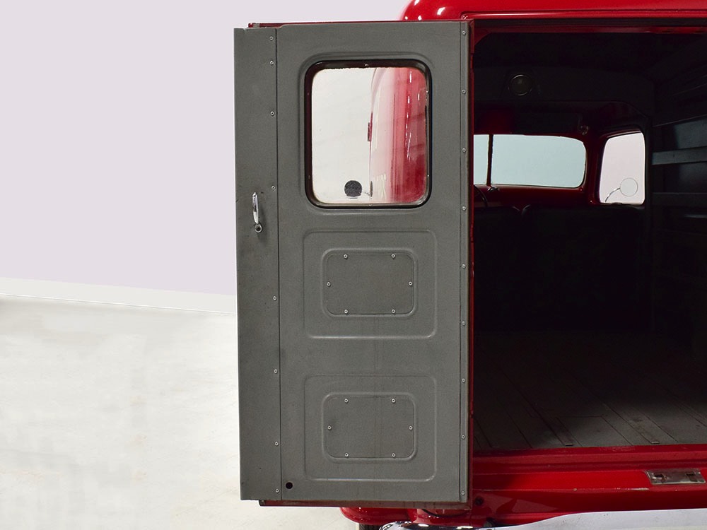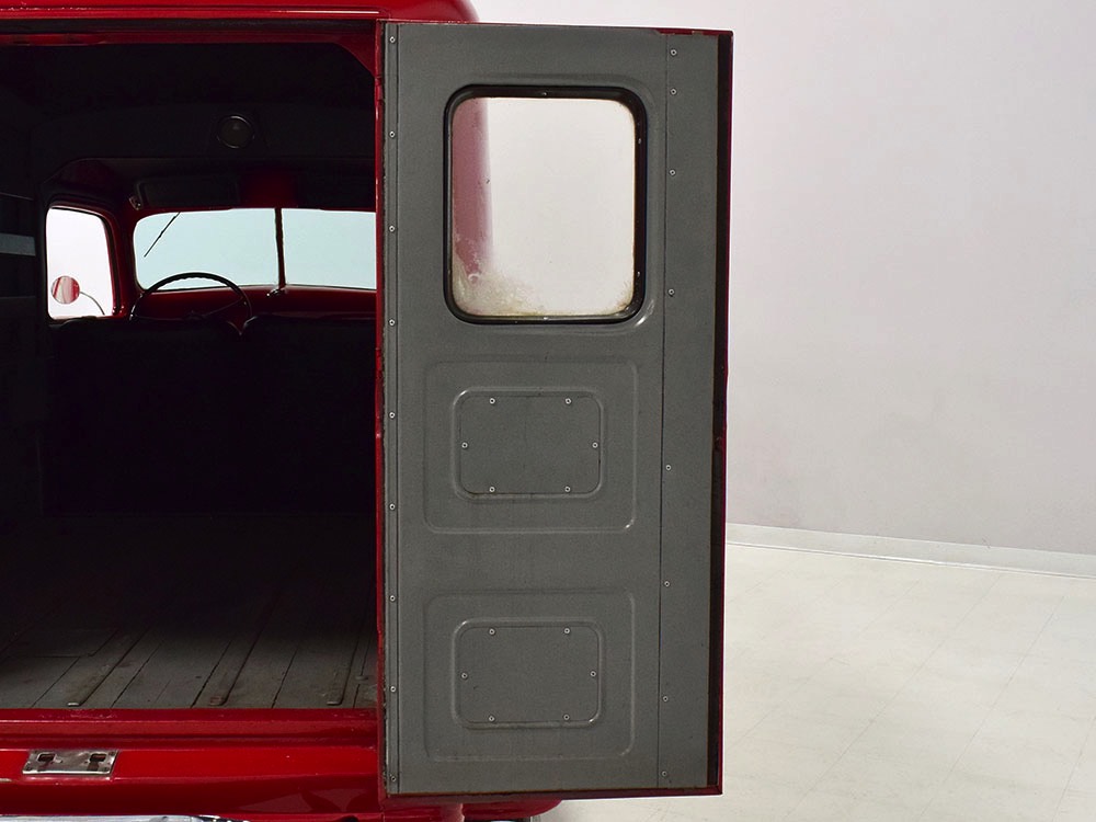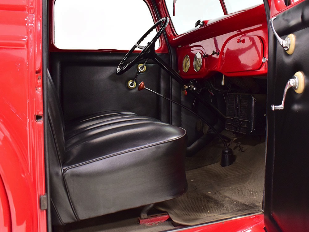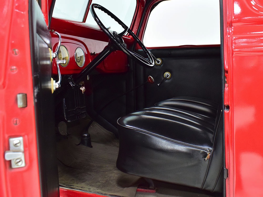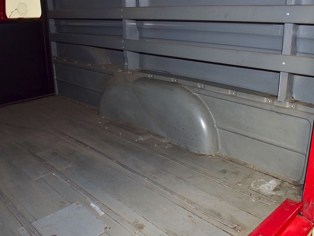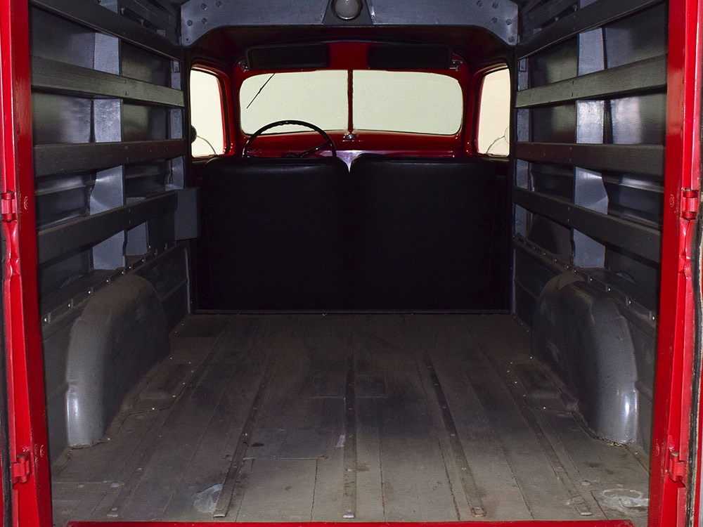 No surprise that the interior is spartan, but this truck thankfully carries two bucket seats so it’s not just a single-passenger machine. Take a friend along! The seat covers and door panels are durable black vinyl that’s in great shape, and aside from a small tear in the driver’s lower cushion on the side, it’s almost unmarked. Beautiful cream-faced gauges are framed by a big three-spoke steering wheel and there’s an accessory heater under the dash, ideal for chilly winter deliveries. Controls are familiar, with a 3-speed manual transmission, headlight controls on the steering wheel hub, and the starter button way over there on the left. The windshield cranks open for ventilation, and there’s a cowl vent to assist, so the truck stays cool and breezy on warm days. There’s also a correct rubber mat on the floor so it’s very low maintenance. The cargo bay is obviously built to do a job, but it hasn’t been bashed or beat up and the overhead cargo light works correctly.