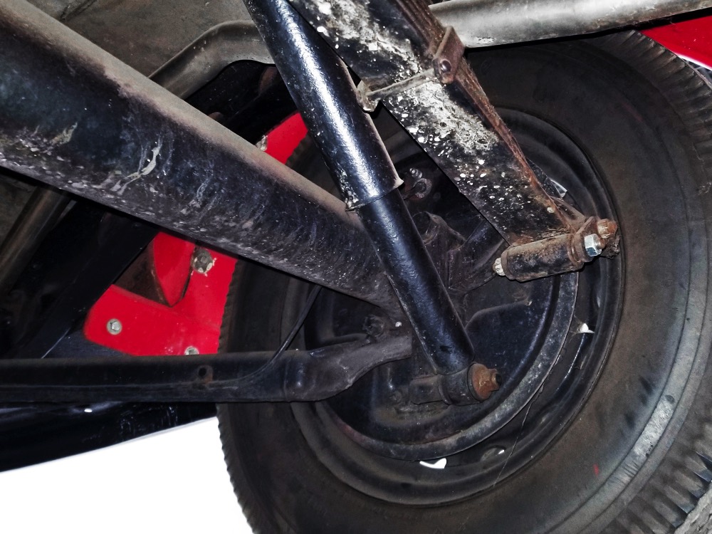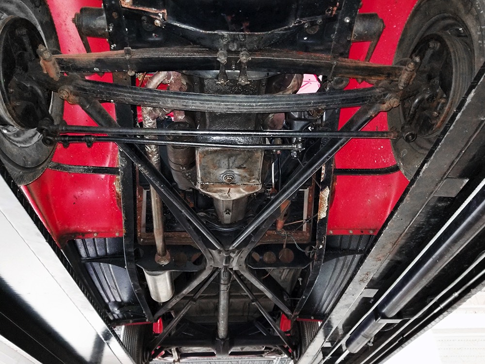 We don’t believe the restoration involved removing the body from the chassis, but it remains clean and solid underneath with no issues that need attention. Sure, there’s some surface rust on some of the heavy metal parts and a bit of grime on the working bits, but since most of the floors are wood, rot is a non-issue. You will note that the brakes have been upgraded to hydraulic operation using period components, including a master cylinder mounted on the frame, so all of it looks like it would have back in the day. Transverse leaf springs were a Ford trademark until into the ‘50s, although this truck features tube shocks in back, which were standard equipment in 1937 and a real innovation. The transmission shifts easily, clutch take-up is smooth, and with 3.78 gears out back, it’s pretty comfortable at 50 MPH. There’s also a brand new stainless steel exhaust system that sounds right and will last forever. Gorgeous artillery wheels with chrome “spider” hubcaps and 6.00-16 Firestone wide whitewalls really make this panel truck sparkle.