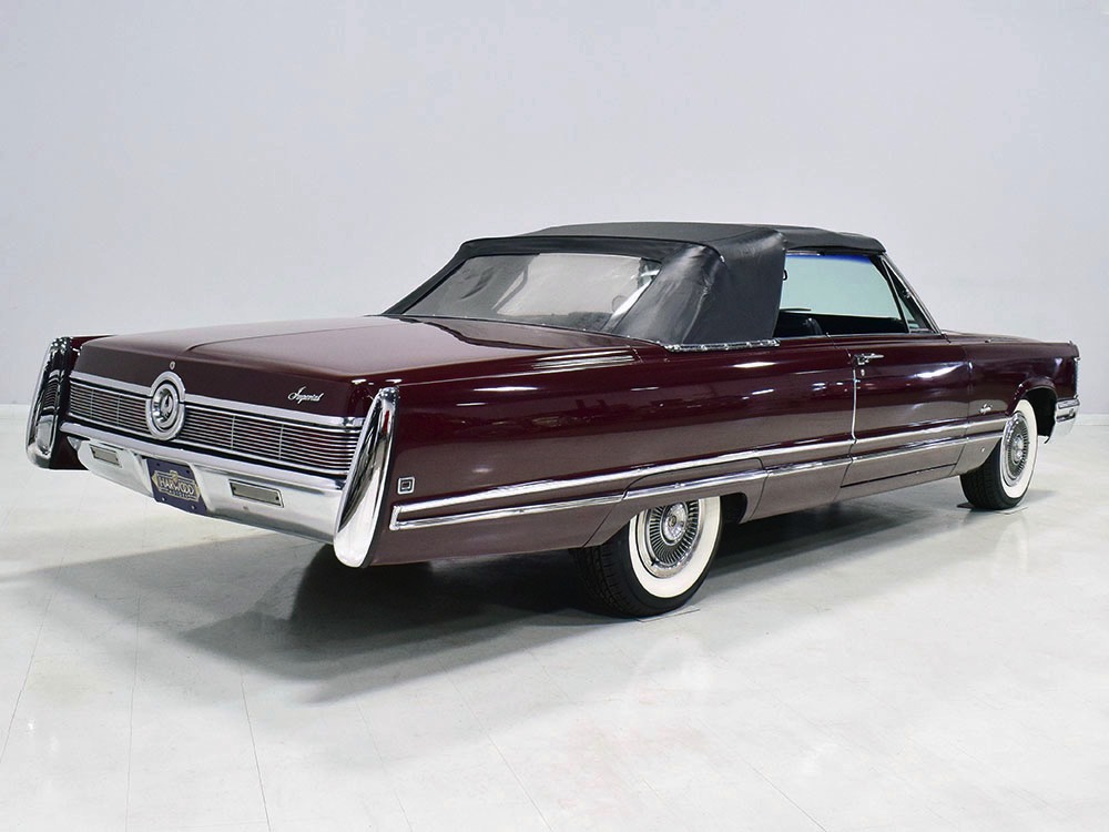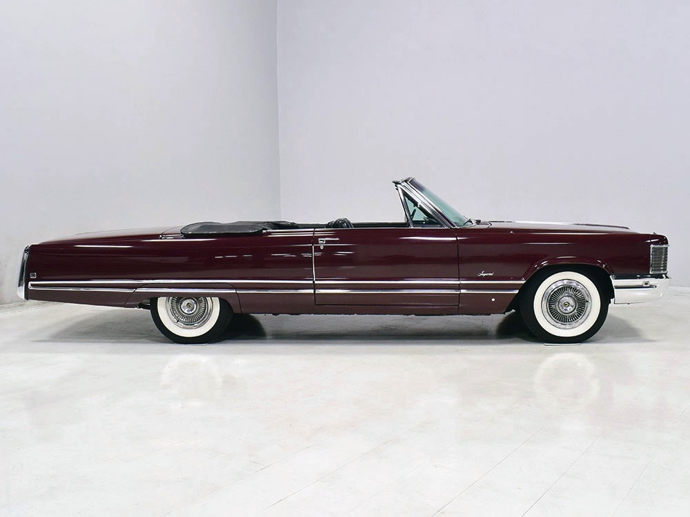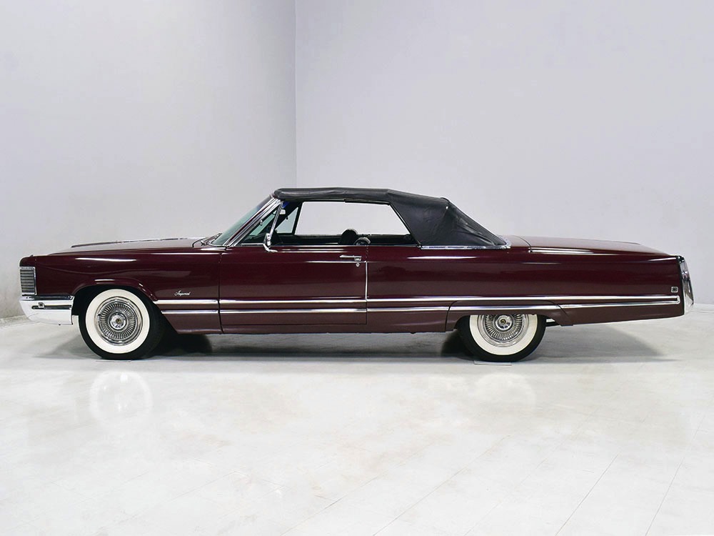This particular Imperial Crown convertible is a one-owner car from a significant collection. Yes, it was purchased new as a daily driver, but by the early ‘70s it had already been retired, replaced by a new Cadillac, and it was used as a fair-weather toy after that. It has never been fully restored or refinished, although it has been freshened as needed—a paint job in the early 1990s, new upholstery on the front seats, recent exhaust, shocks, and tires, new carburetor, rebuilt A/C system, and most importantly, a fully rebuilt engine and transmission that were finished in 2015 by noted engine builder Frank Seme and Sons. If you want a heavy cruiser that’s ready for a road trip adventure, you’ll scarcely do better than this.