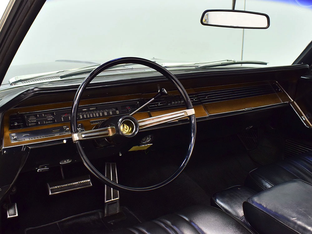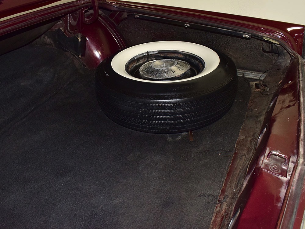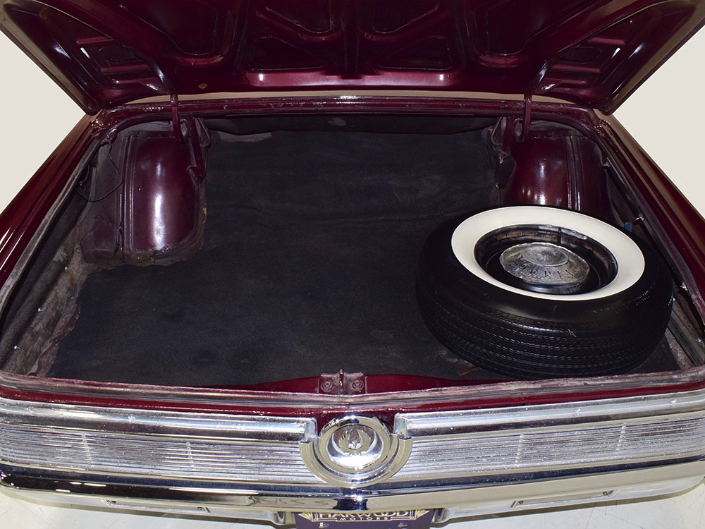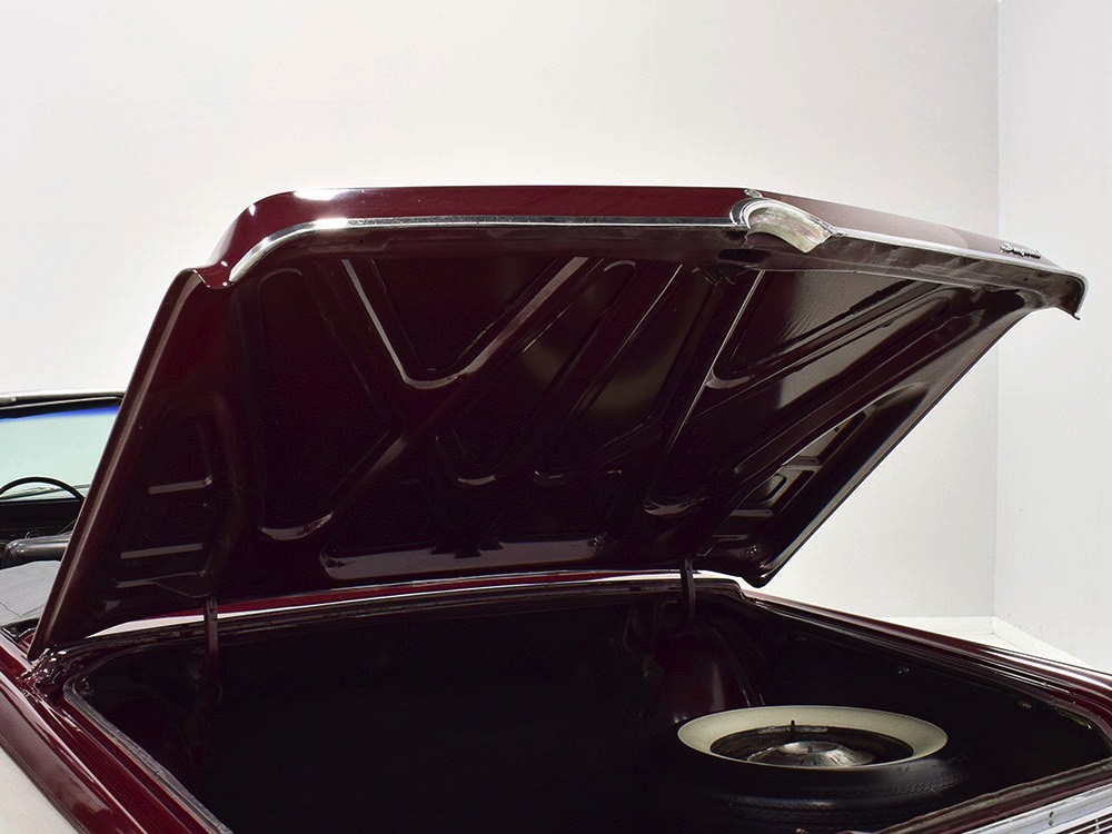 The black leather interior features a split bench that resembles bucket seats, giving the Imperial a bit of a sporting flavor that its competitors might have been lacking. It was also beautifully outfitted in black leather with real wood panel on the dash and a long list of comfort and convenience features. The wide dash is a beautiful piece of ‘60s design that accentuates straight lines and minimal ornamentation, so much so that even the AM/FM radio is hidden under a matching door in the center of the dash. Features include functional A/C, power windows, power seats, and a fairly comprehensive array of gauges for the driver. That skinny steering wheel is a beautiful work of Mopar art and it allows you to guide the car with little more than a fingertip in traditional American luxury fashion. Of note, the front seat upholstery was replaced a few years ago, and they accurately replicated the factory patterns and style, so it blends right in. The back seat, which was seldom used, remains original and in very good condition with only moderate signs of age. Everything works except the power antenna and the clock, and a few years ago a fresh black power convertible top was installed, which folds easily into the well where it’s hidden by a matching black boot. The cavernous trunk offers enough space for all your luggage, as well as a full-sized spare tire and jack assembly, and no signs of rust issues underneath.