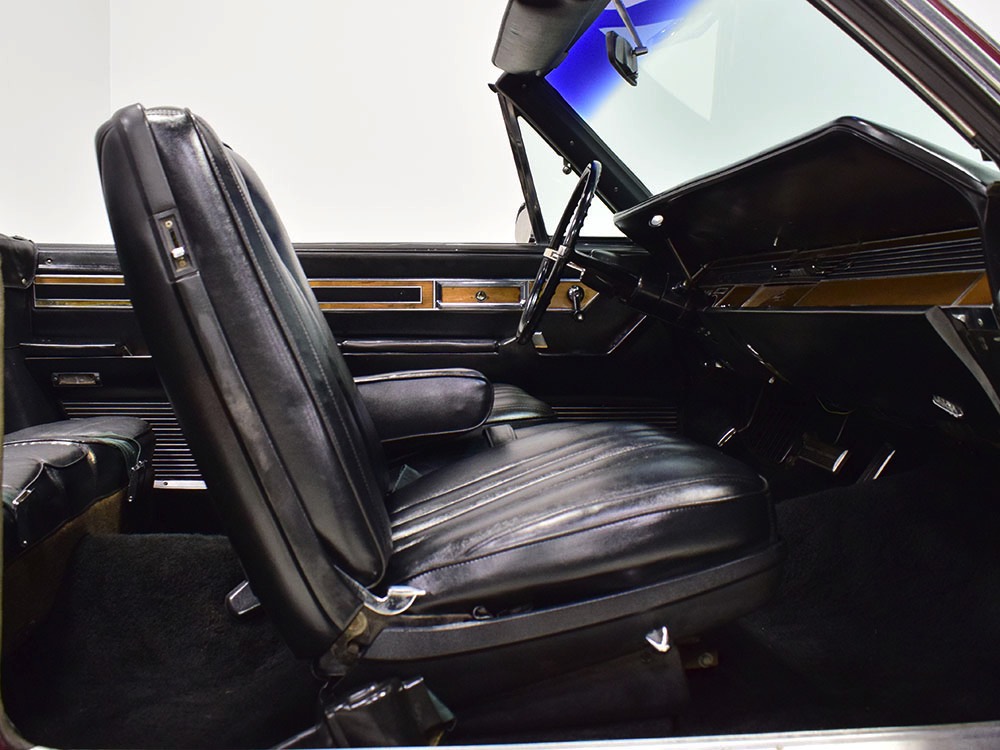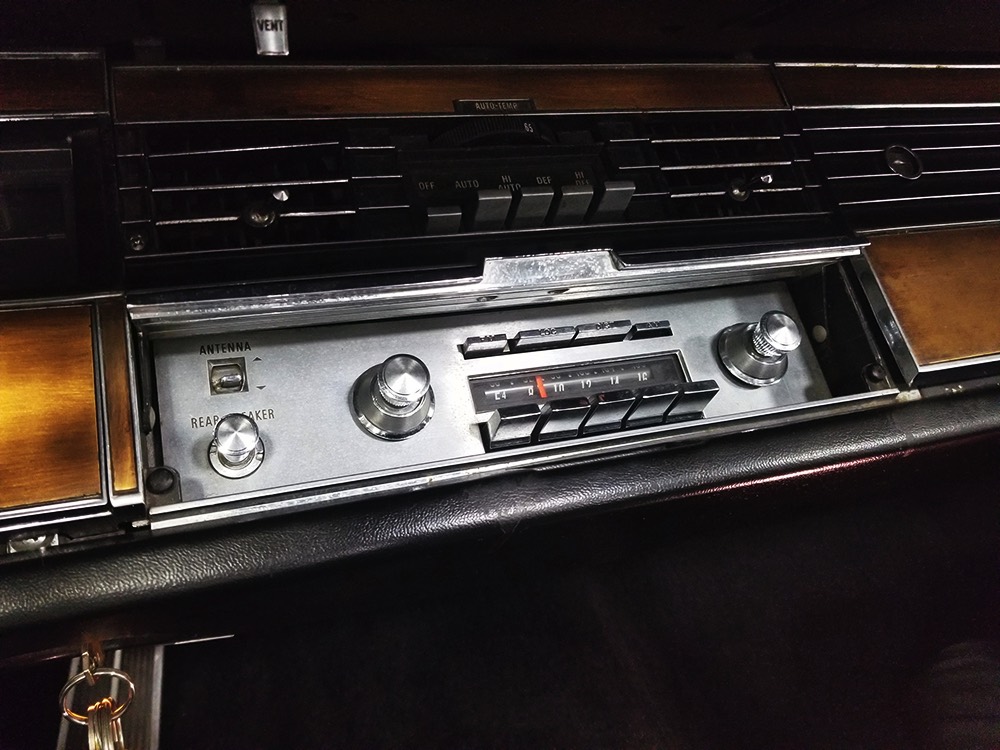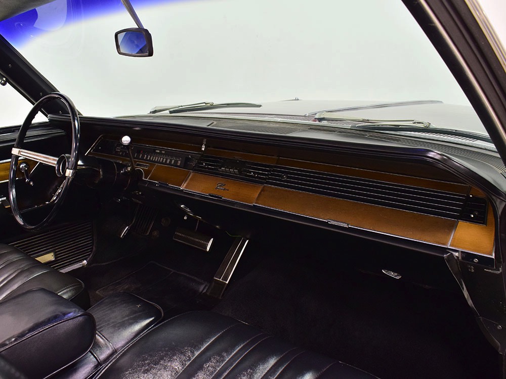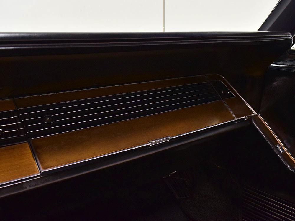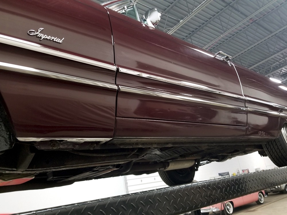 The black leather interior features a split bench that resembles bucket seats, giving the Imperial a bit of a sporting flavor that its competitors might have been lacking. It was also beautifully outfitted in black leather with real wood panel on the dash and a long list of comfort and convenience features. The wide dash is a beautiful piece of ‘60s design that accentuates straight lines and minimal ornamentation, so much so that even the AM/FM radio is hidden under a matching door in the center of the dash. Features include functional A/C, power windows, power seats, and a fairly comprehensive array of gauges for the driver. That skinny steering wheel is a beautiful work of Mopar art and it allows you to guide the car with little more than a fingertip in traditional American luxury fashion. Of note, the front seat upholstery was replaced a few years ago, and they accurately replicated the factory patterns and style, so it blends right in. The back seat, which was seldom used, remains original and in very good condition with only moderate signs of age. Everything works except the power antenna and the clock, and a few years ago a fresh black power convertible top was installed, which folds easily into the well where it’s hidden by a matching black boot. The cavernous trunk offers enough space for all your luggage, as well as a full-sized spare tire and jack assembly, and no signs of rust issues underneath.