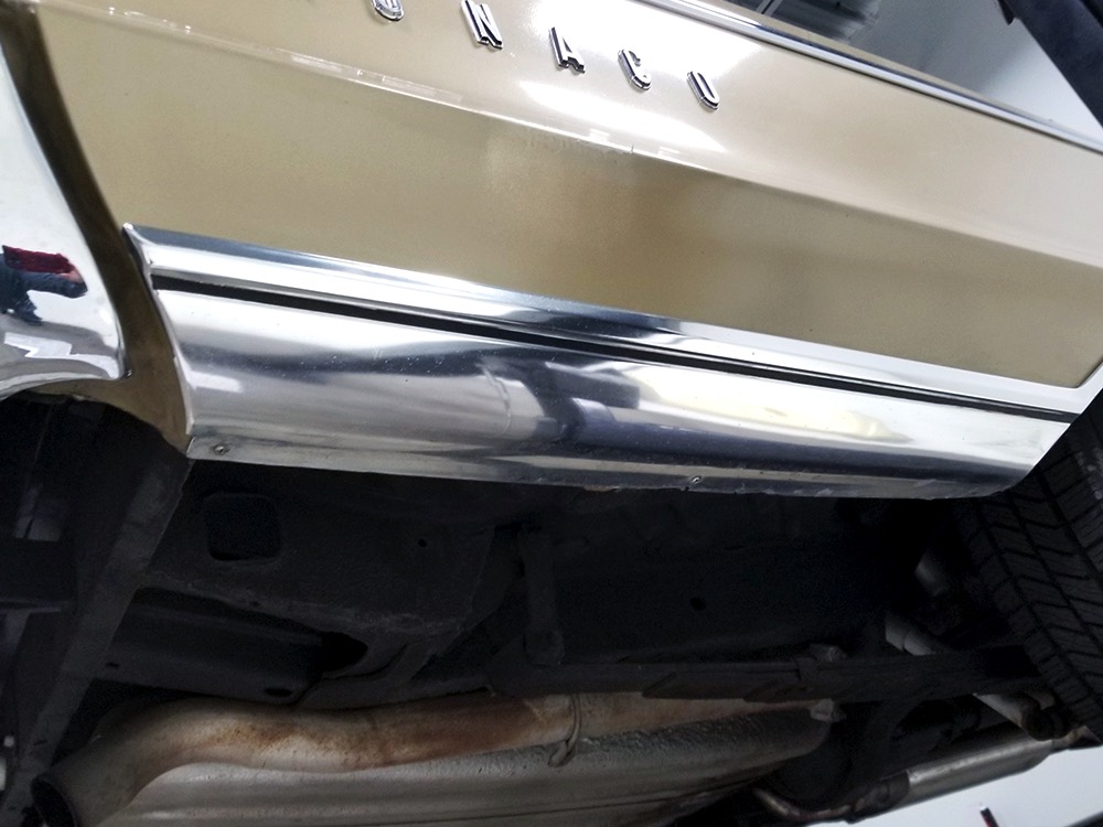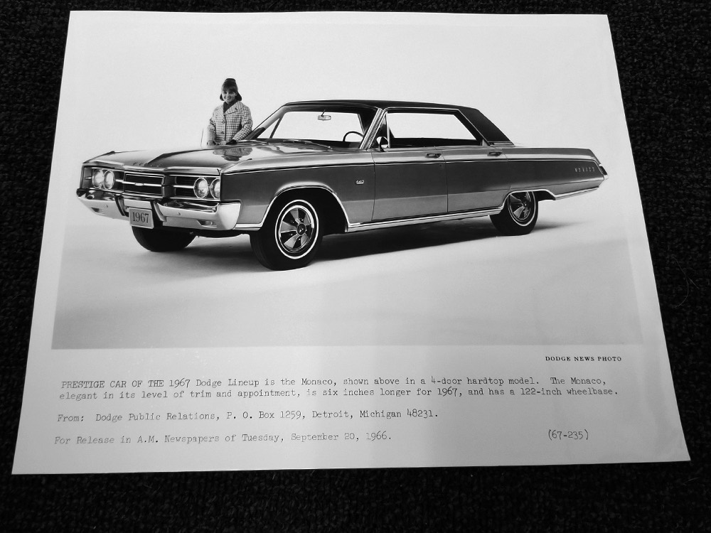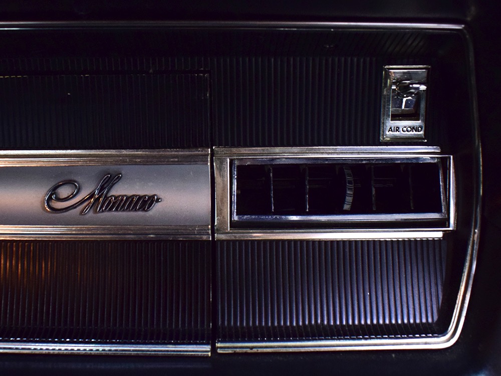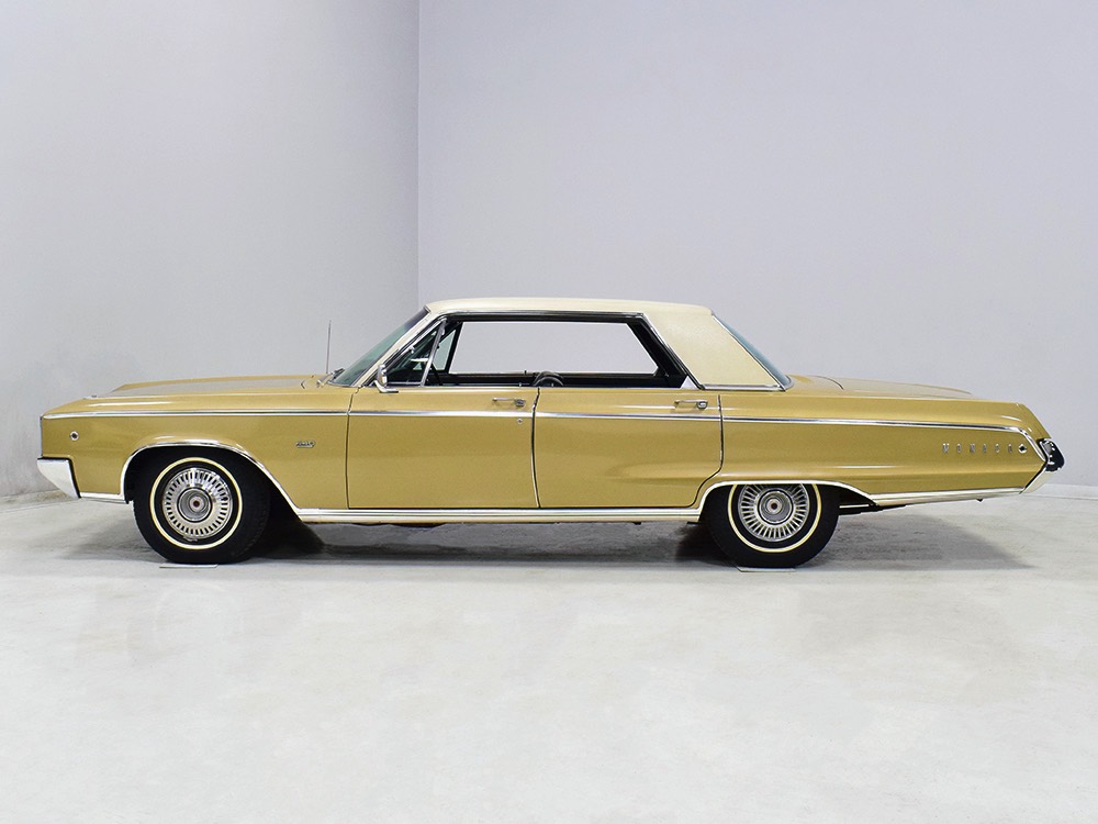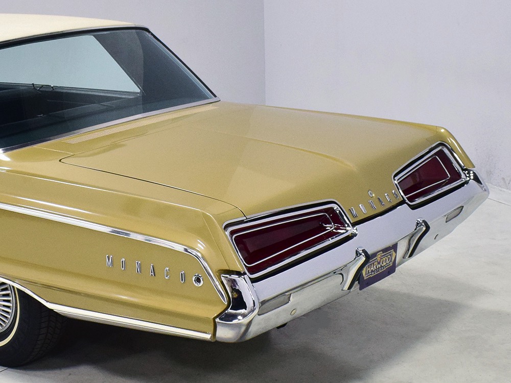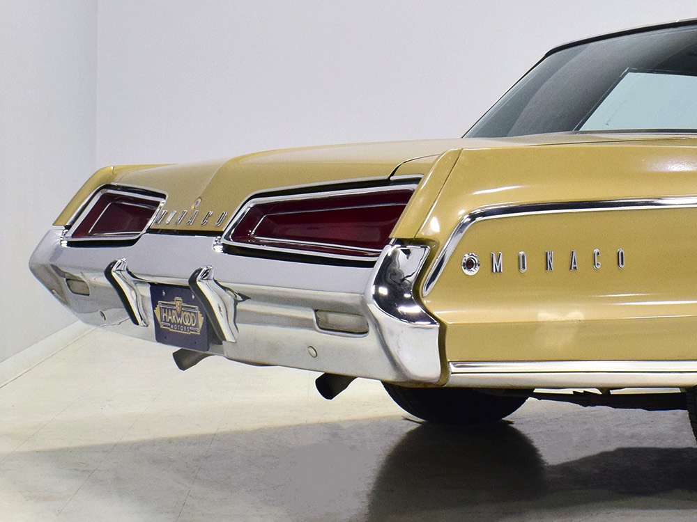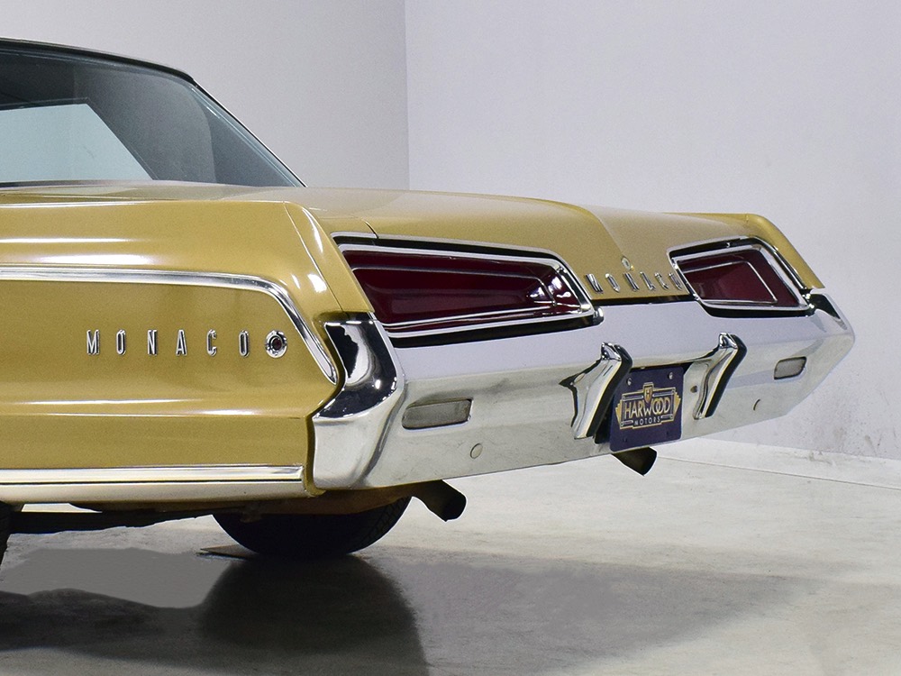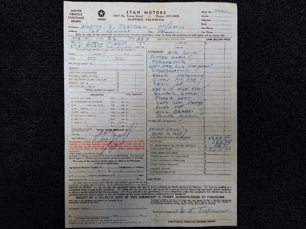 Other goodies on the original dealer order form include factory A/C (still cold), power windows, power front seat, an AM radio with rear speaker, power steering and power front disc brakes (proudly advertised on the hubcaps), Rallye suspension, bumper guards, tinted glass, and a driver’s remote mirror. All those options added up to $4213.84—a pretty good chunk of money in 1967 and about what a Chrysler New Yorker 4-door hardtop would have cost. Clearly Mr. Trefrew knew what he wanted: he wanted a Monaco and didn’t mind paying for it.