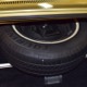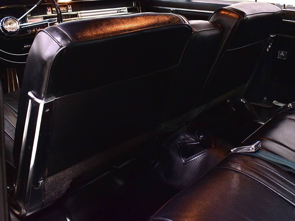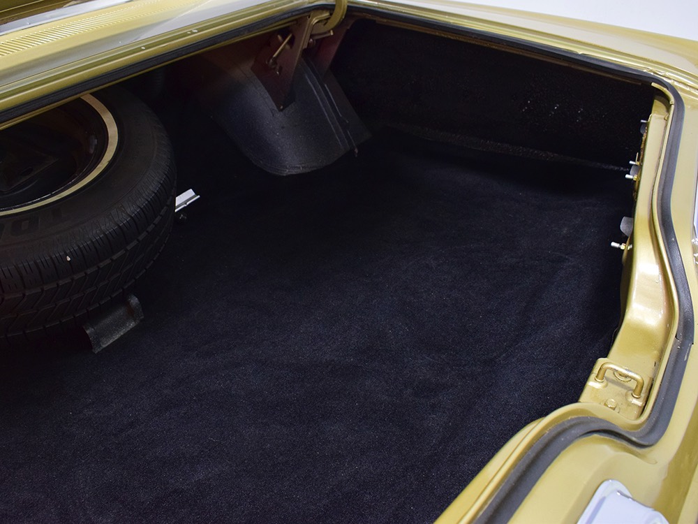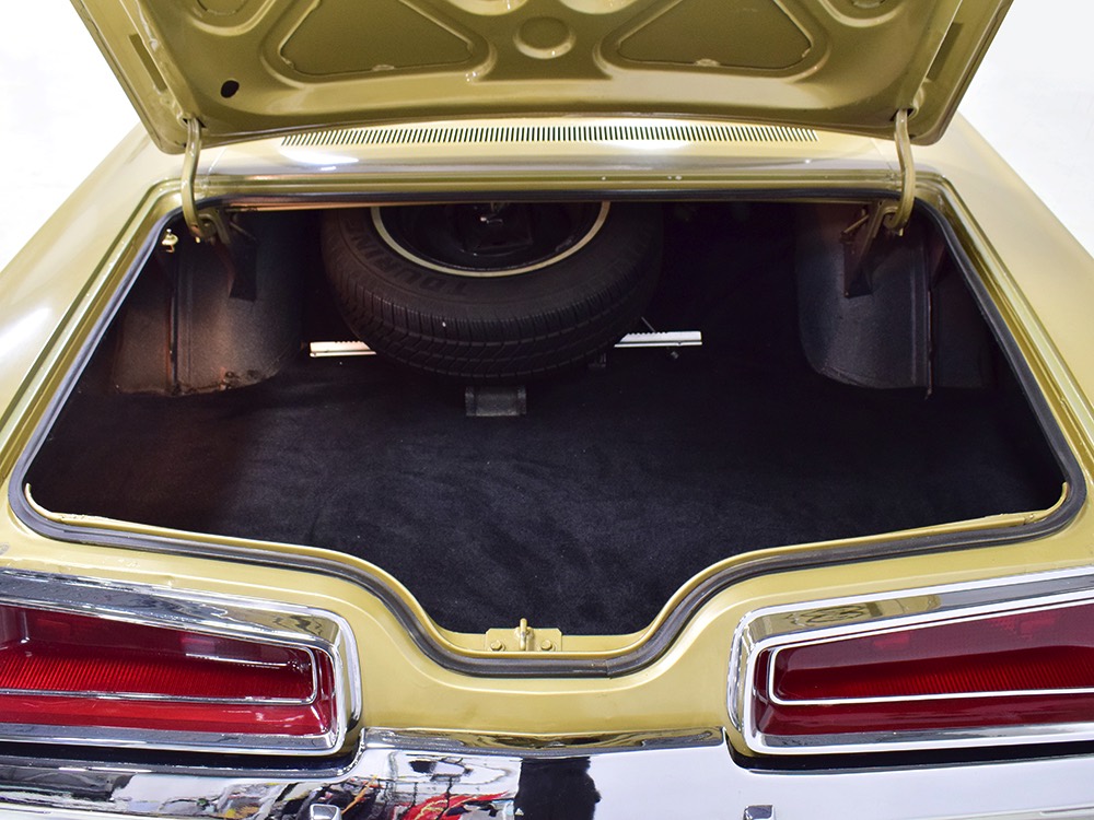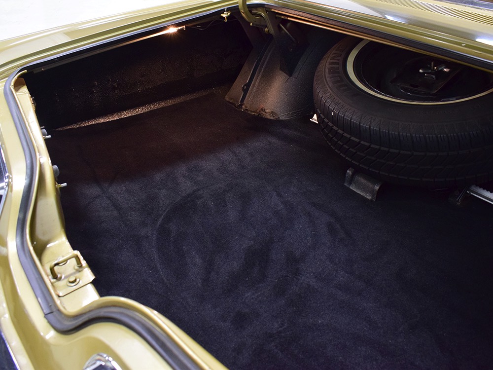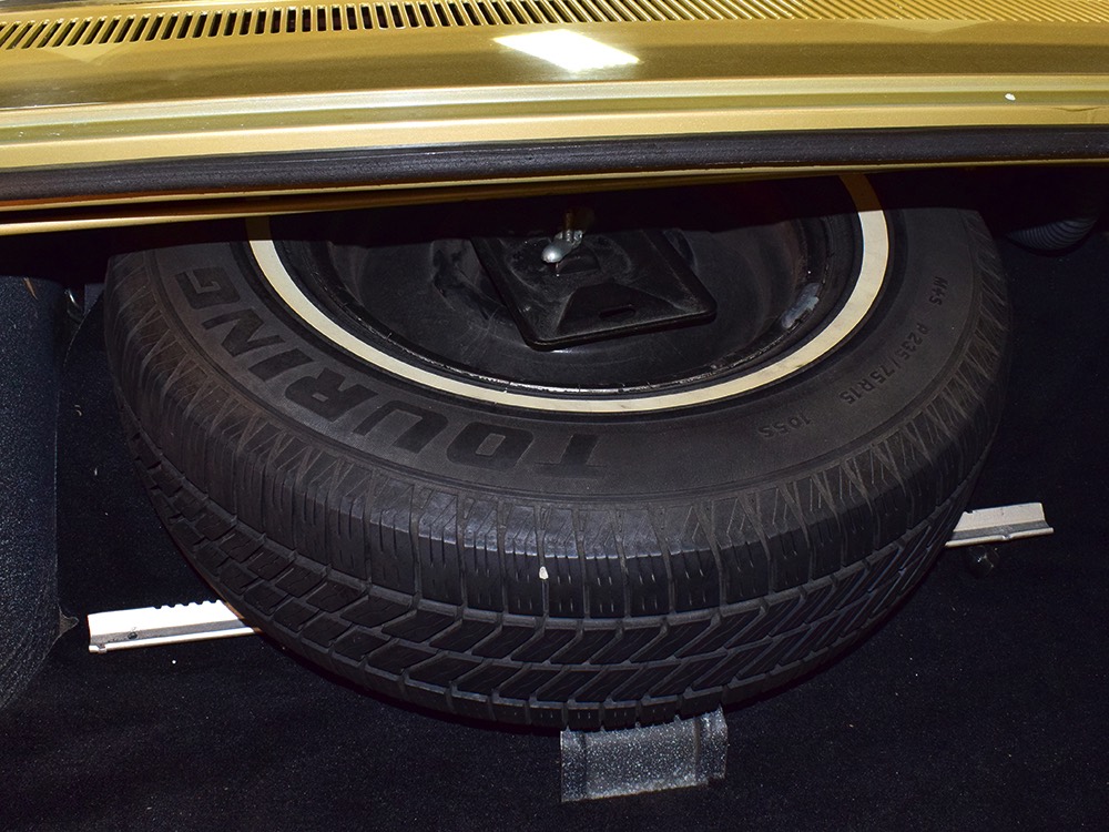 The black vinyl interior is positively cavernous and in great condition. It's possible that the carpets have been replaced simply because they look so good, but it also has factory floor mats front and rear so perhaps they're just very well-preserved. The dash has two big squarish pods with a full set of gauges, all of which are working correctly. You also get Chrysler's unique AM radio with vertical thumb knobs and a working rear speaker, as well as factory A/C that works extremely well thanks to correct R12 refrigerant inside. At some point, someone installed cruise control with a switch on the turn signal stalk, but that's the only non-stock modification and it almost looks OEM under the hood. The back seat is big enough for the Lakers’ starting front line and looks almost completely unused, right down to the tags on the original seat belts. And I think it’s important to note that there’s not a squeak or rattle anywhere in this car when you’re going down the road—it’s tomb-silent and feels incredibly tight, a hallmark of the best survivors. I'm not entirely positive that black carpets in the gigantic trunk are correct, but it fits quite well and adds a luxurious touch. There's also a full-sized spare with a jack assembly, plus beautiful unmarked floors and trunk extensions underneath.