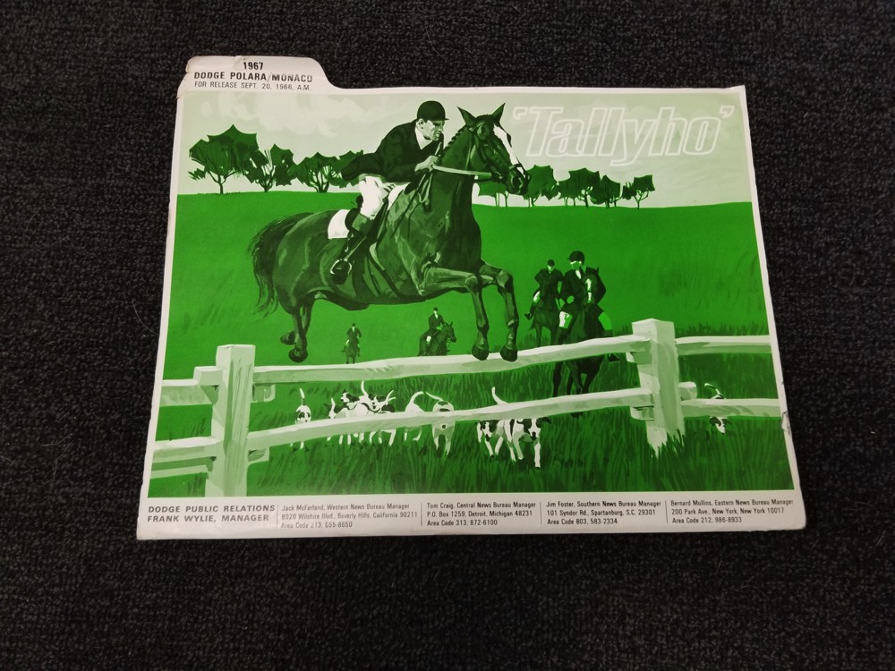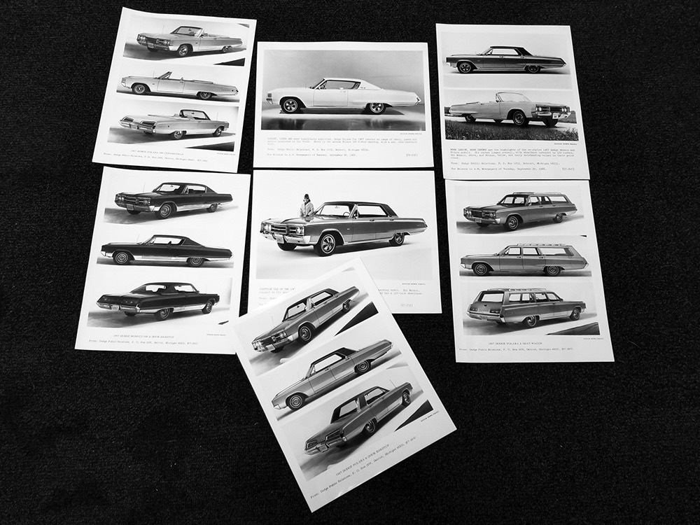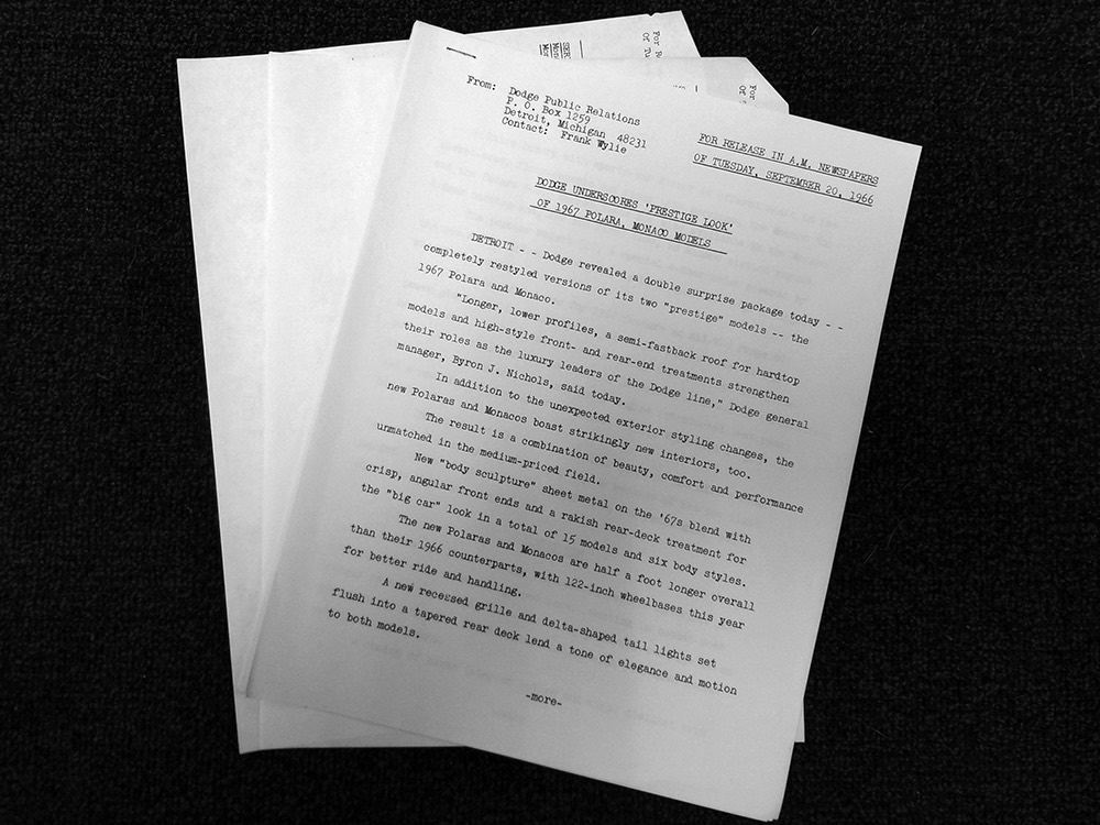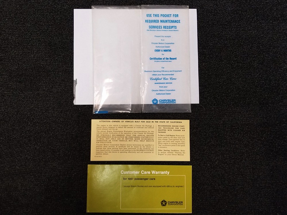 Documentation is extensive: we have the original owner's manual, service manual, and warranty booklet, plus the dealer invoice. There are also receipts for more than 40 years' worth of maintenance, title history documenting three owners (1967-1991, 1991-2015, 2015-2020), and a cool Dodge Monaco press release packet with photos.