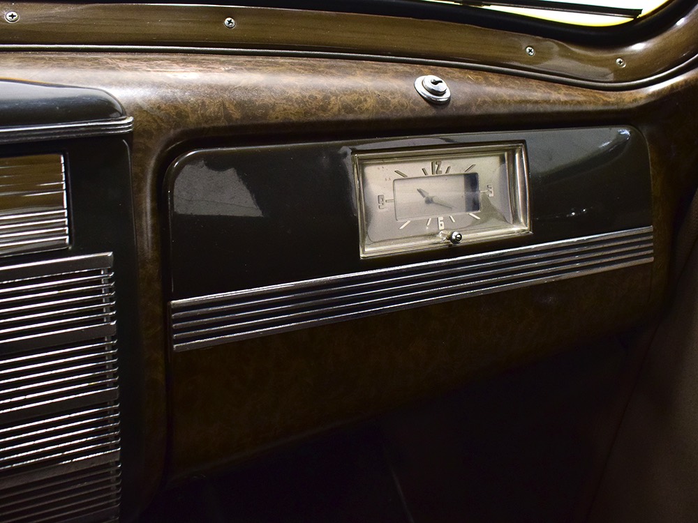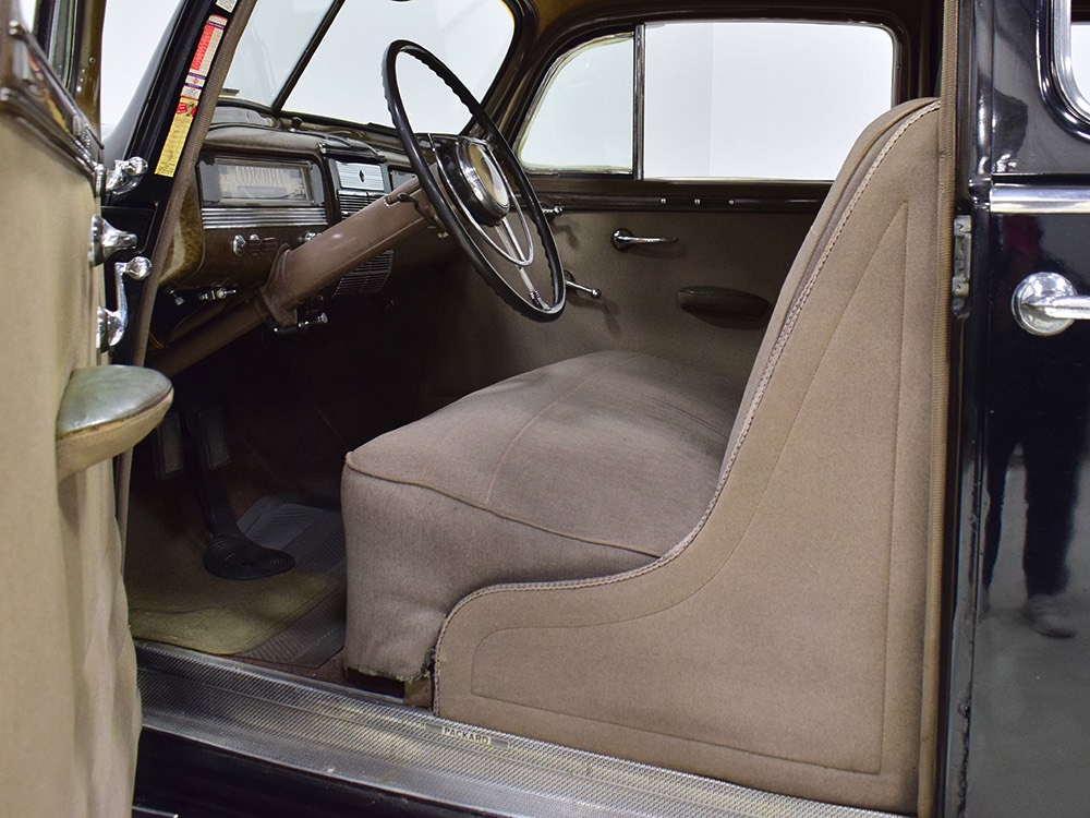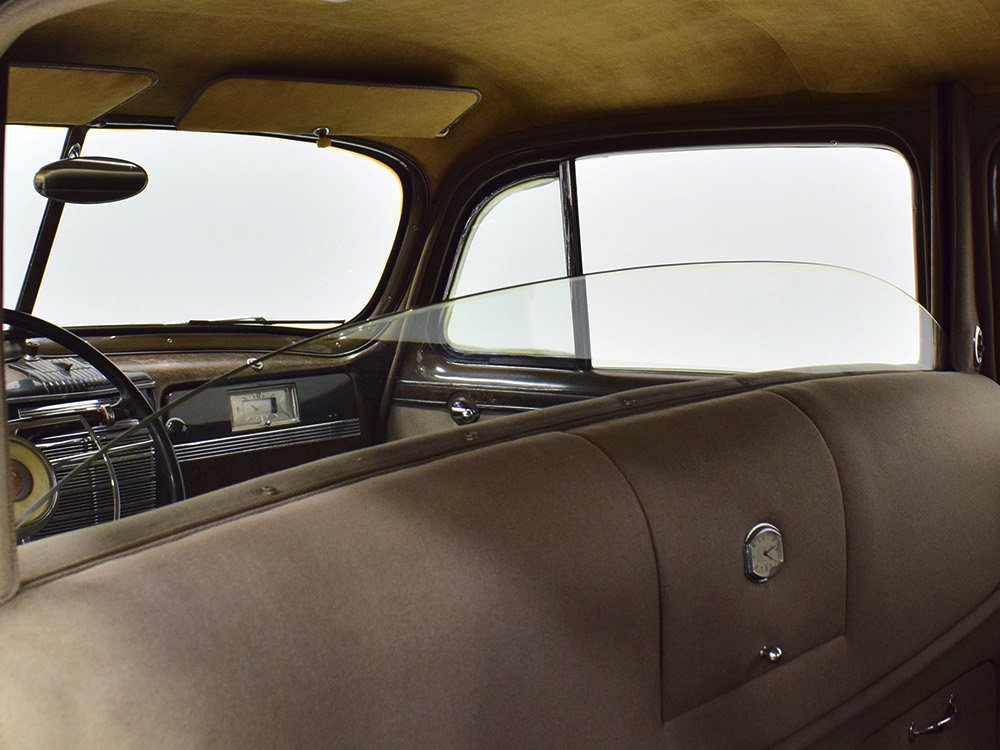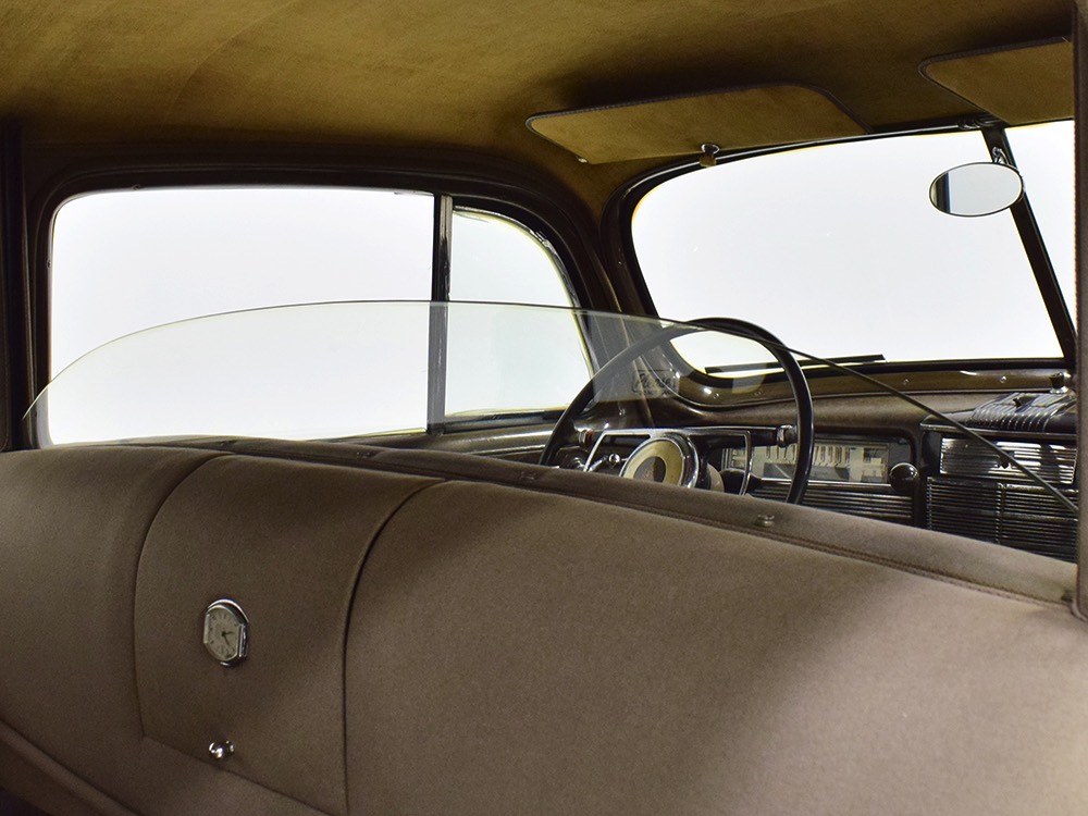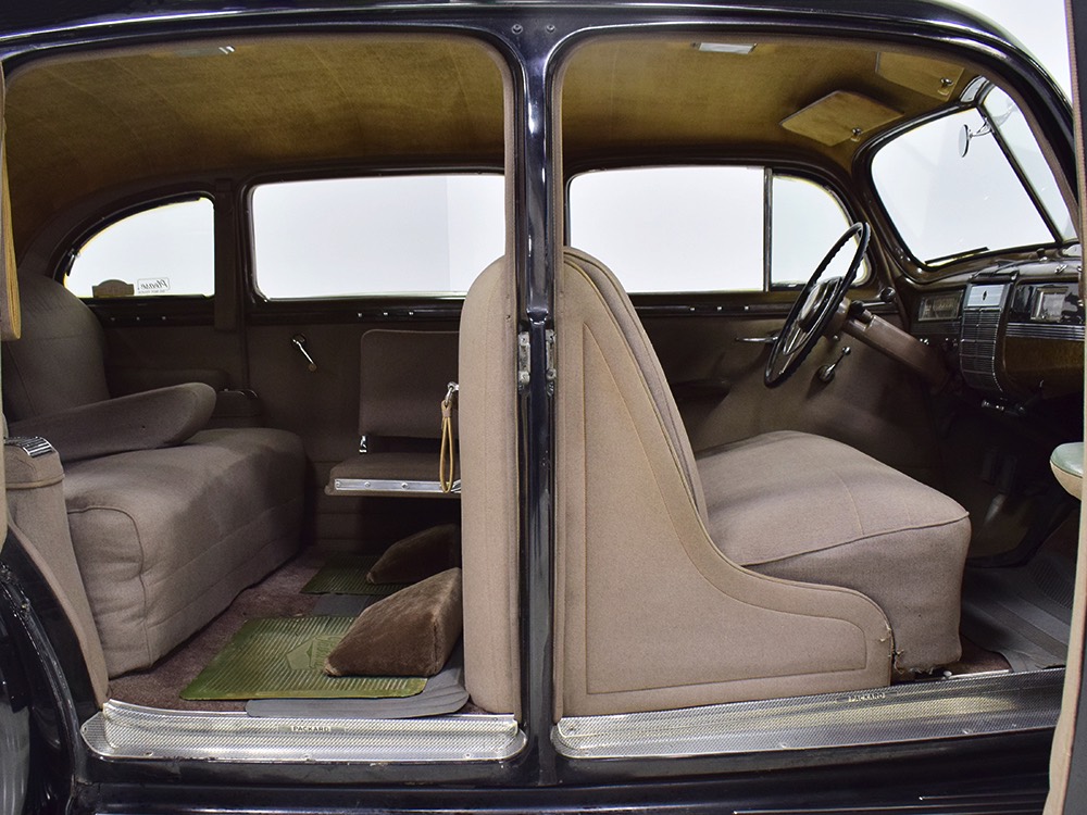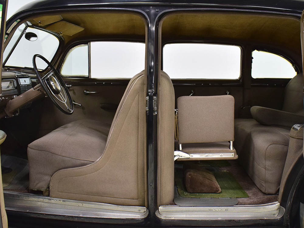 The car remains in almost entirely original condition and shows just over 38,000 original miles (it has an original mileage title and club records indicate that it had 33,000 miles in the early 1990s). It’s an unusual car for a variety of reasons: it’s a 1942 Packard, with some estimates putting production in the hundreds. Two, it is a Packard 160 on the 138-inch chassis, which was usually reserved for the 180. Three, it is equipped with a divider window like a formal sedan, but does not have the formal sedan’s padded roof. Four, there’s a single jump seat in back, sometimes referred to as an “assistant’s seat,” making it a six-passenger model. Finally, there are snaps on top of the front seat back, suggesting either a factory seat cover, or—more likely—a snap-on privacy curtain for the divider window, which makes sense given its funeral home origin.