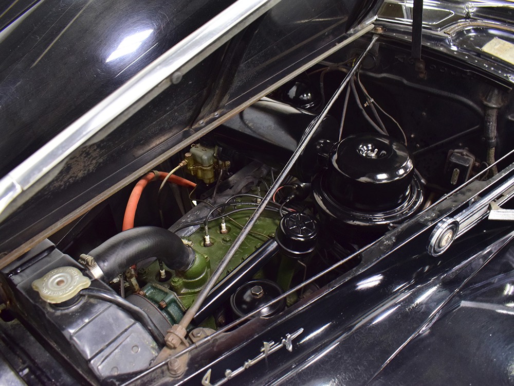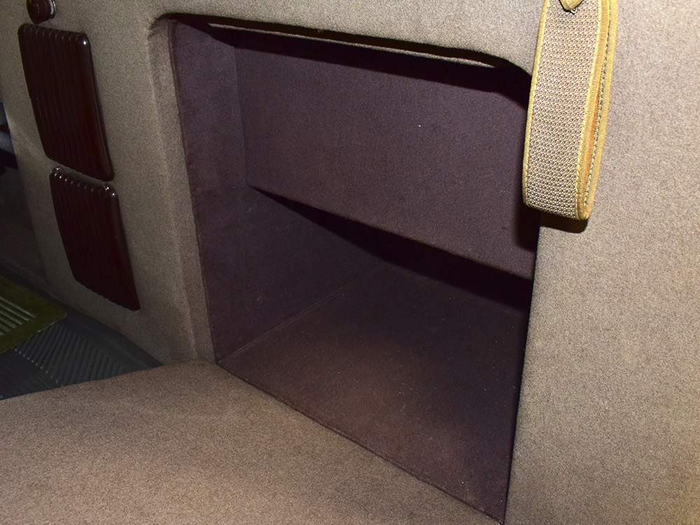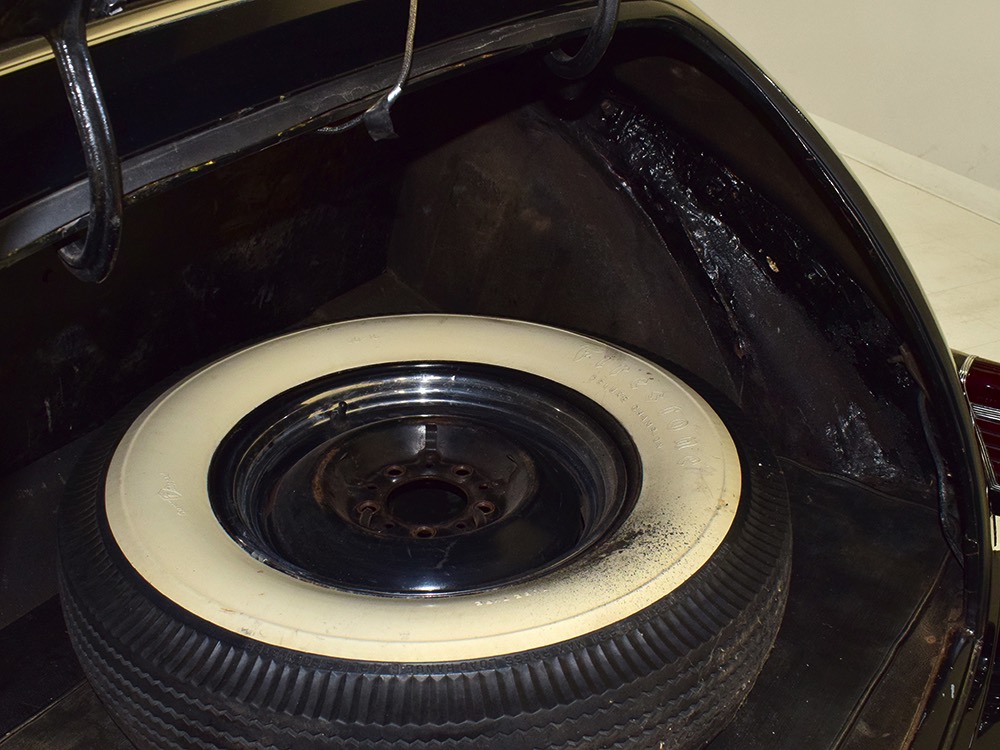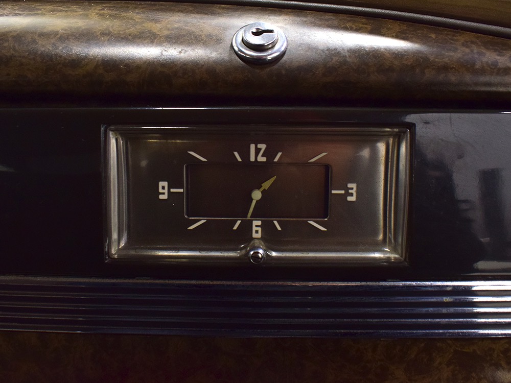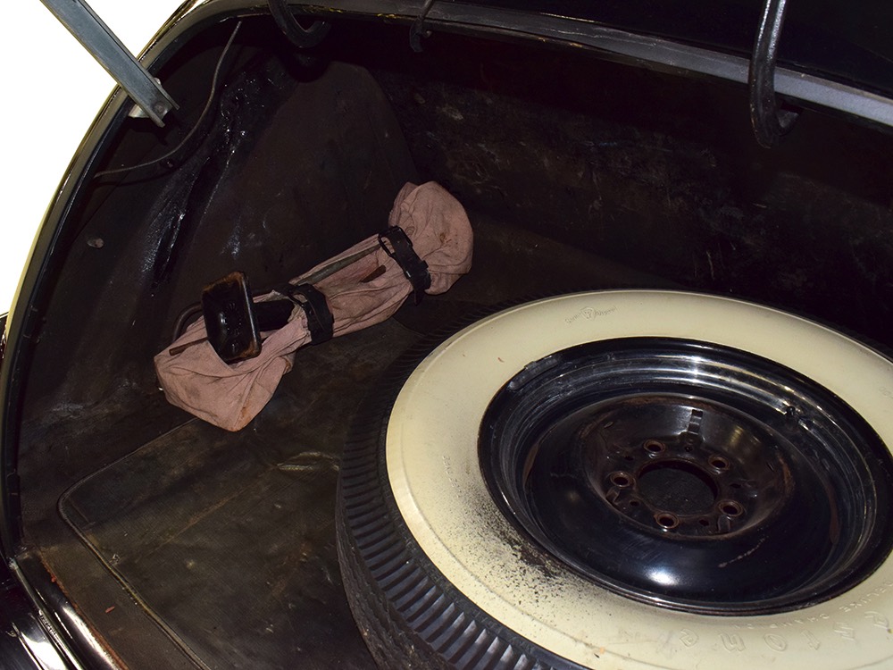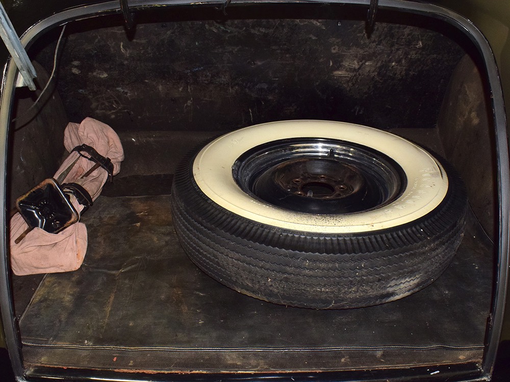 The tan wool broadcloth interior is likewise beautifully preserved and entirely original. With so few miles, it should not be surprising that there is very little wear on even the driver’s seat, which shows only minor scuffing on the trim bead where someone would slide behind the wheel. The simple patterns were part of Packard’s understated elegance, working with the woodgrained garnish moldings and dashboard, all of which are in excellent condition. Factory gauges are all functional and in 1942, Packard eliminated the manual choke and throttle knobs, greatly simplifying the dashboard. The original steering wheel is in good shape, save for some cracking around the chrome rings on the horizontal spoke. As a funeral vehicle, there was no need for a radio, so it sports a factory block-off plate, and even though the instrument panel has an indicator for overdrive, this car is not equipped with an overdrive unit (what need for it in a funeral procession?). The original electric clock ticks away reliably and at some point an auxiliary 6v power outlet was installed under the dash. There is also a discreet toggle switch for the electric fuel pump and a dealer-installed switch for the defroster, which works properly. The rear seat is just as beautifully preserved, with excellent upholstery and a folding jump seat that looks almost completely unused and even the carpets appear to be original equipment. The divider window crank (which is sadly missing its knob) is hidden behind the panel with a working wind-up clock, and a storage compartment takes the place of the passenger’s side jump seat. That’s a heater unit in the center, but we have not tested it. The trunk is plain and functional, but includes a matching full-sized spare so you don’t have to wrestle with the sidemounts if you’re in need.