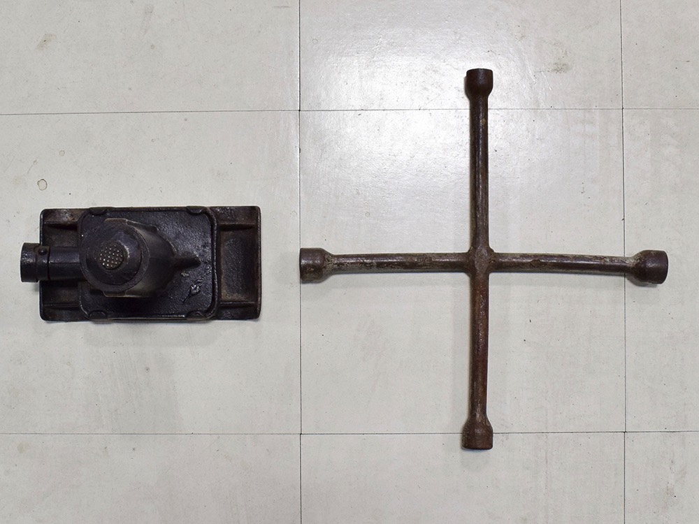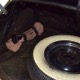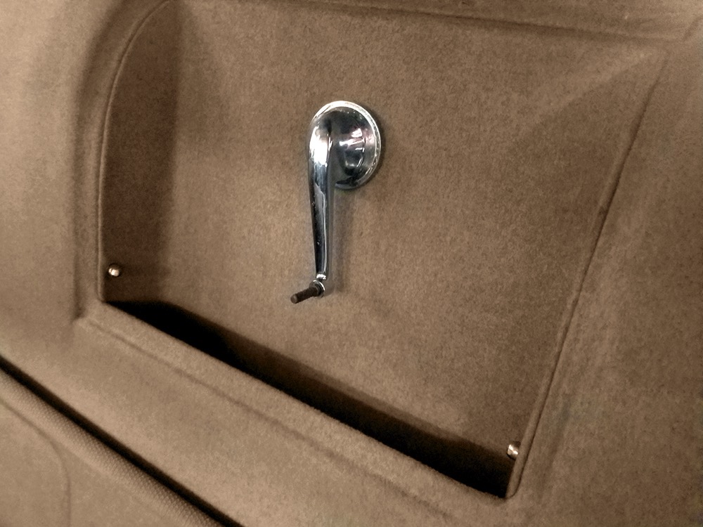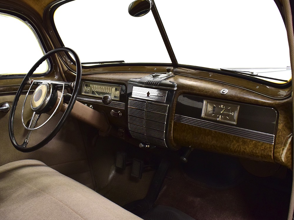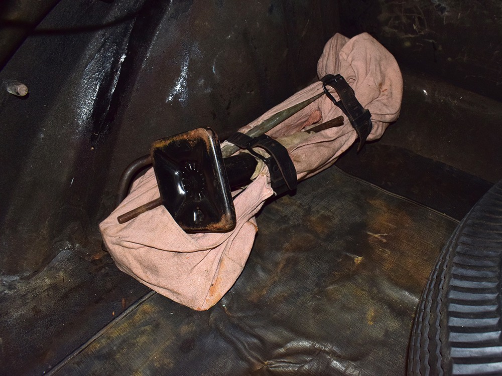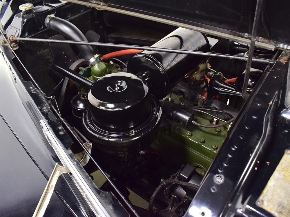 The tan wool broadcloth interior is likewise beautifully preserved and entirely original. With so few miles, it should not be surprising that there is very little wear on even the driver’s seat, which shows only minor scuffing on the trim bead where someone would slide behind the wheel. The simple patterns were part of Packard’s understated elegance, working with the woodgrained garnish moldings and dashboard, all of which are in excellent condition. Factory gauges are all functional and in 1942, Packard eliminated the manual choke and throttle knobs, greatly simplifying the dashboard. The original steering wheel is in good shape, save for some cracking around the chrome rings on the horizontal spoke. As a funeral vehicle, there was no need for a radio, so it sports a factory block-off plate, and even though the instrument panel has an indicator for overdrive, this car is not equipped with an overdrive unit (what need for it in a funeral procession?). The original electric clock ticks away reliably and at some point an auxiliary 6v power outlet was installed under the dash. There is also a discreet toggle switch for the electric fuel pump and a dealer-installed switch for the defroster, which works properly. The rear seat is just as beautifully preserved, with excellent upholstery and a folding jump seat that looks almost completely unused and even the carpets appear to be original equipment. The divider window crank (which is sadly missing its knob) is hidden behind the panel with a working wind-up clock, and a storage compartment takes the place of the passenger’s side jump seat. That’s a heater unit in the center, but we have not tested it. The trunk is plain and functional, but includes a matching full-sized spare so you don’t have to wrestle with the sidemounts if you’re in need.