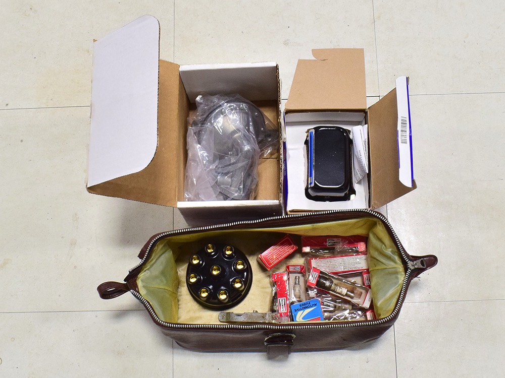 Documentation includes the original owner’s manual and folder, as well as a factory shop manual. The car also includes some spare parts (fuel pump, voltage regulator, tune-up parts) and a variety of tools for touring.