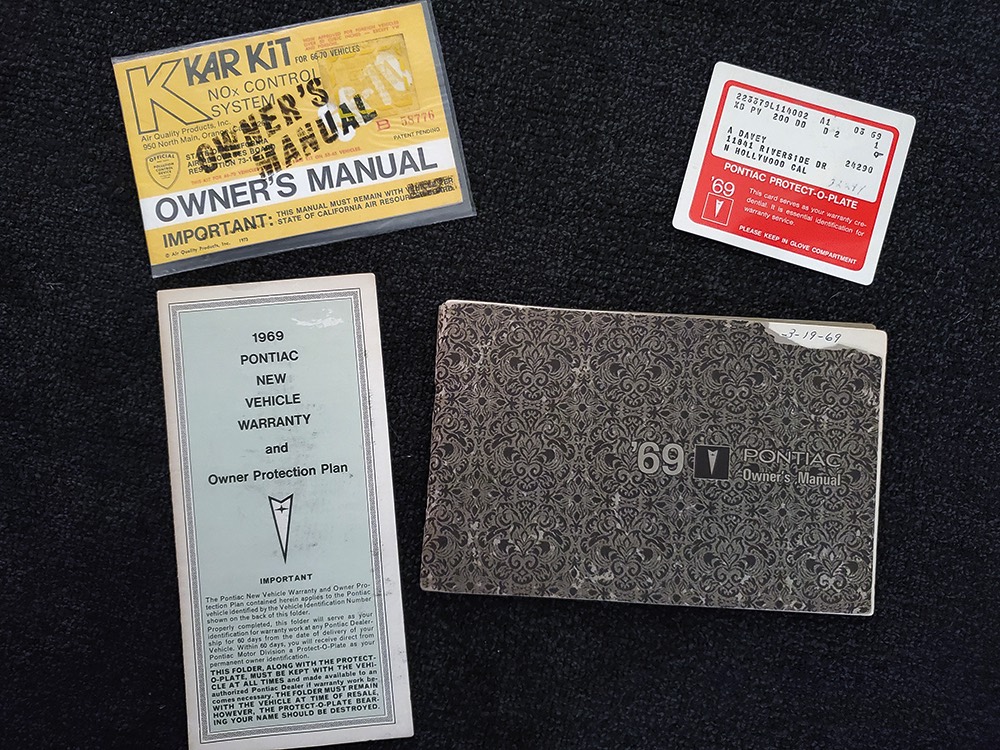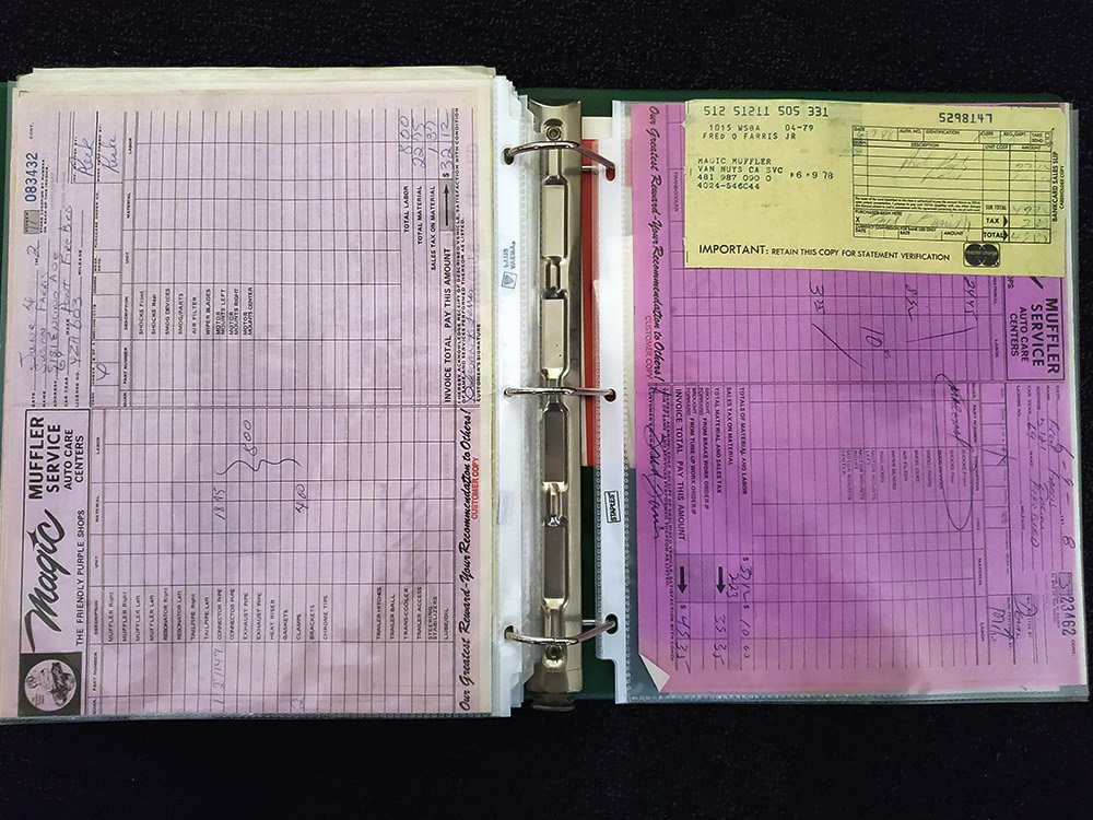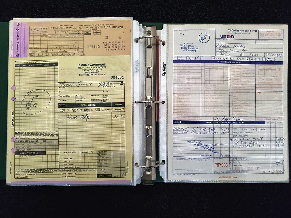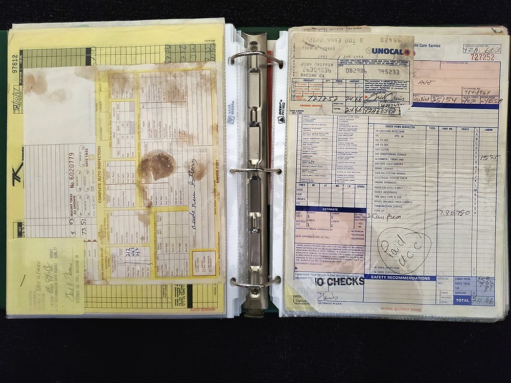 Documentation is extensive, including the original Protect-O-Plate, owner’s manual, and a pair of original dealer brochures. It also includes full PHS paperwork, maintenance receipts, restoration photos, and the original California black plate.