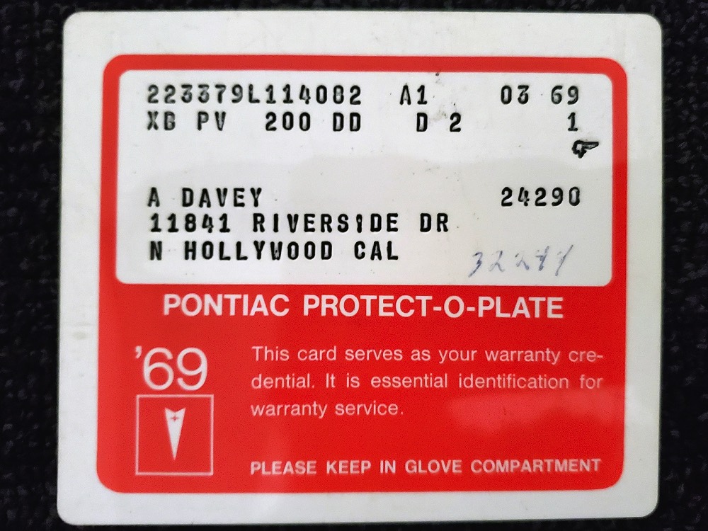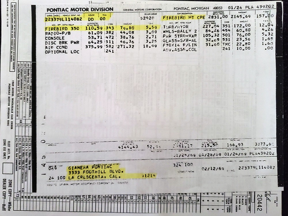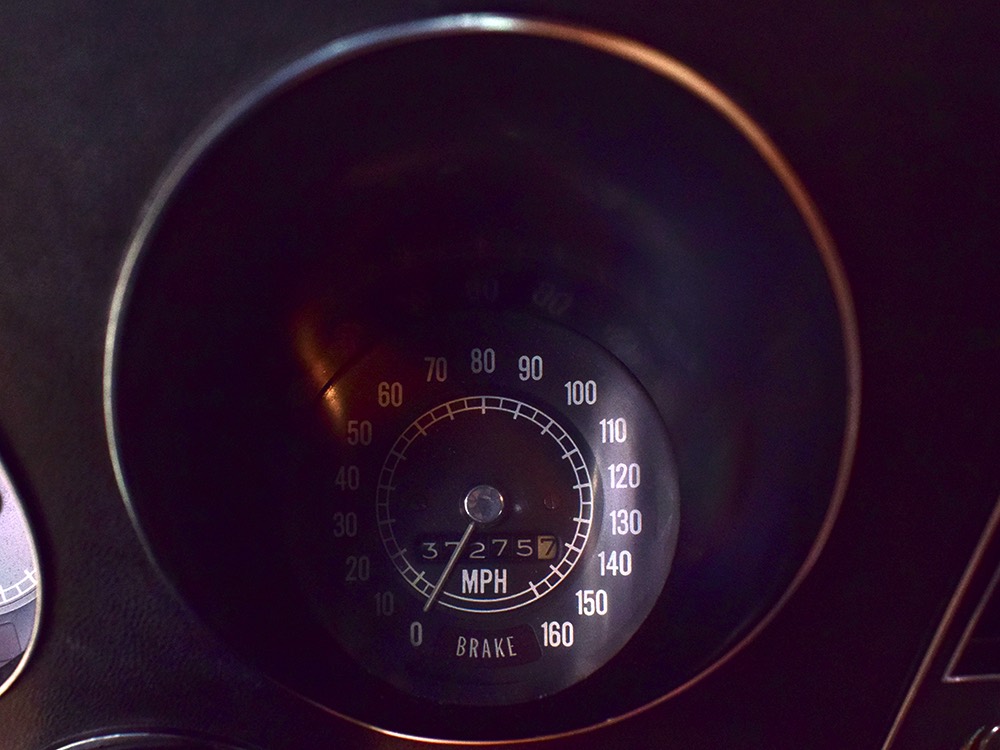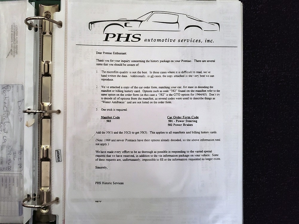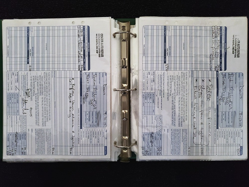 Documentation is extensive, including the original Protect-O-Plate, owner’s manual, and a pair of original dealer brochures. It also includes full PHS paperwork, maintenance receipts, restoration photos, and the original California black plate.
