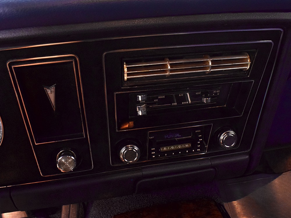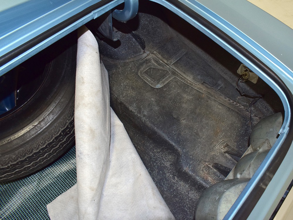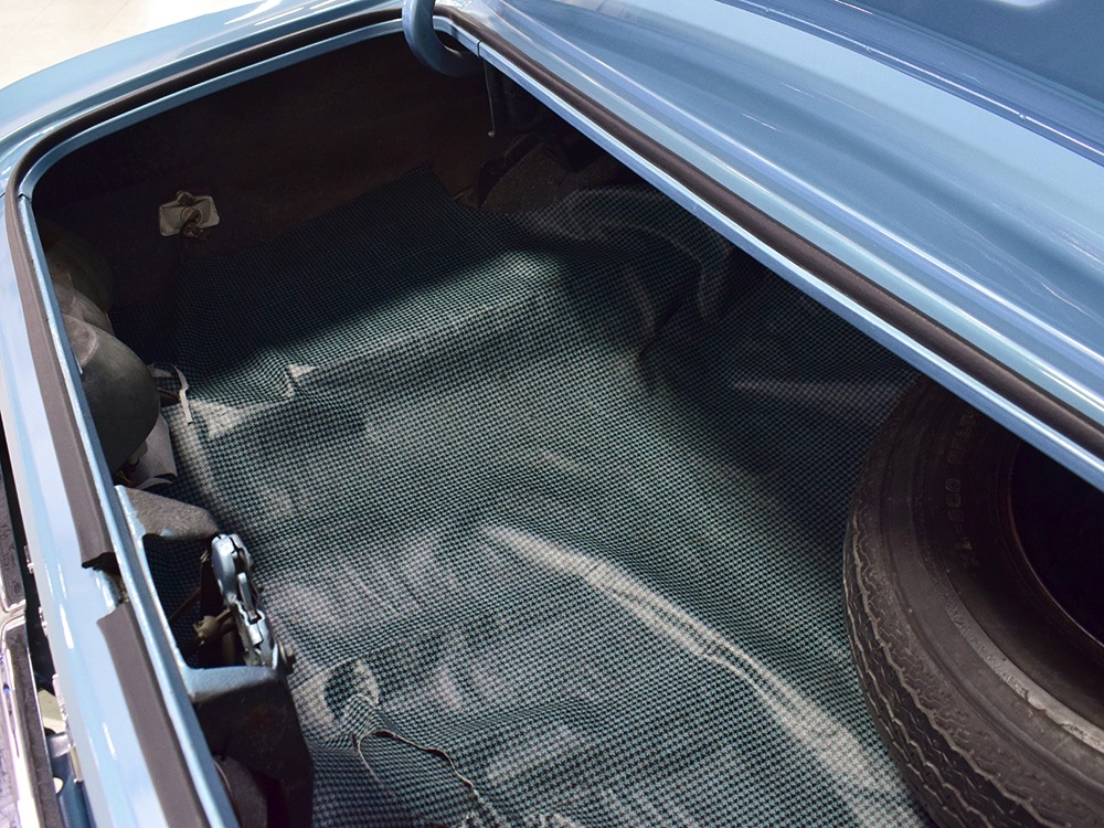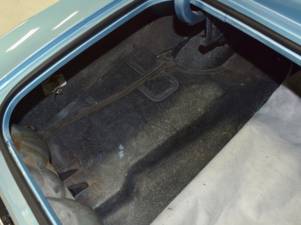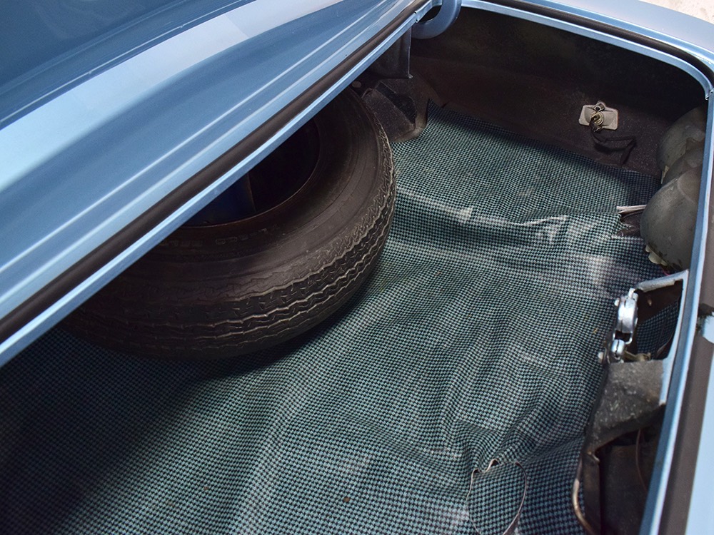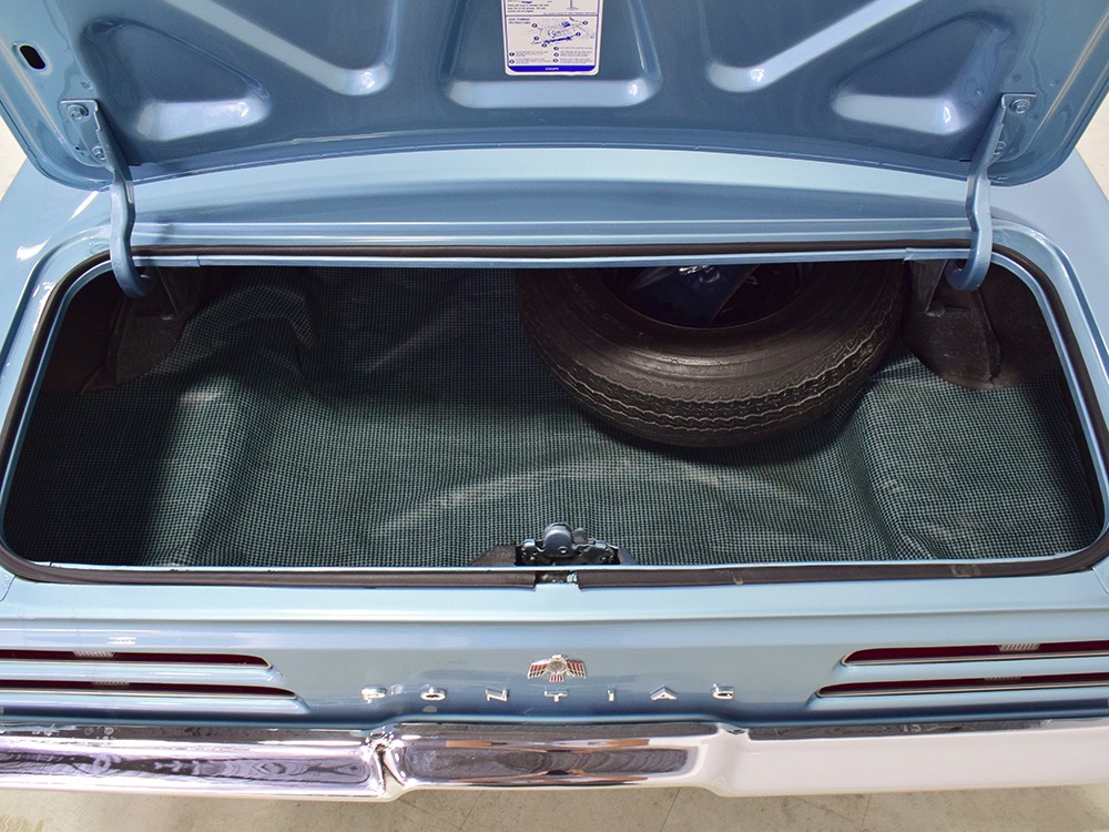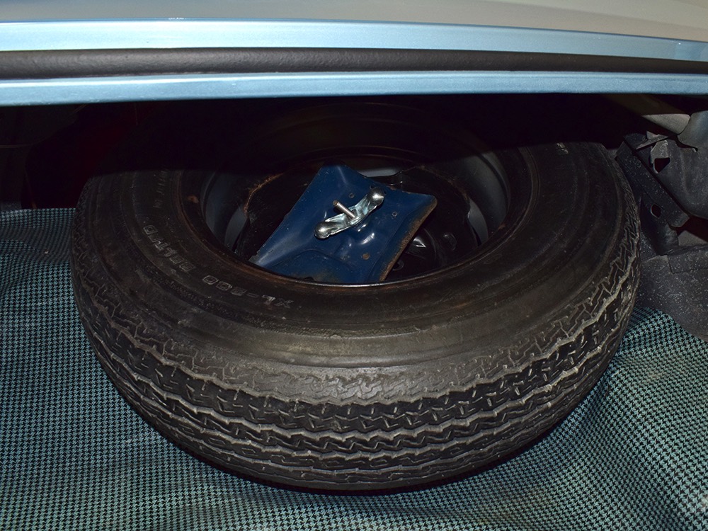 The blue interior has been freshened wth new seat covers and possibly new carpets, but the rest appears original and in great condition. That shouldn’t be a surprise, given the mileage, and a few bits of simulated burled walnut tend to make the Pontiac interiors a bit more welcoming than the monochromatic Chevys. Options on this Firebird include working factory A/C, a hood tach, and a center console, while the original radio has been upgraded to an AM/FM/cassette head unit that looks like it was born there and powers a pair of 6x9 speakers on the package shelf. Three point belts are still bolted to the overhead brackets and the headliner, which we believe is original equipment, remains in outstanding condition. And despite spending its life in sunny California, the dash pad isn’t cracked or damaged by the sun. The trunk is outfitted with a new reproduction mat and carries what might be the original spare along with the original jack assembly.