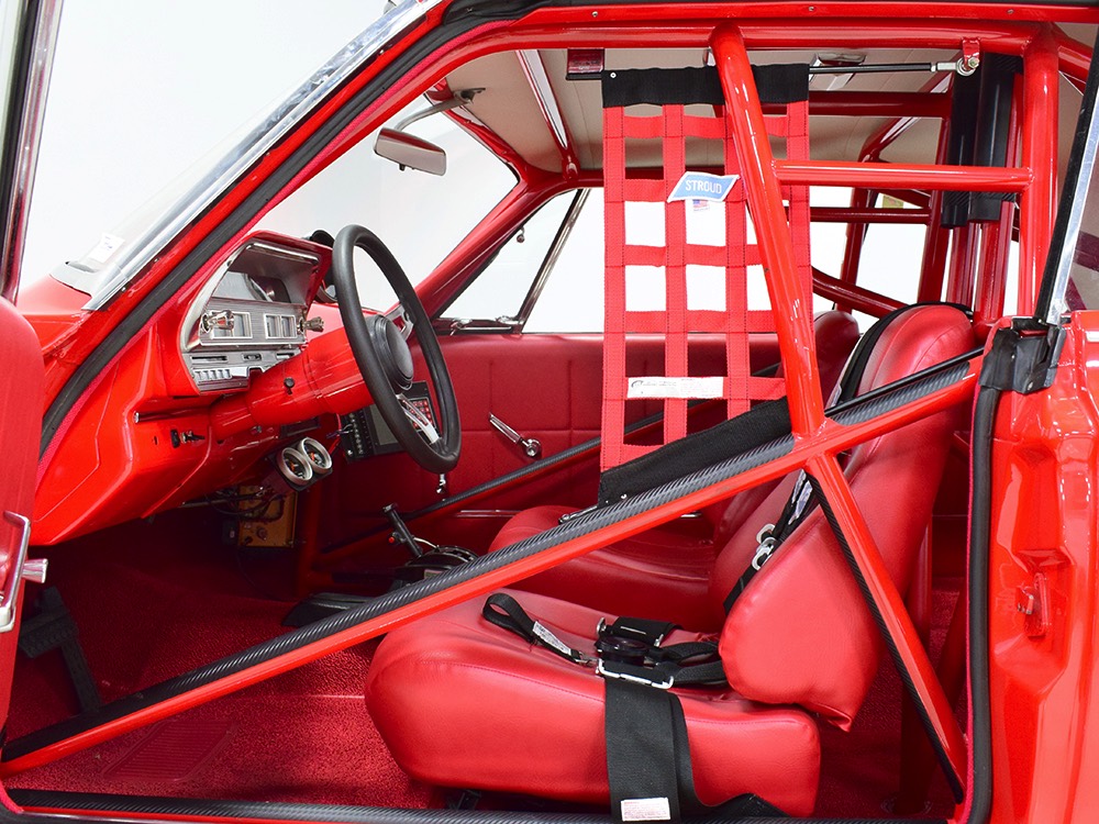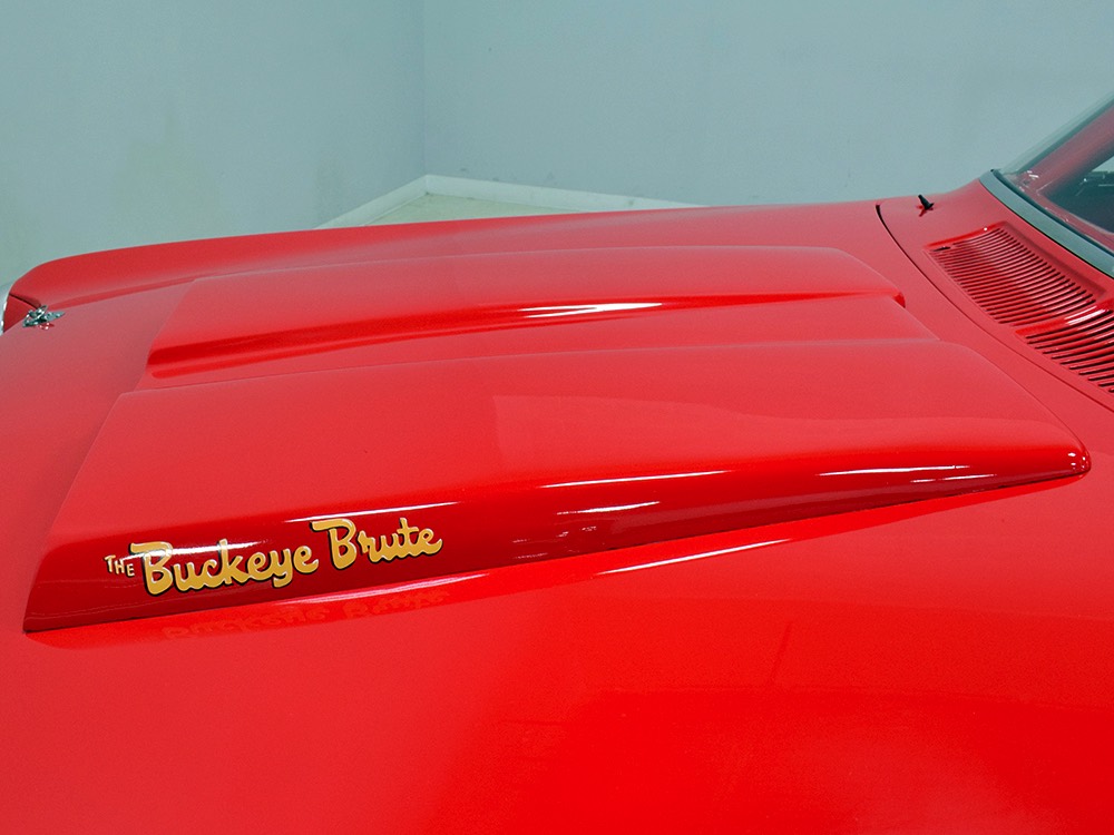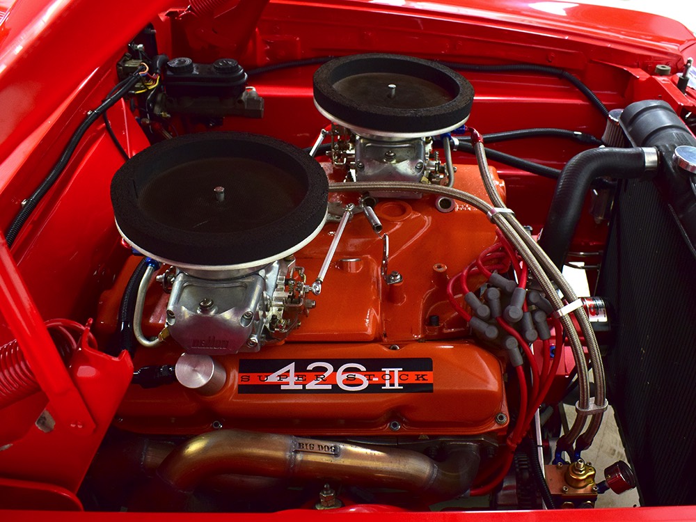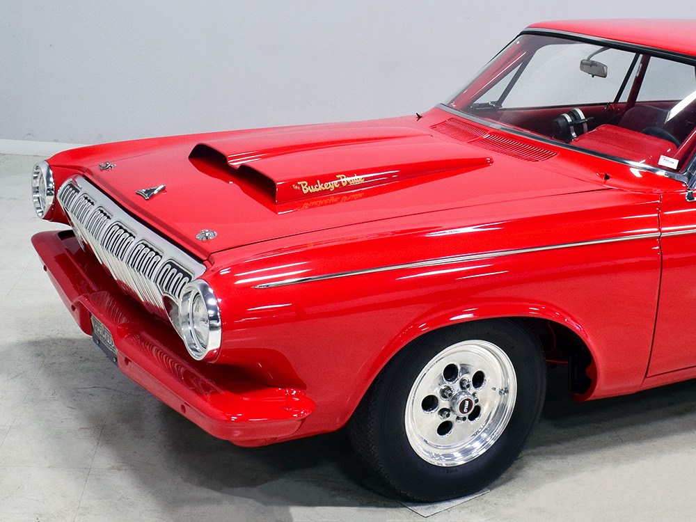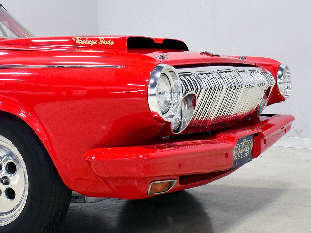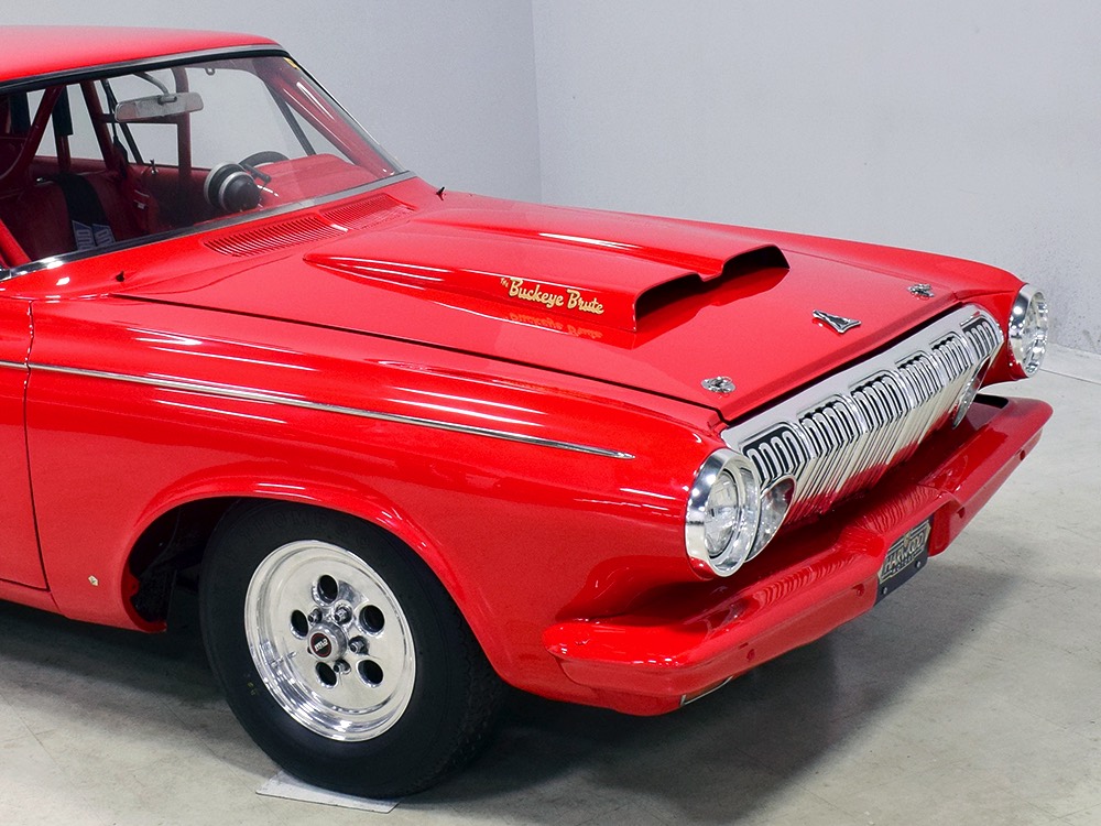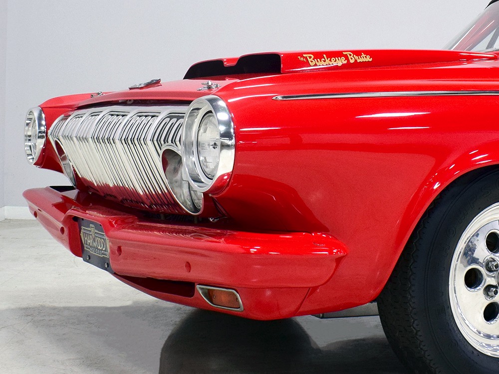 A few years ago, the vintage race car received a spectacular rotisserie restoration to its current condition—it’s quite a bit better than new in just about every way. Because it spent much of its life on the track, it shows just 32,560 original miles and it has never been wrecked or rusty so it’s still carrying all its original sheetmetal. Of course, some of that sheetmetal has been skillfully modified, including the quarters which now house some large-by-huge meats, but none of the changes jump out at you as radical (well, not in terms of the sheetmetal, anyway). During the restoration, all the various bumps and bruises that it might have suffered during its life on the track were expertly exorcised from the bodywork and it presents now as a show-quality car that’s simply stunning from any angle. It’s wearing PP1 Vermillion paint, just as it did in 1963, although there was never a factory paint job that glowed like this one. It remains all steel, including the hood wearing Super Stock scoops that force-feed the those two big Holley carbs underneath. The Polara styling in 1963 can’t quite be called beautiful, but it is certainly purposeful and I think I like that better—this is what we call an “industrial strength” Mopar. A simple strip of stainless side trim highlights the simple hardtop bodywork, along with bright window surrounds and the beautifully restored grille up front. Both front and rear bumpers have been painted to match, but the look works on this car and doesn’t stand out as non-authentic. And while this car wore graphics and sponsor decals almost its entire life, the only flash it carries today are “The Buckeye Brute” script on the hood scoop.