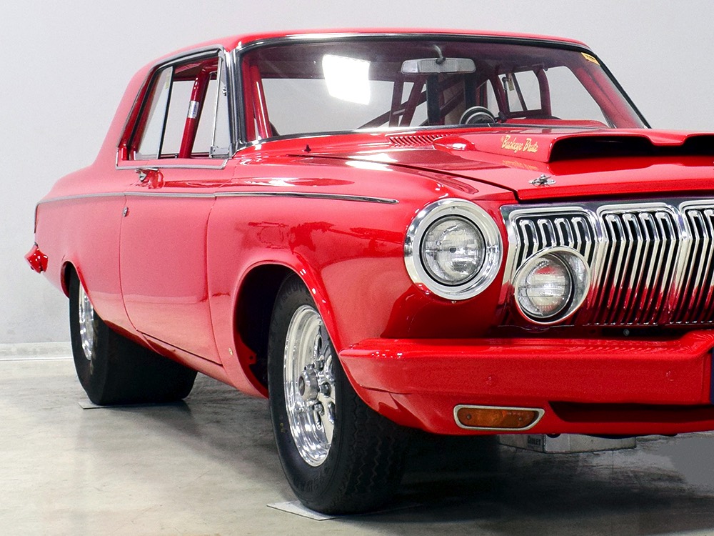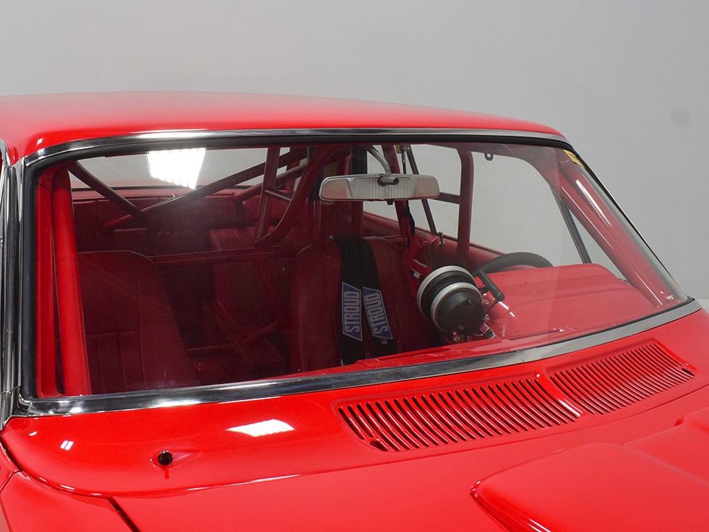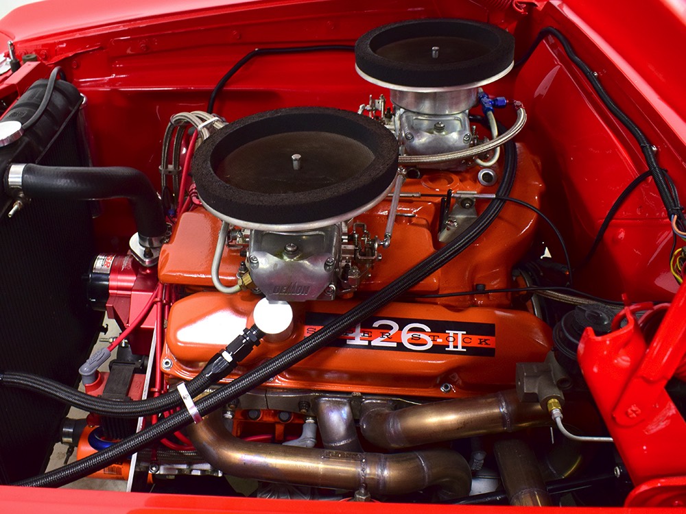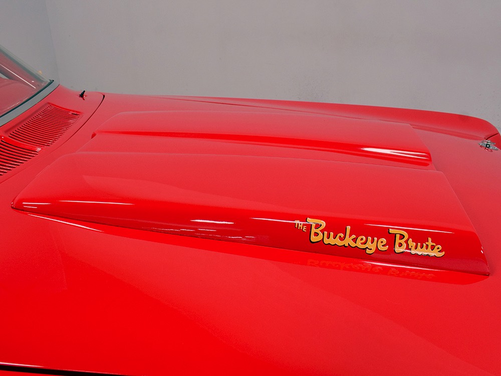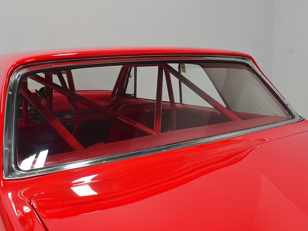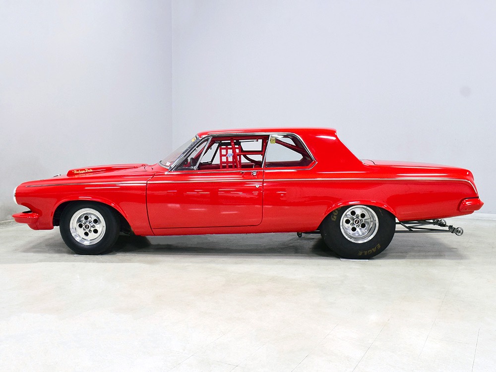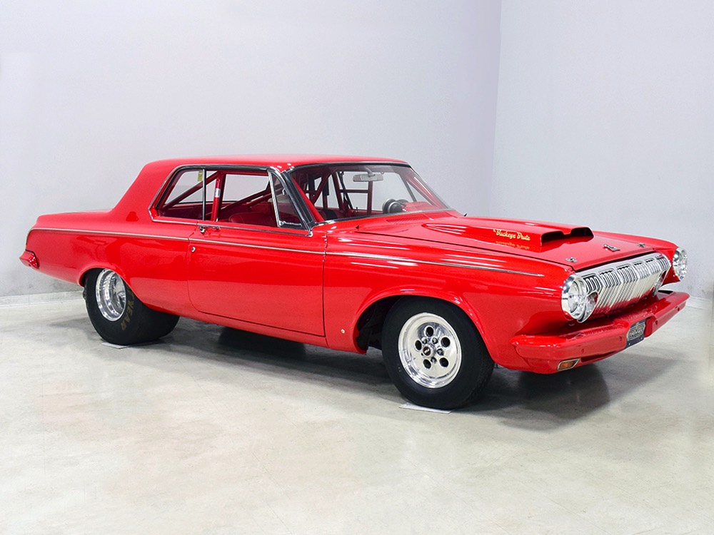 A few years ago, the vintage race car received a spectacular rotisserie restoration to its current condition—it’s quite a bit better than new in just about every way. Because it spent much of its life on the track, it shows just 32,560 original miles and it has never been wrecked or rusty so it’s still carrying all its original sheetmetal. Of course, some of that sheetmetal has been skillfully modified, including the quarters which now house some large-by-huge meats, but none of the changes jump out at you as radical (well, not in terms of the sheetmetal, anyway). During the restoration, all the various bumps and bruises that it might have suffered during its life on the track were expertly exorcised from the bodywork and it presents now as a show-quality car that’s simply stunning from any angle. It’s wearing PP1 Vermillion paint, just as it did in 1963, although there was never a factory paint job that glowed like this one. It remains all steel, including the hood wearing Super Stock scoops that force-feed the those two big Holley carbs underneath. The Polara styling in 1963 can’t quite be called beautiful, but it is certainly purposeful and I think I like that better—this is what we call an “industrial strength” Mopar. A simple strip of stainless side trim highlights the simple hardtop bodywork, along with bright window surrounds and the beautifully restored grille up front. Both front and rear bumpers have been painted to match, but the look works on this car and doesn’t stand out as non-authentic. And while this car wore graphics and sponsor decals almost its entire life, the only flash it carries today are “The Buckeye Brute” script on the hood scoop.