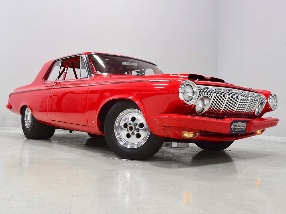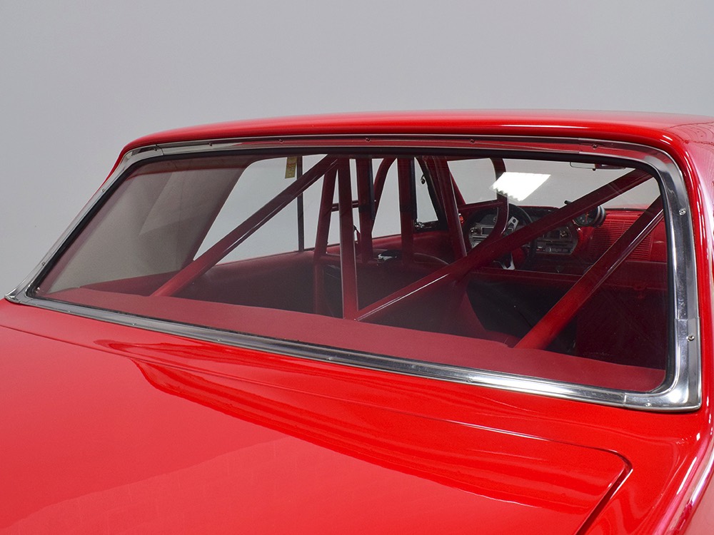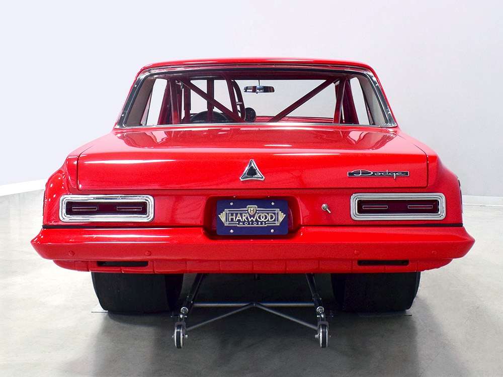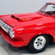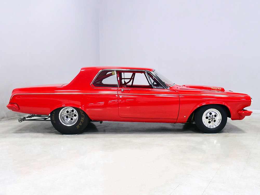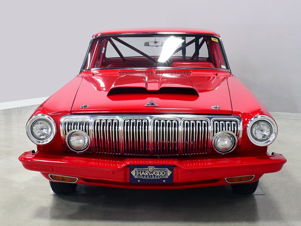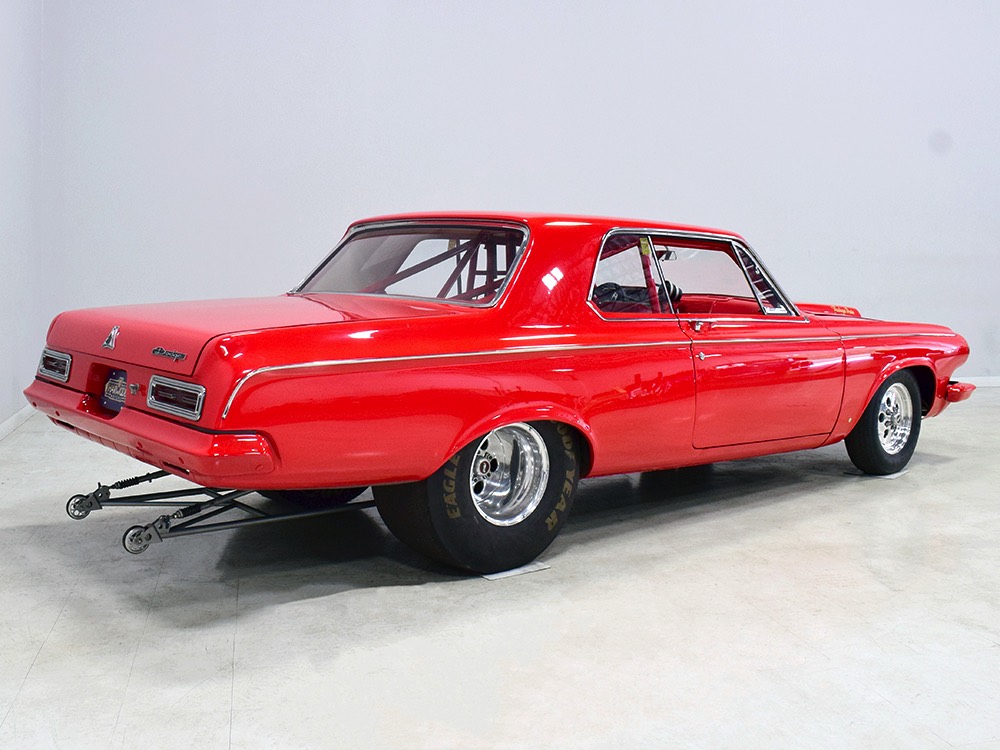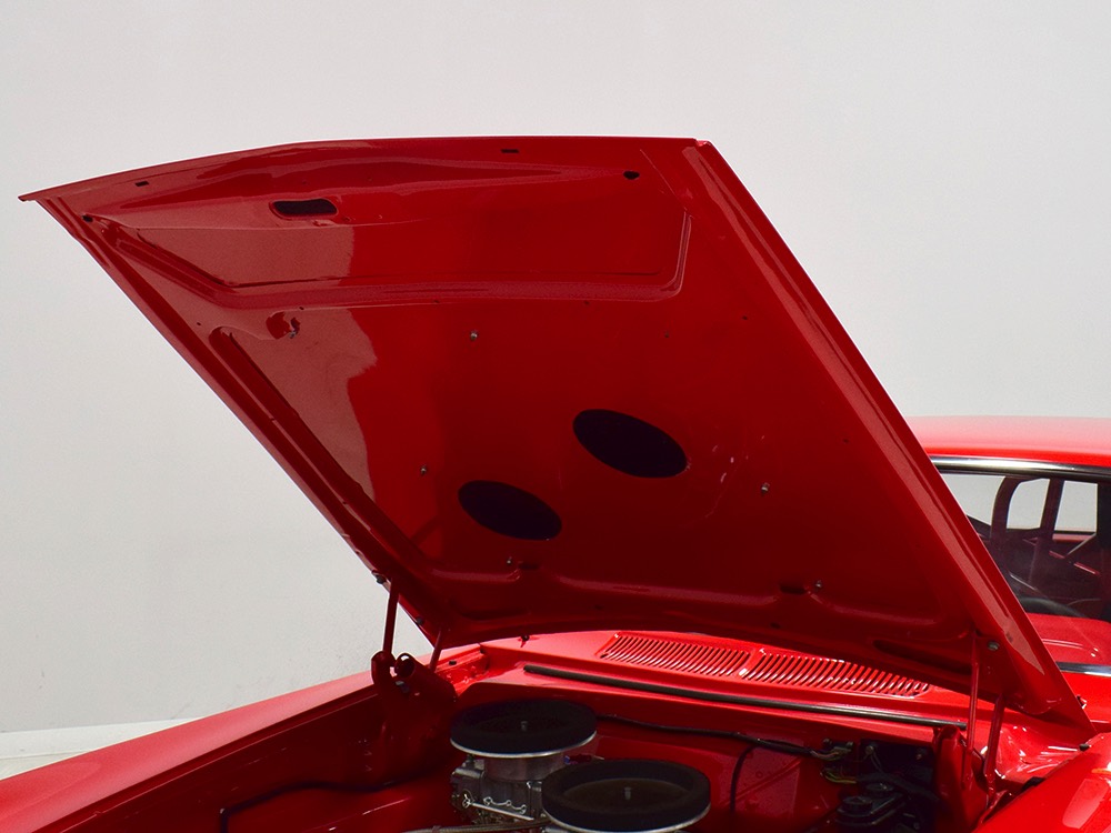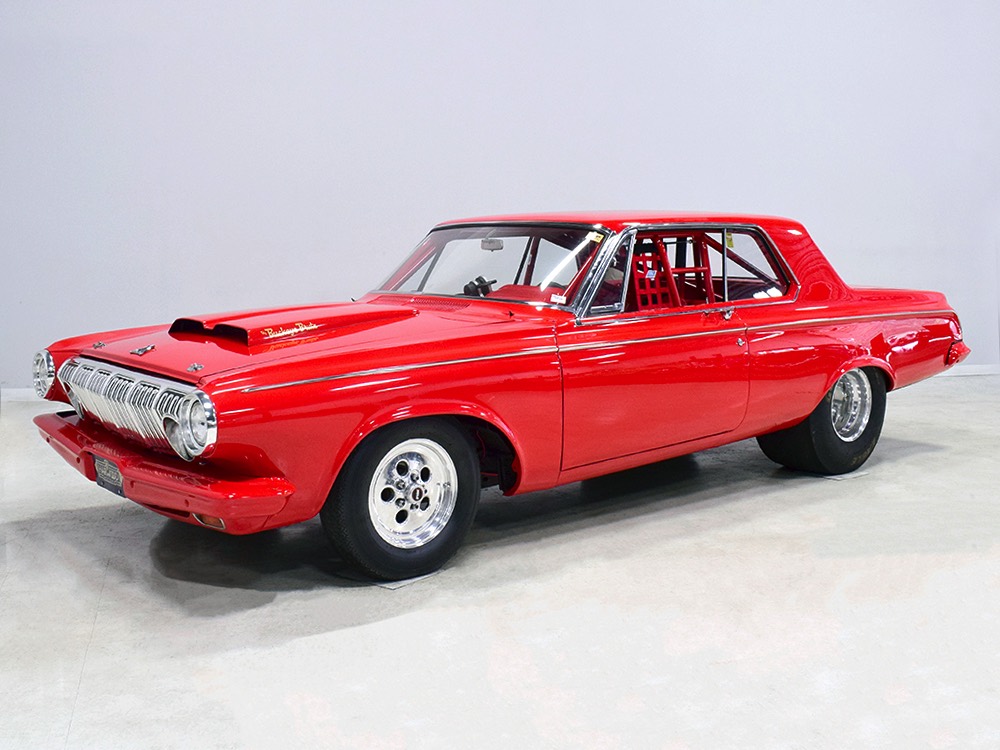 A few years ago, the vintage race car received a spectacular rotisserie restoration to its current condition—it’s quite a bit better than new in just about every way. Because it spent much of its life on the track, it shows just 32,560 original miles and it has never been wrecked or rusty so it’s still carrying all its original sheetmetal. Of course, some of that sheetmetal has been skillfully modified, including the quarters which now house some large-by-huge meats, but none of the changes jump out at you as radical (well, not in terms of the sheetmetal, anyway). During the restoration, all the various bumps and bruises that it might have suffered during its life on the track were expertly exorcised from the bodywork and it presents now as a show-quality car that’s simply stunning from any angle. It’s wearing PP1 Vermillion paint, just as it did in 1963, although there was never a factory paint job that glowed like this one. It remains all steel, including the hood wearing Super Stock scoops that force-feed the those two big Holley carbs underneath. The Polara styling in 1963 can’t quite be called beautiful, but it is certainly purposeful and I think I like that better—this is what we call an “industrial strength” Mopar. A simple strip of stainless side trim highlights the simple hardtop bodywork, along with bright window surrounds and the beautifully restored grille up front. Both front and rear bumpers have been painted to match, but the look works on this car and doesn’t stand out as non-authentic. And while this car wore graphics and sponsor decals almost its entire life, the only flash it carries today are “The Buckeye Brute” script on the hood scoop.