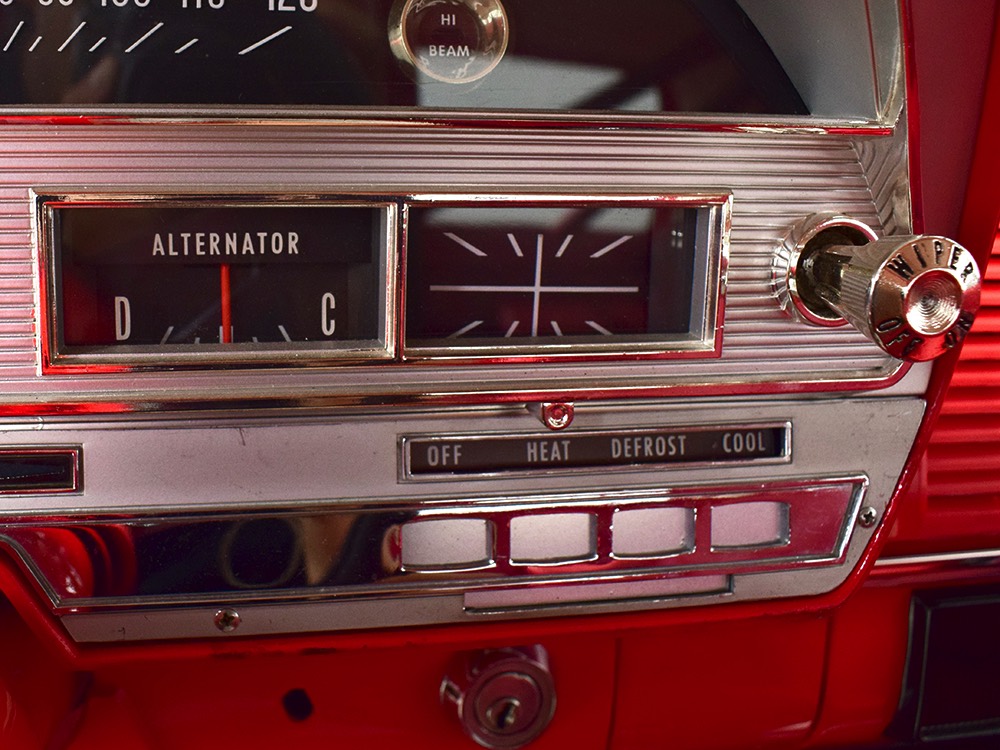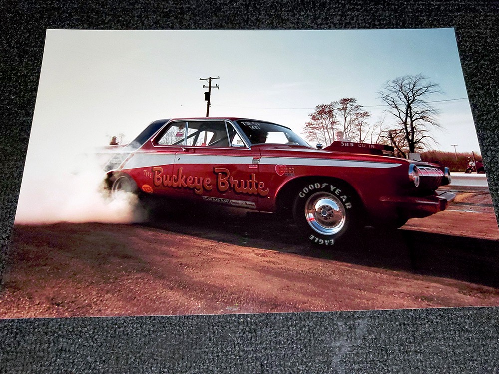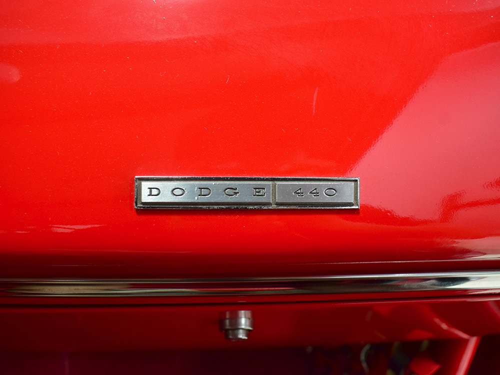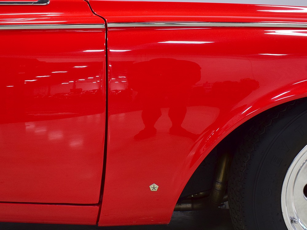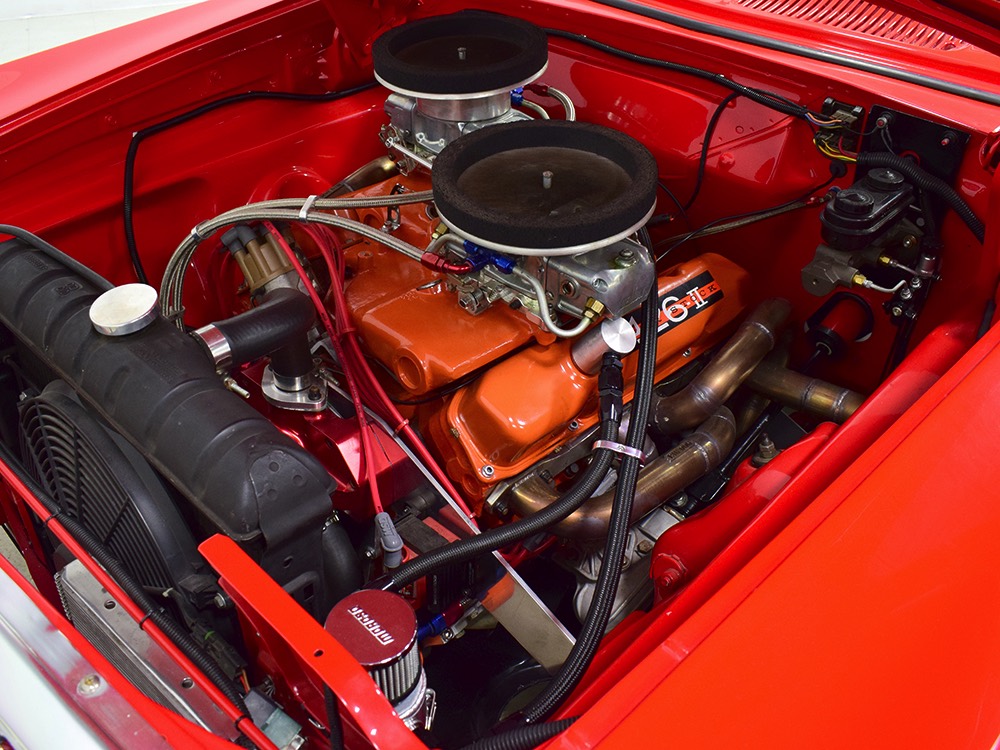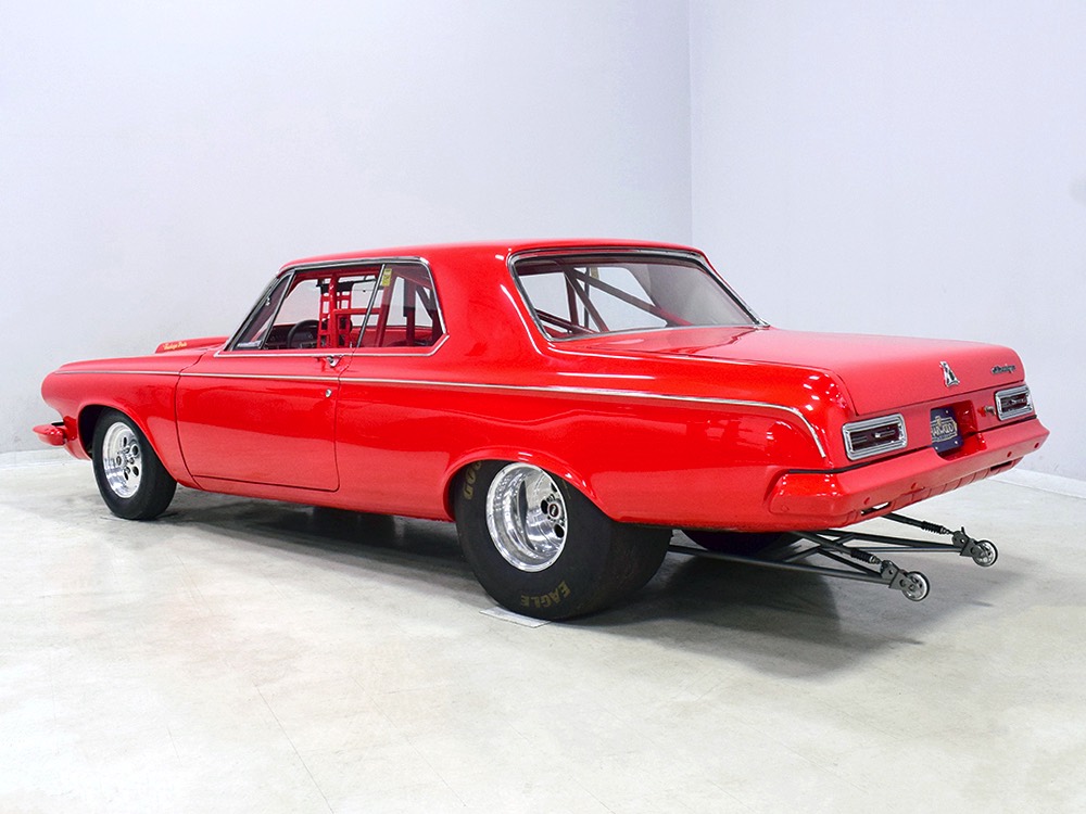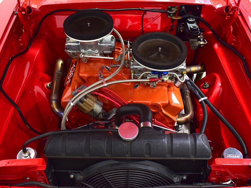 A few years ago, the vintage race car received a spectacular rotisserie restoration to its current condition—it’s quite a bit better than new in just about every way. Because it spent much of its life on the track, it shows just 32,560 original miles and it has never been wrecked or rusty so it’s still carrying all its original sheetmetal. Of course, some of that sheetmetal has been skillfully modified, including the quarters which now house some large-by-huge meats, but none of the changes jump out at you as radical (well, not in terms of the sheetmetal, anyway). During the restoration, all the various bumps and bruises that it might have suffered during its life on the track were expertly exorcised from the bodywork and it presents now as a show-quality car that’s simply stunning from any angle. It’s wearing PP1 Vermillion paint, just as it did in 1963, although there was never a factory paint job that glowed like this one. It remains all steel, including the hood wearing Super Stock scoops that force-feed the those two big Holley carbs underneath. The Polara styling in 1963 can’t quite be called beautiful, but it is certainly purposeful and I think I like that better—this is what we call an “industrial strength” Mopar. A simple strip of stainless side trim highlights the simple hardtop bodywork, along with bright window surrounds and the beautifully restored grille up front. Both front and rear bumpers have been painted to match, but the look works on this car and doesn’t stand out as non-authentic. And while this car wore graphics and sponsor decals almost its entire life, the only flash it carries today are “The Buckeye Brute” script on the hood scoop.