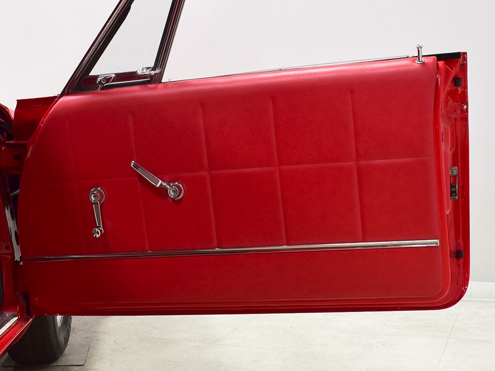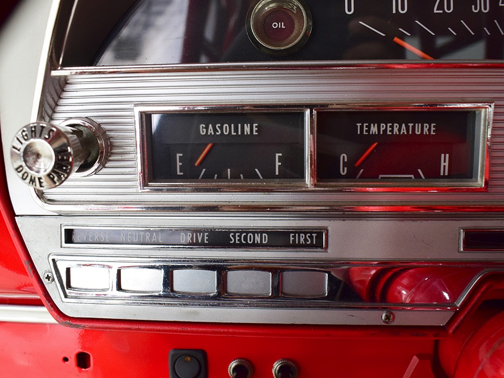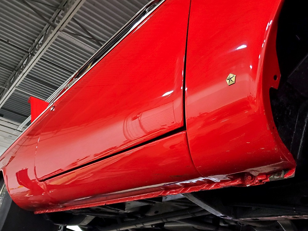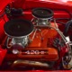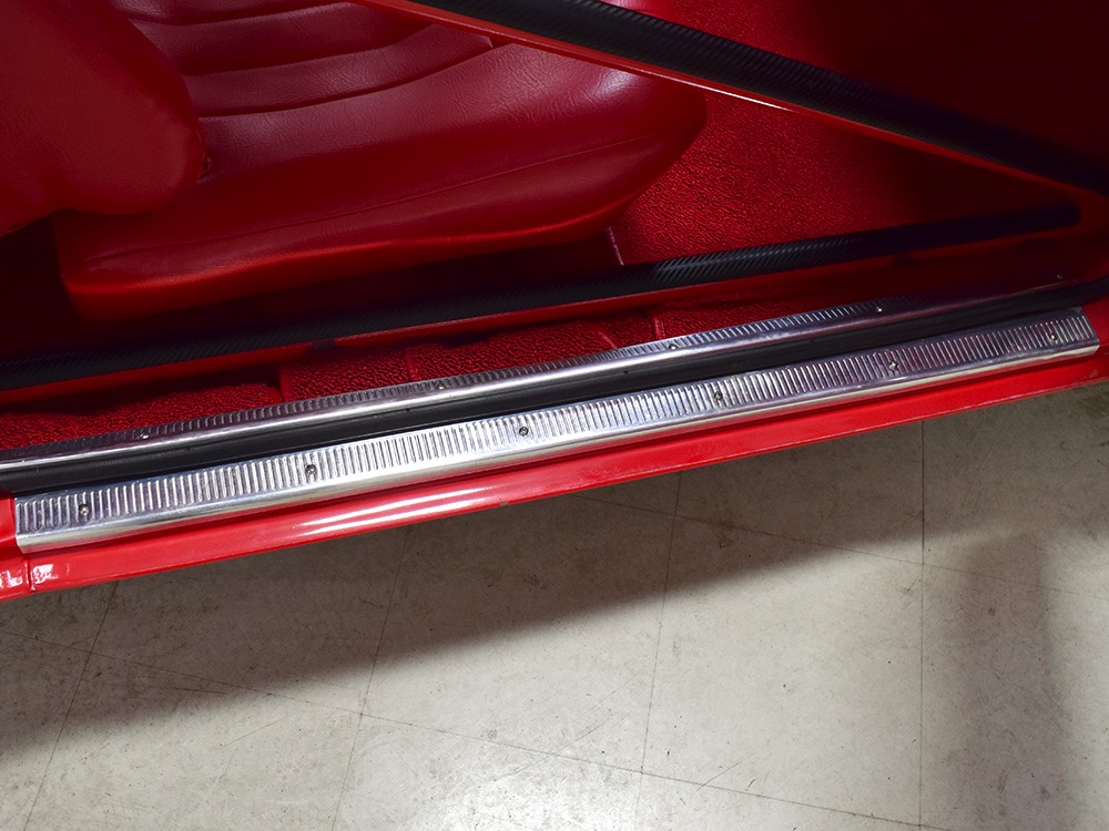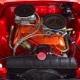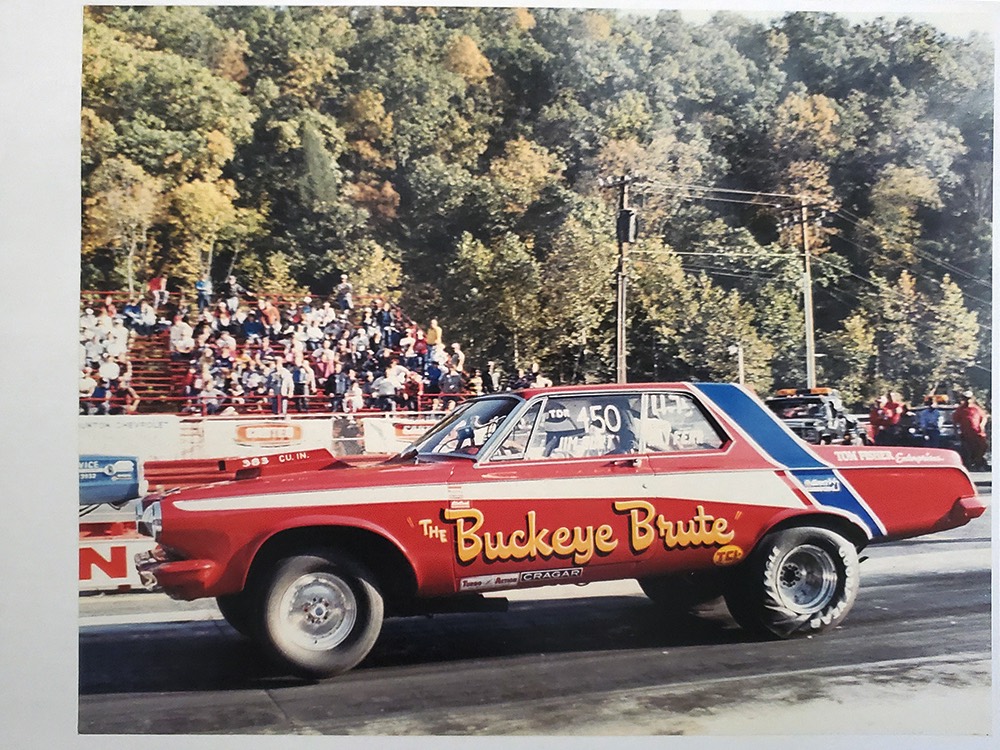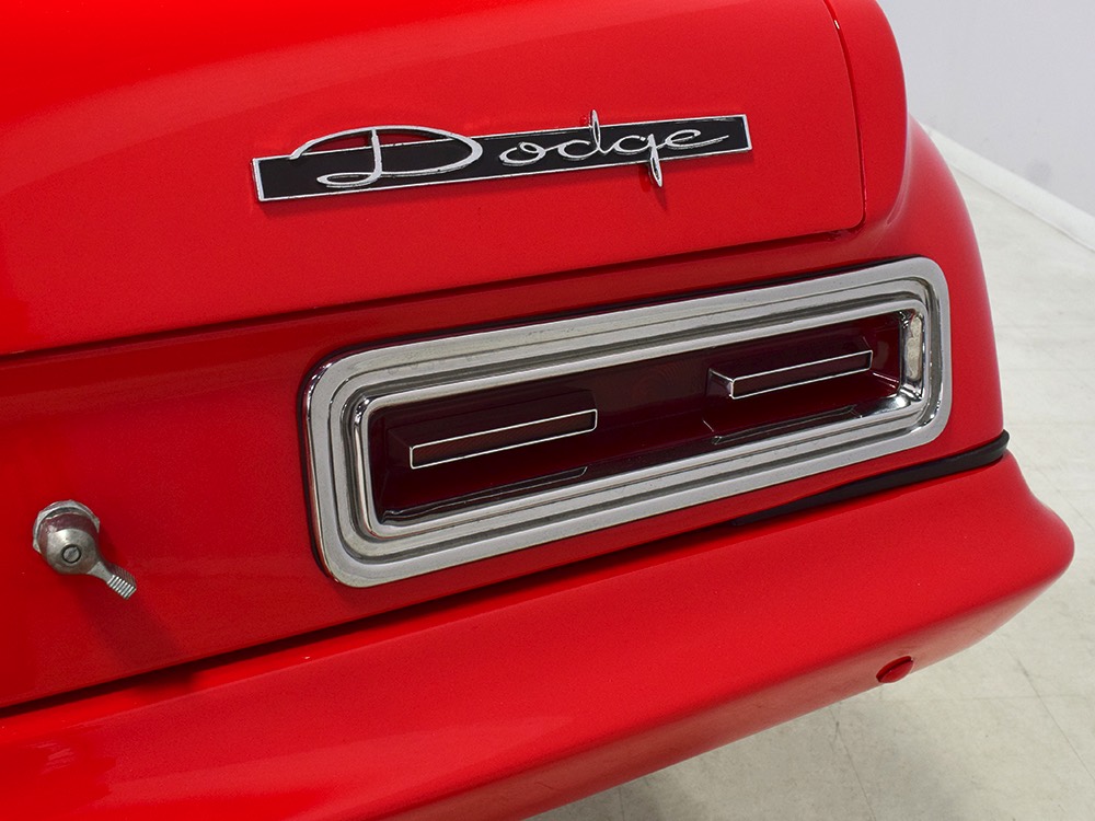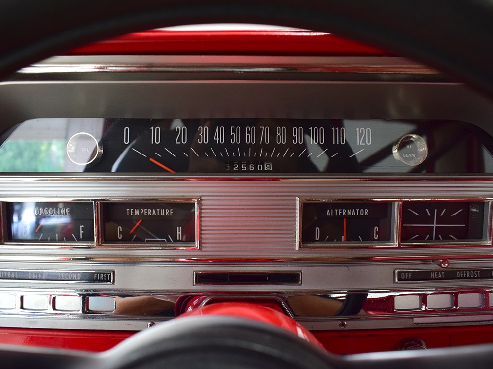 A few years ago, the vintage race car received a spectacular rotisserie restoration to its current condition—it’s quite a bit better than new in just about every way. Because it spent much of its life on the track, it shows just 32,560 original miles and it has never been wrecked or rusty so it’s still carrying all its original sheetmetal. Of course, some of that sheetmetal has been skillfully modified, including the quarters which now house some large-by-huge meats, but none of the changes jump out at you as radical (well, not in terms of the sheetmetal, anyway). During the restoration, all the various bumps and bruises that it might have suffered during its life on the track were expertly exorcised from the bodywork and it presents now as a show-quality car that’s simply stunning from any angle. It’s wearing PP1 Vermillion paint, just as it did in 1963, although there was never a factory paint job that glowed like this one. It remains all steel, including the hood wearing Super Stock scoops that force-feed the those two big Holley carbs underneath. The Polara styling in 1963 can’t quite be called beautiful, but it is certainly purposeful and I think I like that better—this is what we call an “industrial strength” Mopar. A simple strip of stainless side trim highlights the simple hardtop bodywork, along with bright window surrounds and the beautifully restored grille up front. Both front and rear bumpers have been painted to match, but the look works on this car and doesn’t stand out as non-authentic. And while this car wore graphics and sponsor decals almost its entire life, the only flash it carries today are “The Buckeye Brute” script on the hood scoop.