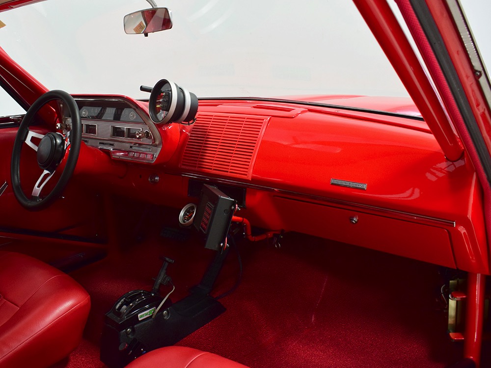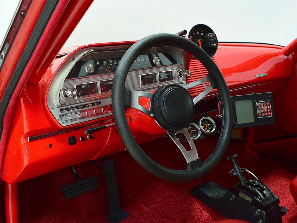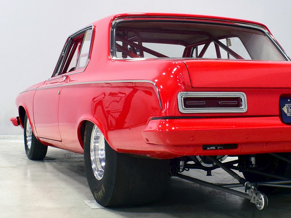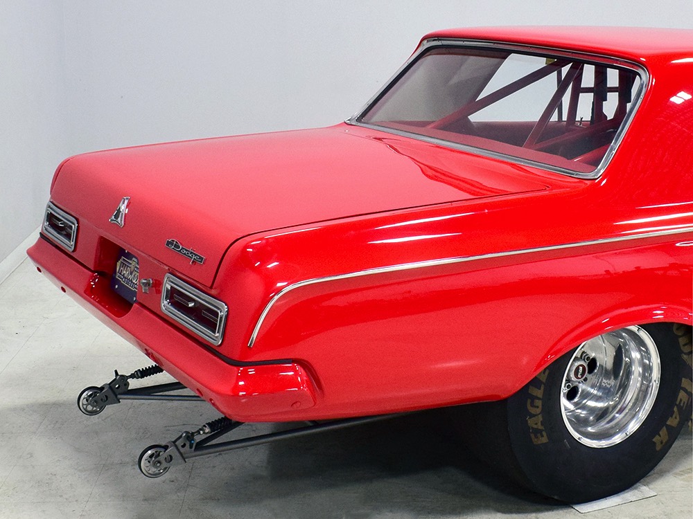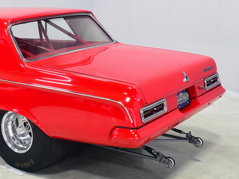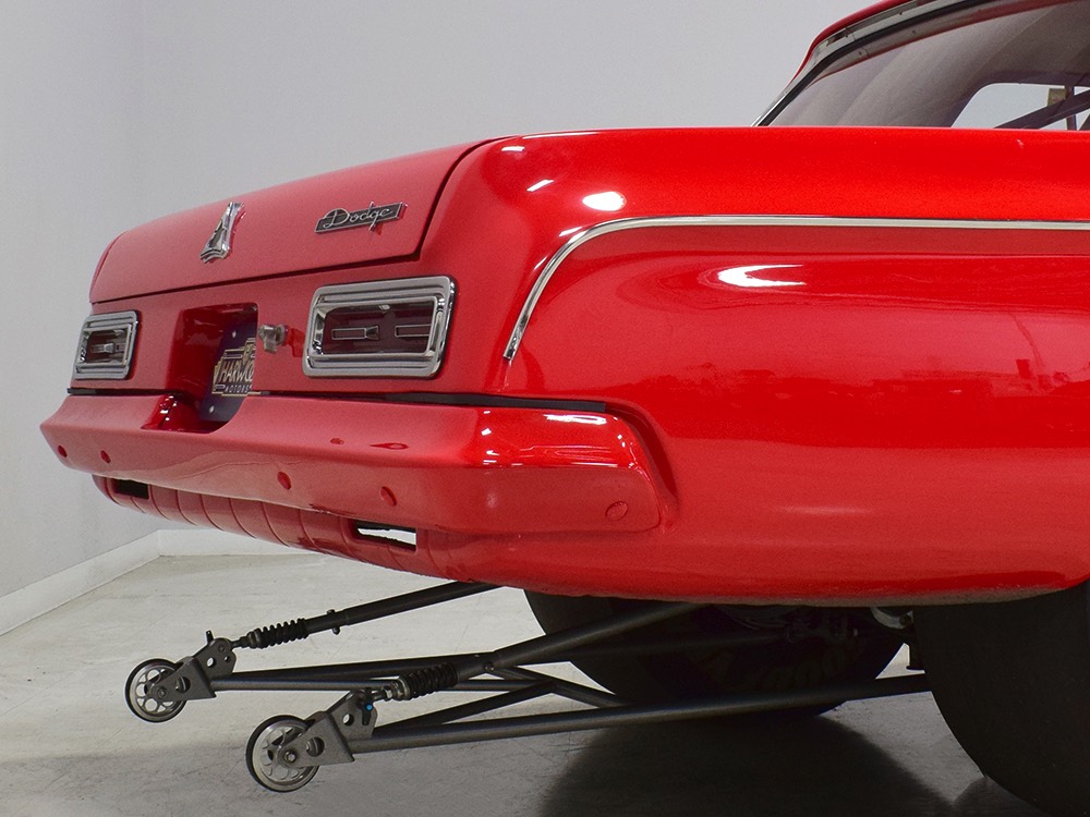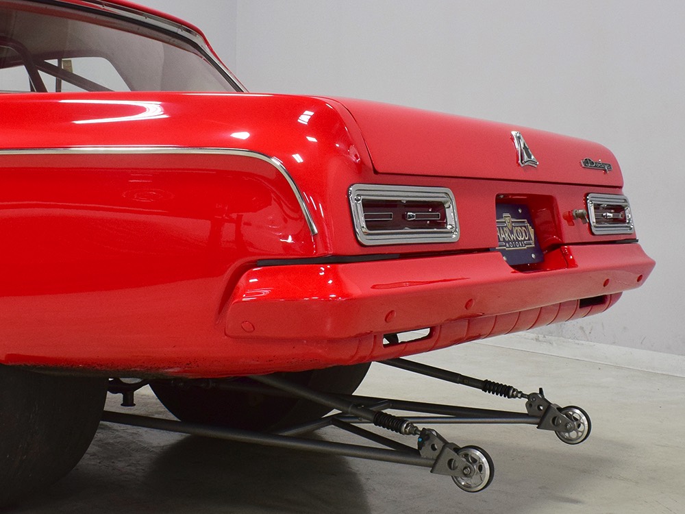 This Max Wedge Polara neatly straddles the street/race fence, bringing enough power to be competitive but with a full interior it’s reasonably comfortable as well. Of course, there’s a full NHRA-spec cage, which is as expertly fabricated as the rest of the car, but it also includes twin bucket seats, full carpets, reproduction door panels, and the factory dash and gauges, all restored. For race purposes, there’s also an Auto Meter Monster tach and shift light on top of the dash, a set of auxiliary gauges underneath, and a programmable delay box. Sadly, the factory pushbutton shifter for the TorqueFlite automatic is gone, replaced by a trick shifter on the floor that makes managing the manual valve body easy. Obviously the back seat is gone, but the tubs and interior panels are expertly upholstered to look almost OEM and there’s enough sound-deadening materials underneath to at least give the impression that this car was meant for the street. The trunk is equally well-finished and includes a 3-gallon racing fuel cell, fuel pump, and battery with shut-off switch, but it’s worth noting that a 16-gallon fuel cell is included with the car and it bolts right in with no modifications should you want to make this a street car.