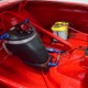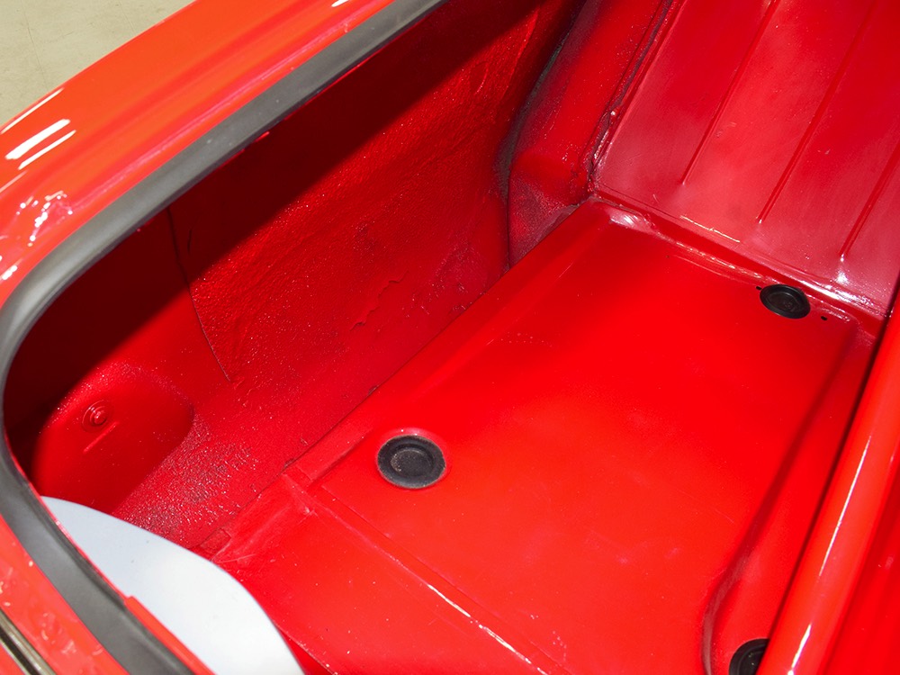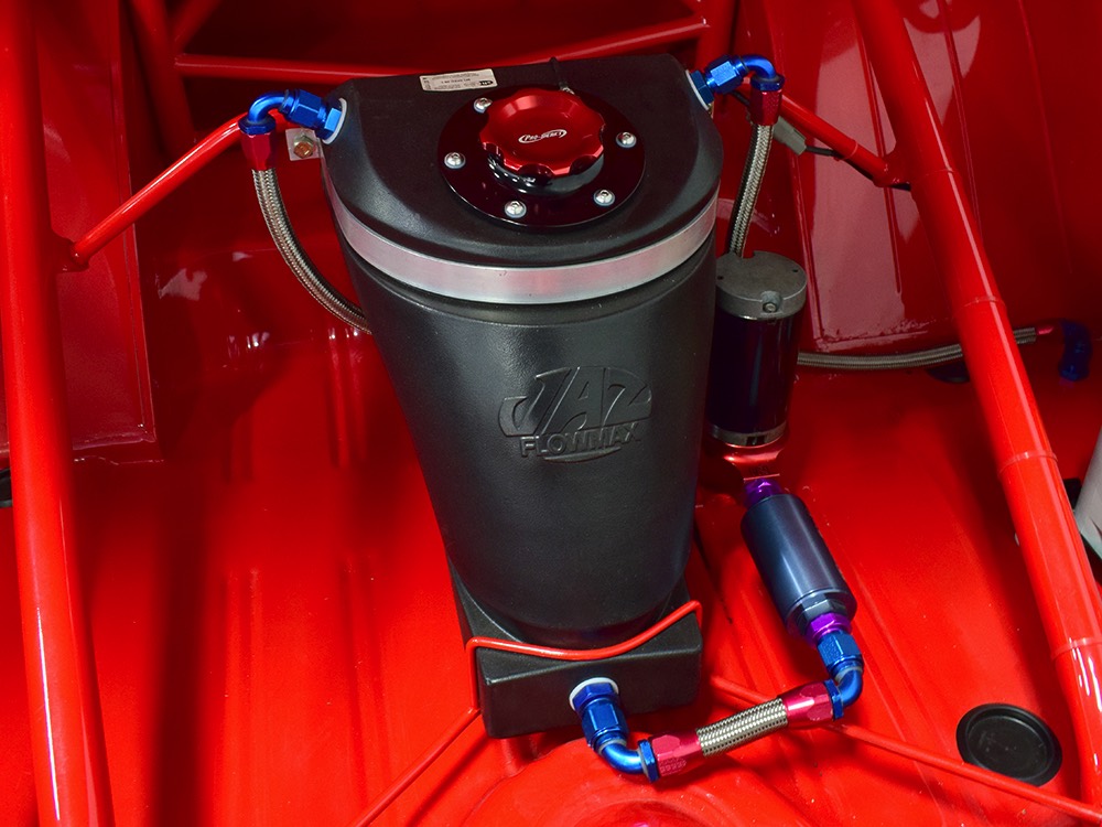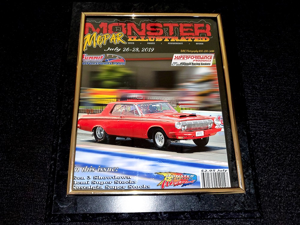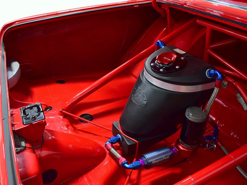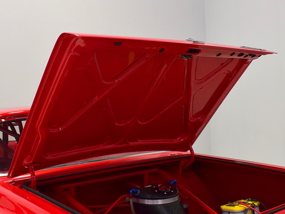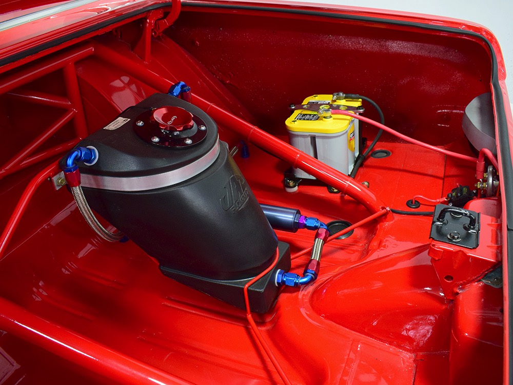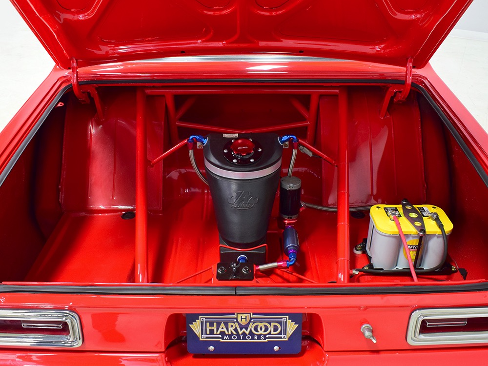 This Max Wedge Polara neatly straddles the street/race fence, bringing enough power to be competitive but with a full interior it’s reasonably comfortable as well. Of course, there’s a full NHRA-spec cage, which is as expertly fabricated as the rest of the car, but it also includes twin bucket seats, full carpets, reproduction door panels, and the factory dash and gauges, all restored. For race purposes, there’s also an Auto Meter Monster tach and shift light on top of the dash, a set of auxiliary gauges underneath, and a programmable delay box. Sadly, the factory pushbutton shifter for the TorqueFlite automatic is gone, replaced by a trick shifter on the floor that makes managing the manual valve body easy. Obviously the back seat is gone, but the tubs and interior panels are expertly upholstered to look almost OEM and there’s enough sound-deadening materials underneath to at least give the impression that this car was meant for the street. The trunk is equally well-finished and includes a 3-gallon racing fuel cell, fuel pump, and battery with shut-off switch, but it’s worth noting that a 16-gallon fuel cell is included with the car and it bolts right in with no modifications should you want to make this a street car.