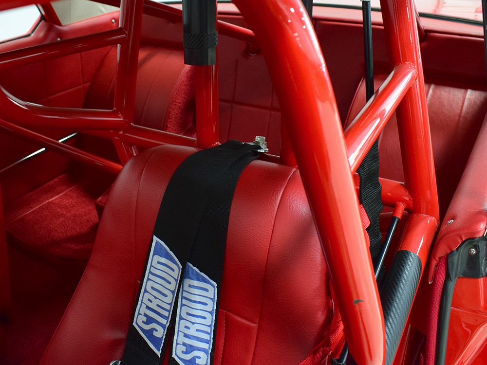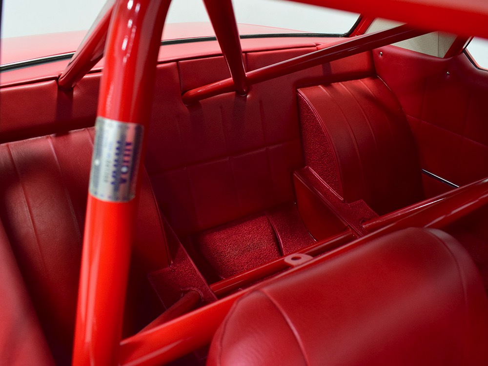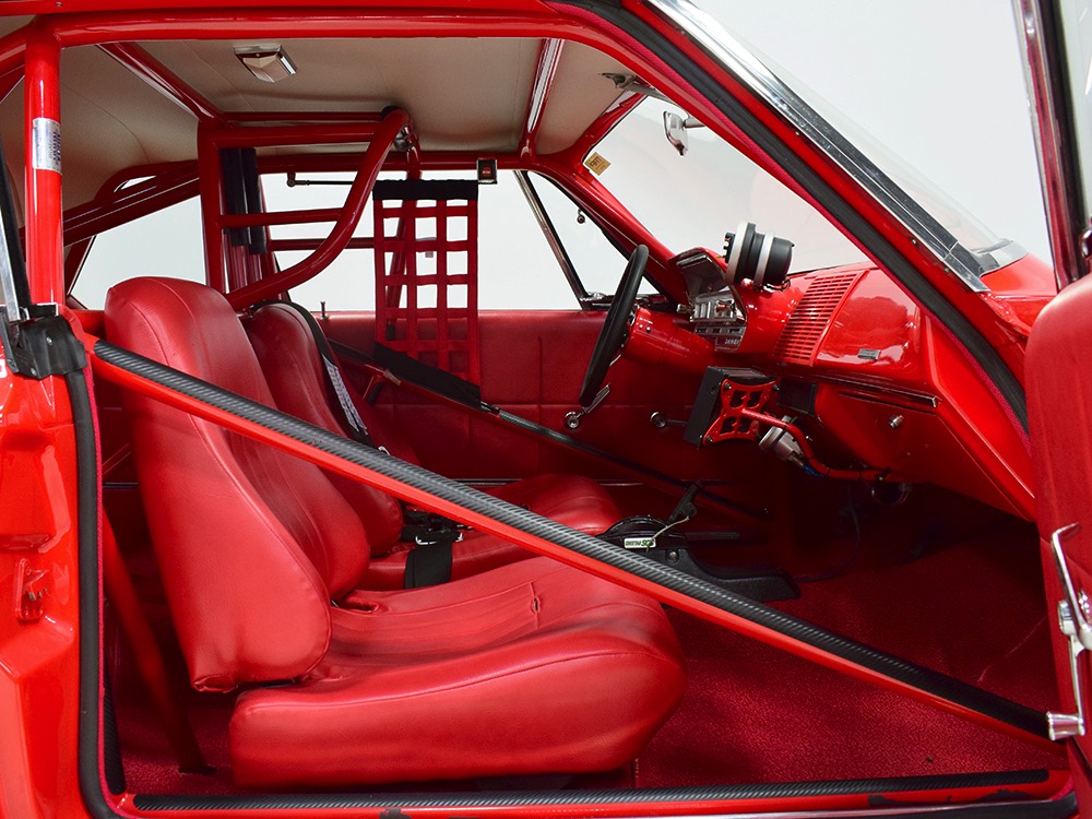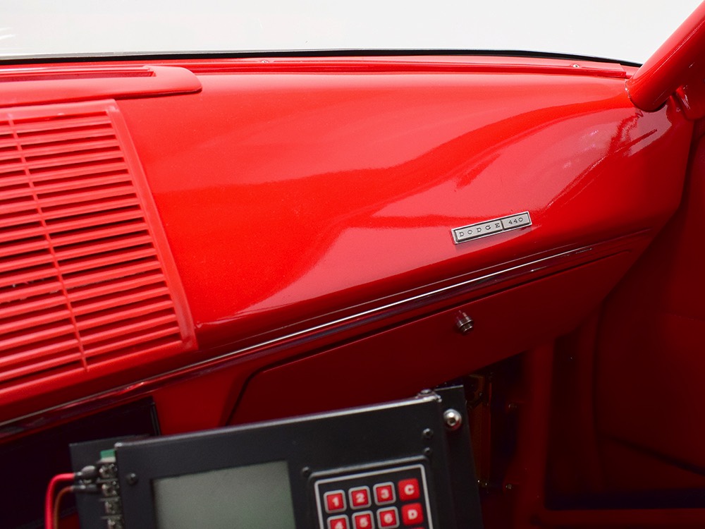 For much of its racing life, this Polara carried a 383 cubic inch V8. That seems kind of anachronous in a car built for combat with a 426 cubic inch powerplant by the factory, but it meant that the original Max Wedge motor was never blown up. When restoration time came, it was rebuilt and dropped back between the fenders, just as it should be. And make no mistake, this isn’t some tame version of a ‘60s performance car, it’s NASTY. 13:1 compression, a seriously big cam, forged internals, electronic ignition, and those two big Demon double pumpers on top of the factory intake. This ain’t no cruise night special, although it was built with streetability in mind. It starts easily, idles reasonably well, and is properly dialed-in so it runs like, well, like a full-tilt race car should. Those gorgeous stainless headers wrap into the fenders and there is no exhaust system, so it sounds like the end of the world when it cackles to life—yeah, if you want this to be a street car, you’ll probably need to add an exhaust system. It’s beautifully detailed to replicate most of the factory look, including the bright orange engine enamel, reproduction “Super Stock II” valve cover decals, and even a proper 26-inch radiator up front, not some aluminum piece. Of course, it does have an electric water pump and fan, a big transmission cooler, and the various bits required if you’re going to put it safely on the track. It’s nevertheless impressive as hell to pull the pins and lift that hood.