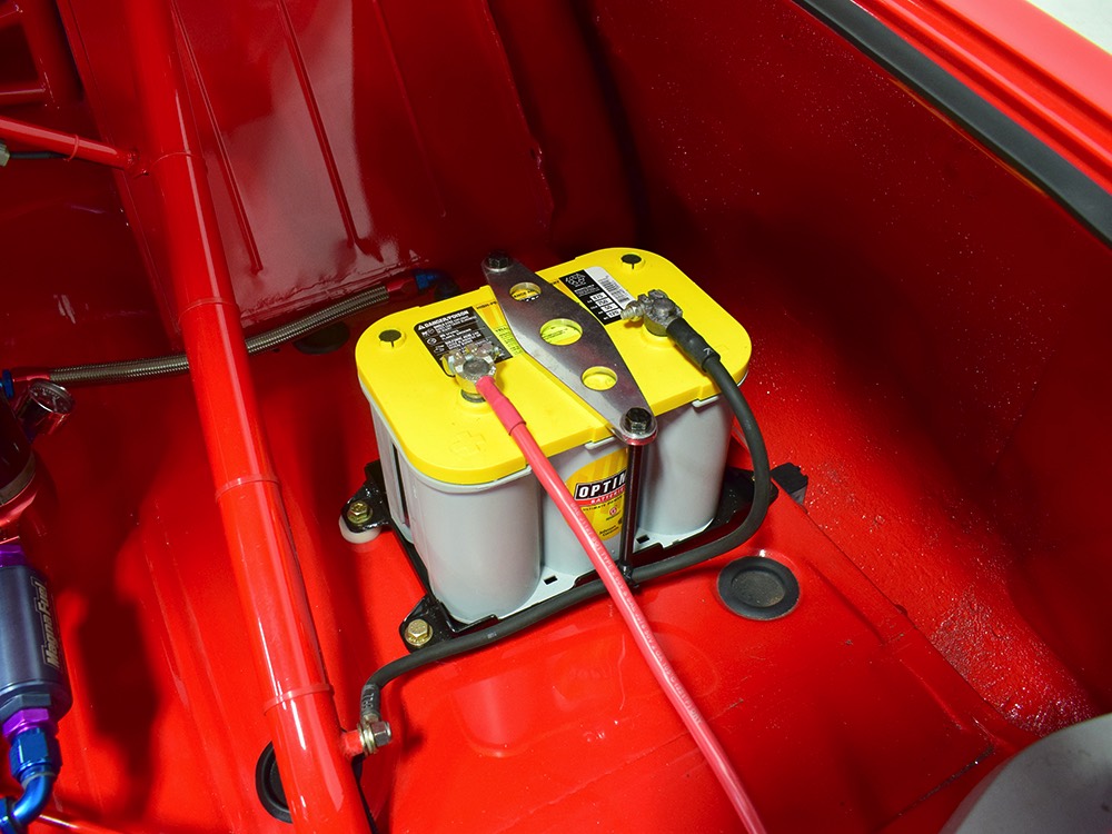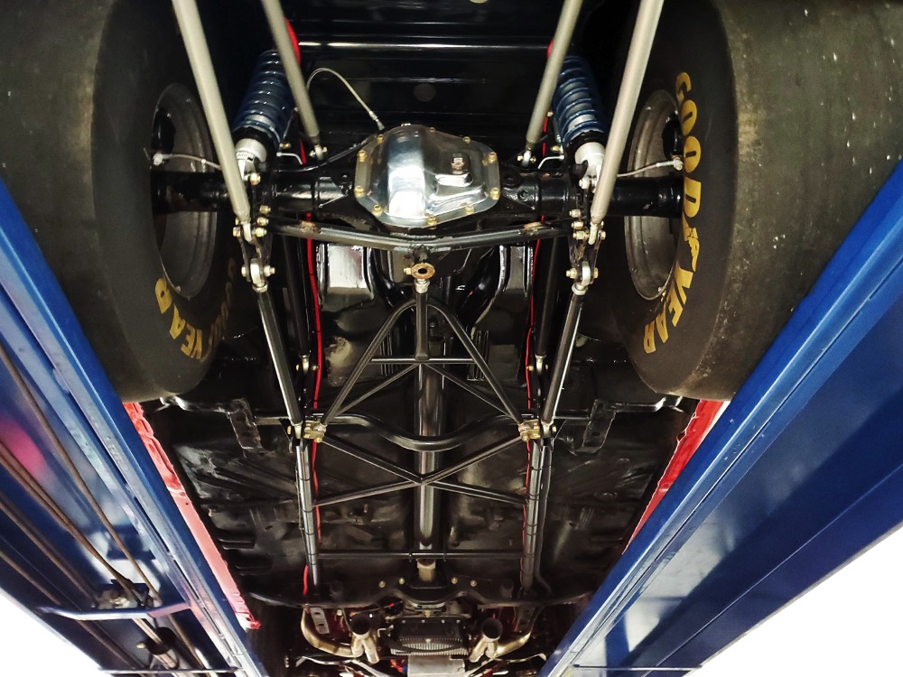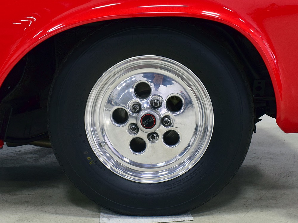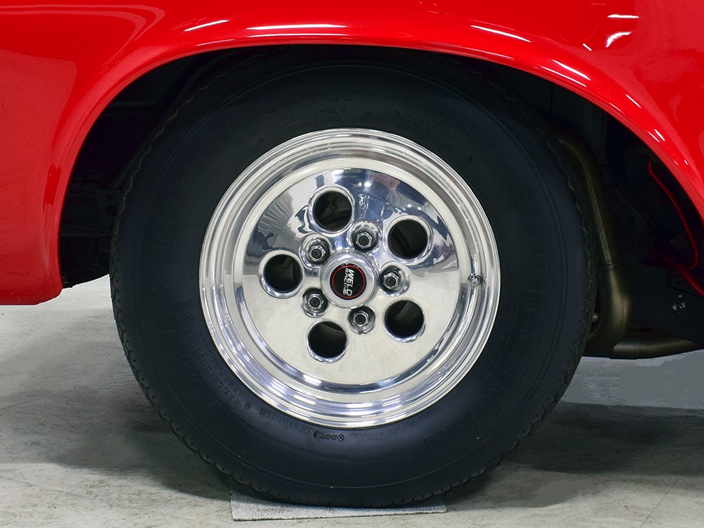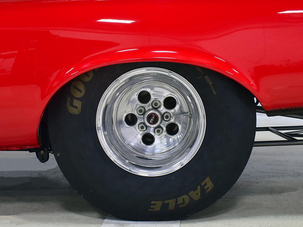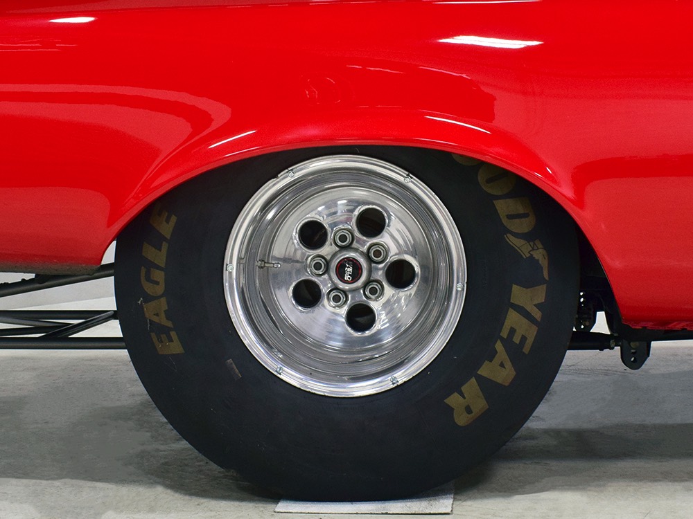 The chassis was heavily fortified to work on the track, including a full back-half conversion and a mini frame connecting the front and rear subframes (remember the Polara was a unit-body car). The front suspension remains stock, including the torsion bars, and given how fast this sucker is, you’ll be glad to see disc brakes at all four corners. Steering is manual, but if your first worry is whether your wife can handle it, it’s probably not the right car for you. The 3-speed TorqueFlite automatic transmission features a high-stall torque converter and a reverse manual valve body (race car, remember), as well as a deeper pan and a blow-proof strap. Shockingly, the rockers are original and you can still see the factory spot welds running front to rear, and even most of the floors are untouched. The rear axle is a heavily modified and reinforced Dana 60 packed with 4.56 gears on a locker, custom axles, and hanging on a trick 5-link setup with adjustable coil-over shocks. Oh, and a set of wheelie bars, and I’m guessing you’ll be glad to have them sooner or later. And just so you don’t think this car is a poser, we left the rubber on the quarters and trunk floor. 15-inch Weld wheels are a traditional look and carry 28x7.50-15 Mickey Thompson rubber up front and 32x14.50-15 Goodyear meats at the business end.