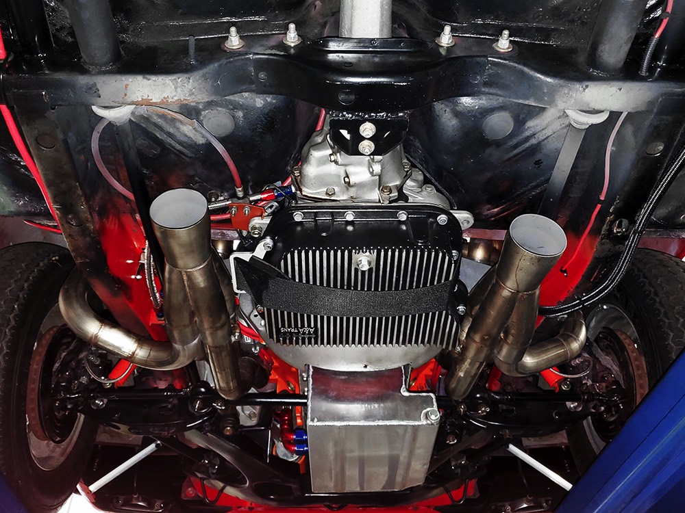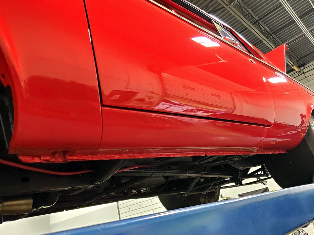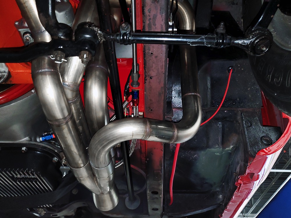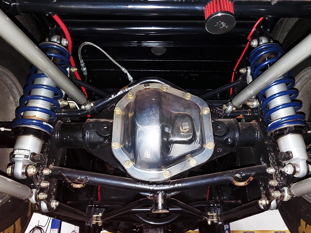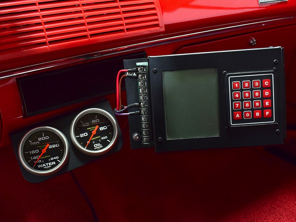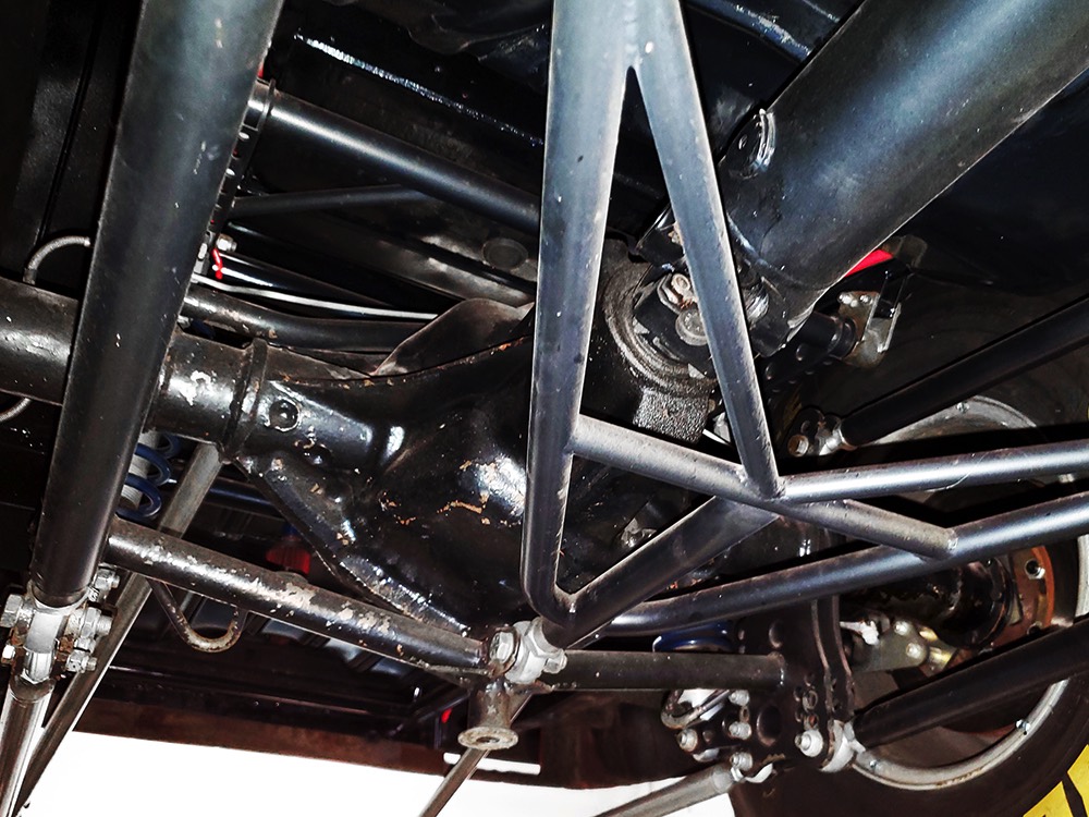 The chassis was heavily fortified to work on the track, including a full back-half conversion and a mini frame connecting the front and rear subframes (remember the Polara was a unit-body car). The front suspension remains stock, including the torsion bars, and given how fast this sucker is, you’ll be glad to see disc brakes at all four corners. Steering is manual, but if your first worry is whether your wife can handle it, it’s probably not the right car for you. The 3-speed TorqueFlite automatic transmission features a high-stall torque converter and a reverse manual valve body (race car, remember), as well as a deeper pan and a blow-proof strap. Shockingly, the rockers are original and you can still see the factory spot welds running front to rear, and even most of the floors are untouched. The rear axle is a heavily modified and reinforced Dana 60 packed with 4.56 gears on a locker, custom axles, and hanging on a trick 5-link setup with adjustable coil-over shocks. Oh, and a set of wheelie bars, and I’m guessing you’ll be glad to have them sooner or later. And just so you don’t think this car is a poser, we left the rubber on the quarters and trunk floor. 15-inch Weld wheels are a traditional look and carry 28x7.50-15 Mickey Thompson rubber up front and 32x14.50-15 Goodyear meats at the business end.