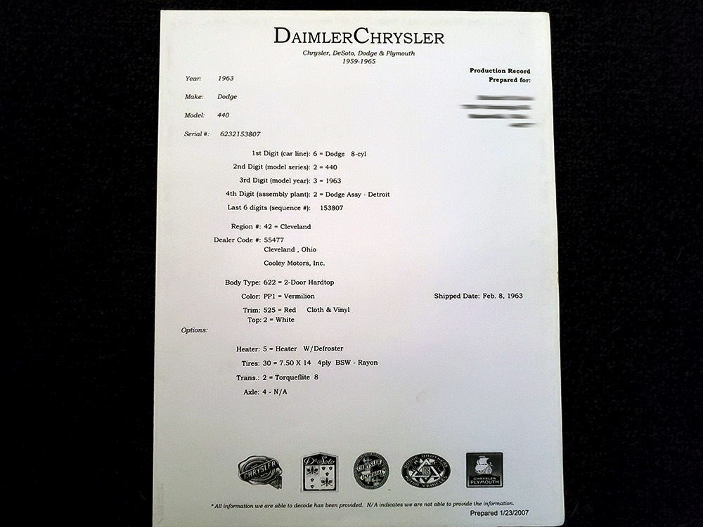 Documentation is extensive, including period photos, Chrysler Corporation documentation and build card, a Max Wedge manual, restoration photos, and more.