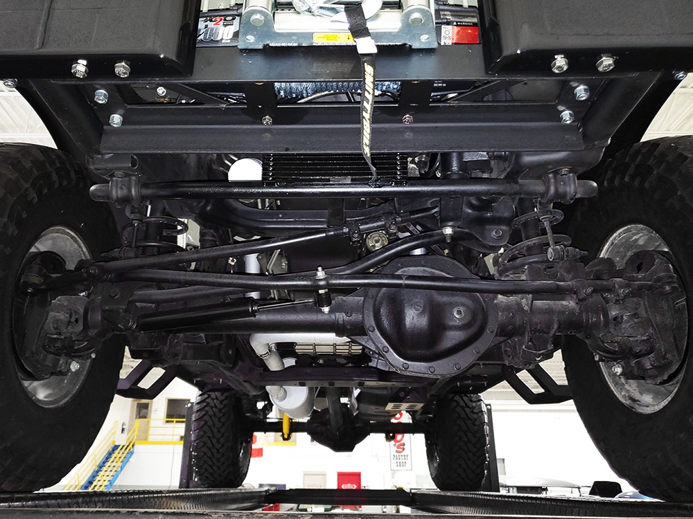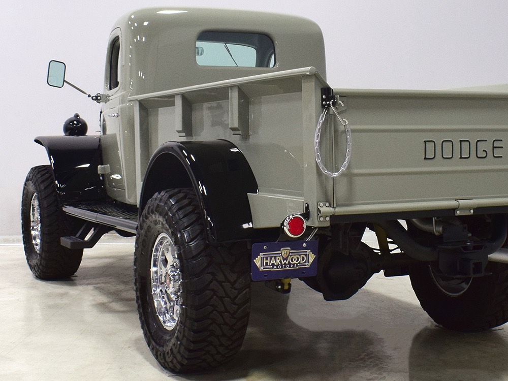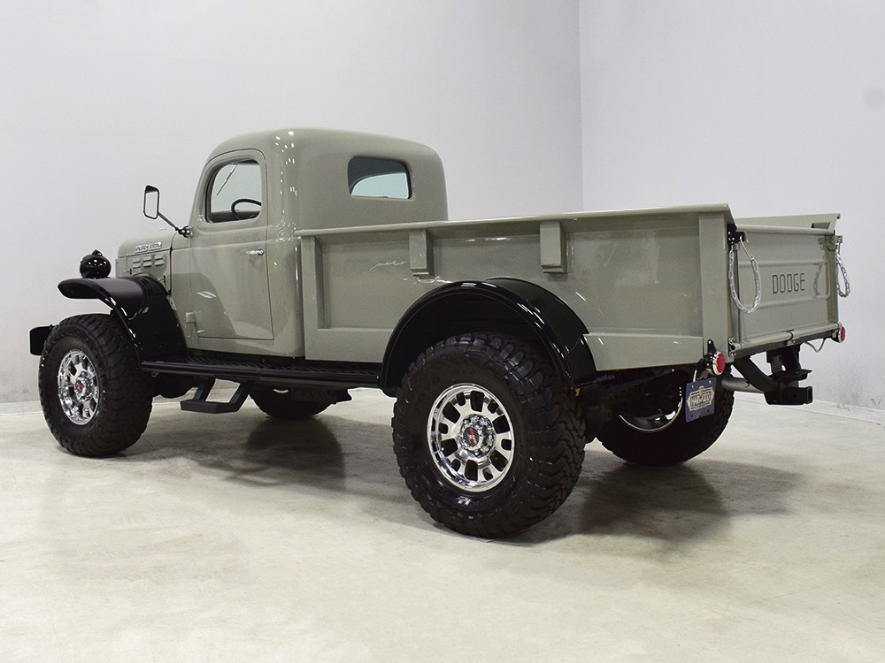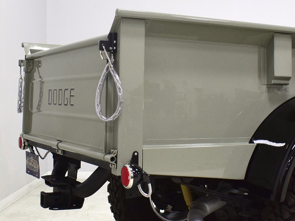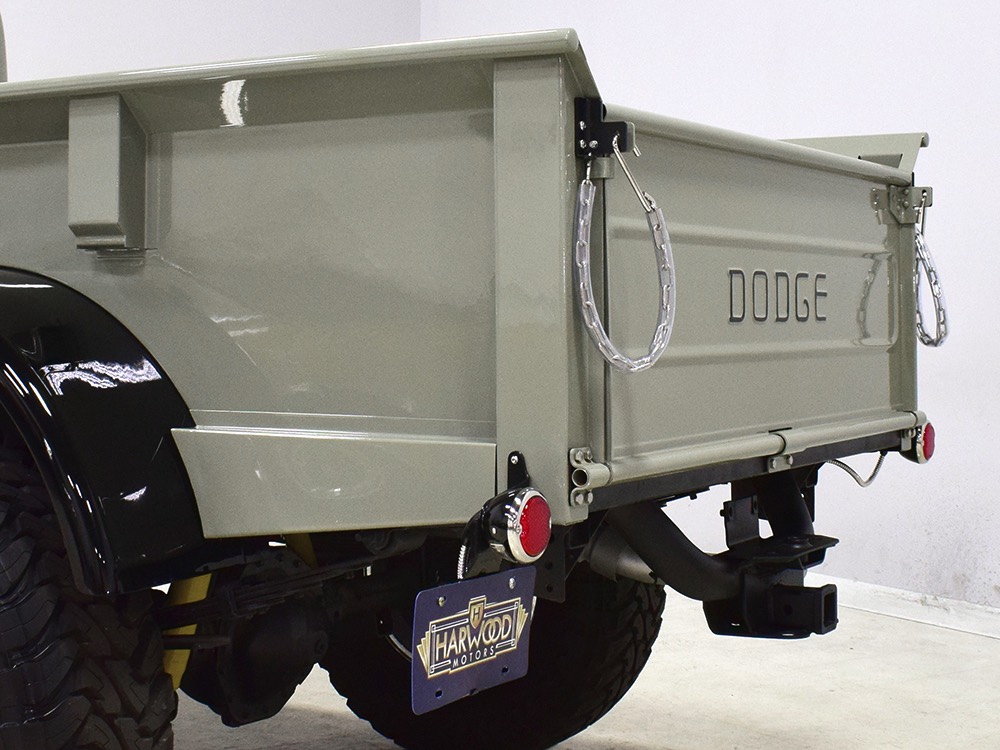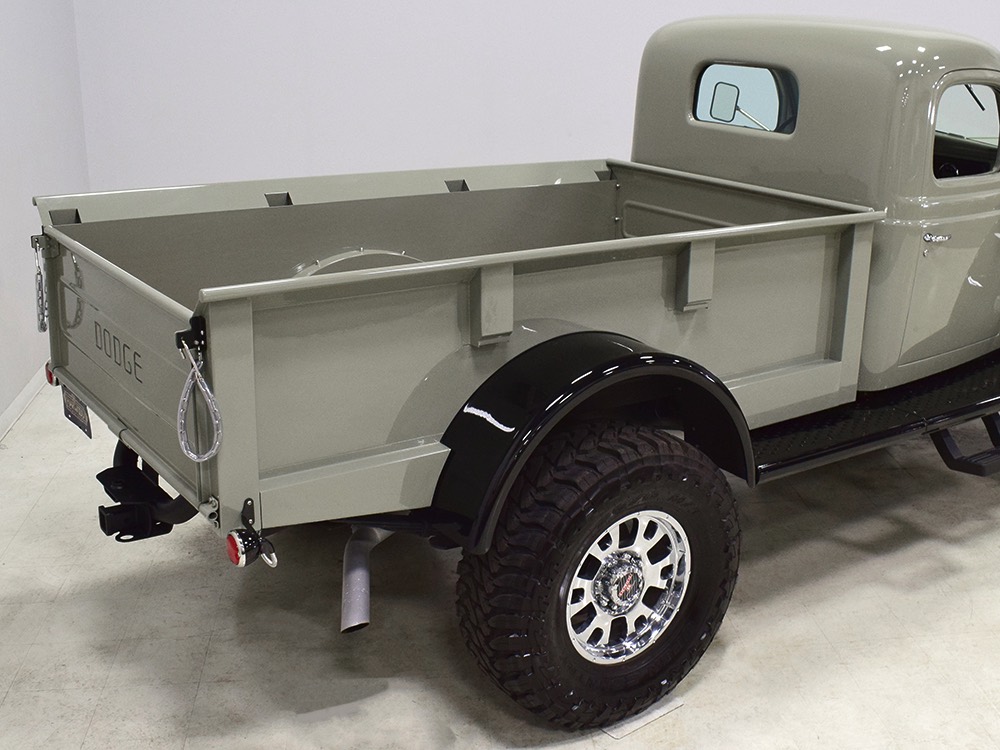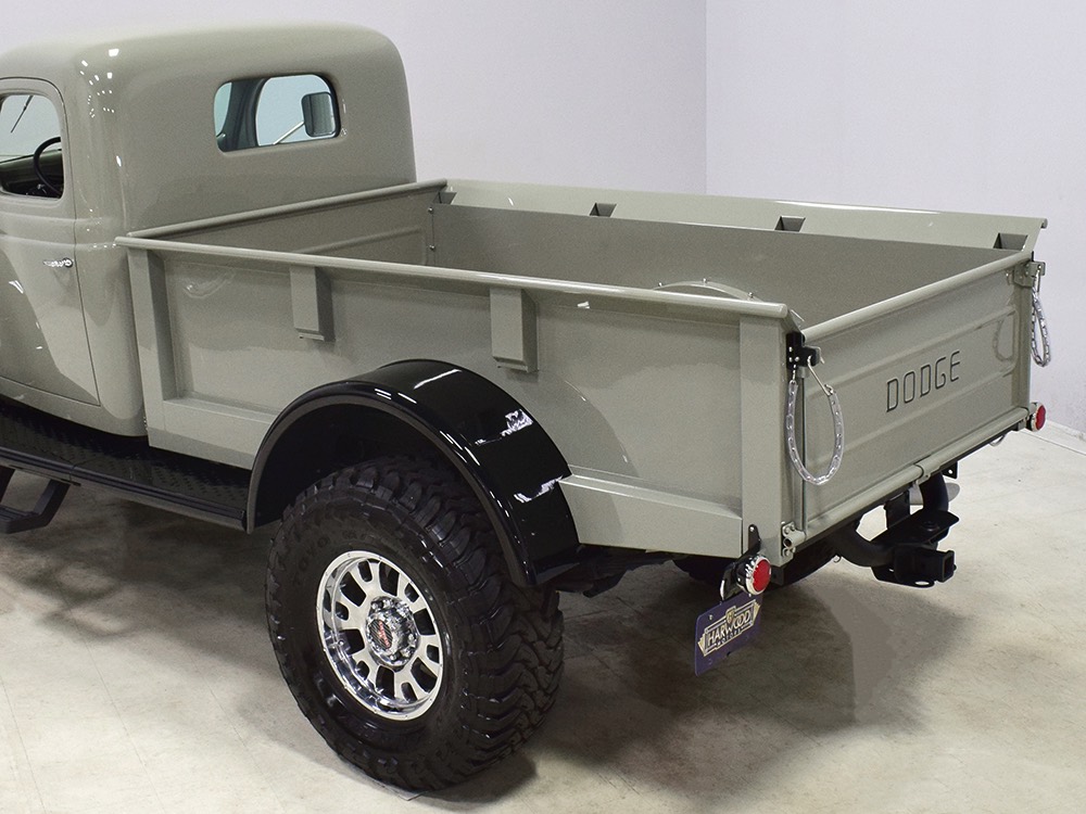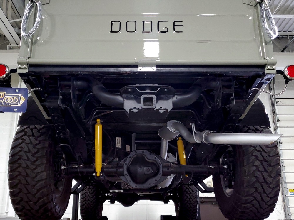 The chassis was extensively modified but the goal was to keep it as OEM as possible. So while it was shortened and reinforced, it retains the original suspension, brakes, steering, axles, and other hardware. In fact, the factory-fresh mission even extended to sourcing a gas tank from a regular cab Ram and modifying the original exhaust system to accommodate the shorter wheelbase. Impressive! The 545RFE automatic overdrive transmission is the same one that serves so reliably in the heavy-duty 3500 Rams and with a deep overdrive gear, it makes this Power Wagon an effortless highway cruiser. Front and rear axles are stock Ram 3500 as well, an AAM 9.25-inch Chrysler unit up front and a monstrous 10.5-inch AAM Chrysler axle in back, all fitted with 4.10 gears. In between there’s an NV271D transfer case with shift-on-the-fly capabilities (you’ll note this truck does without the pesky manual locking front hubs) and factory driveshafts that were custom shortened to work on the shorter wheelbase. With factory shocks, springs, and bushings, ride quality is exceptional for a Power Wagon yet it’ll still haul stuff like a 1-ton pickup (although the bed is just so beautiful, its hauling days are probably over). Steering is light and effortless and even with the giant 37x13.50-18 off-road tires, it tracks beautifully on the highway. Even the factory Class IV receiver hitch made the conversion intact, so this truck can pull far more trailer than its ancestors.