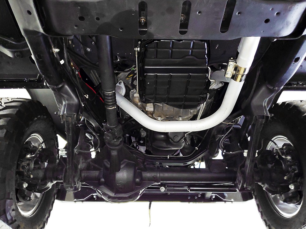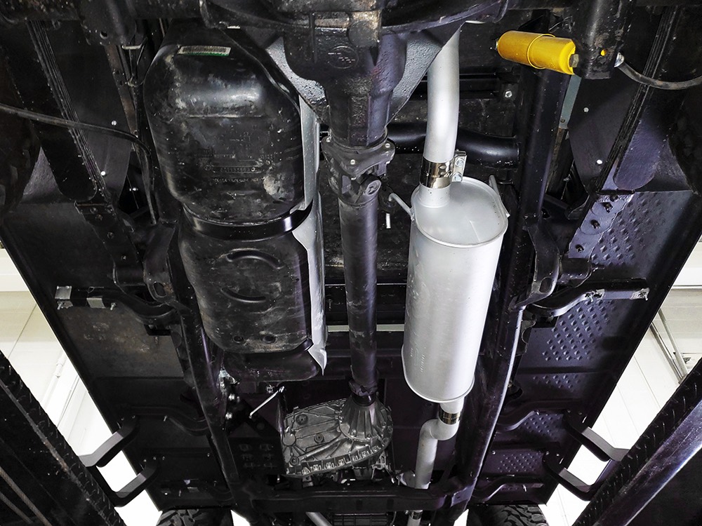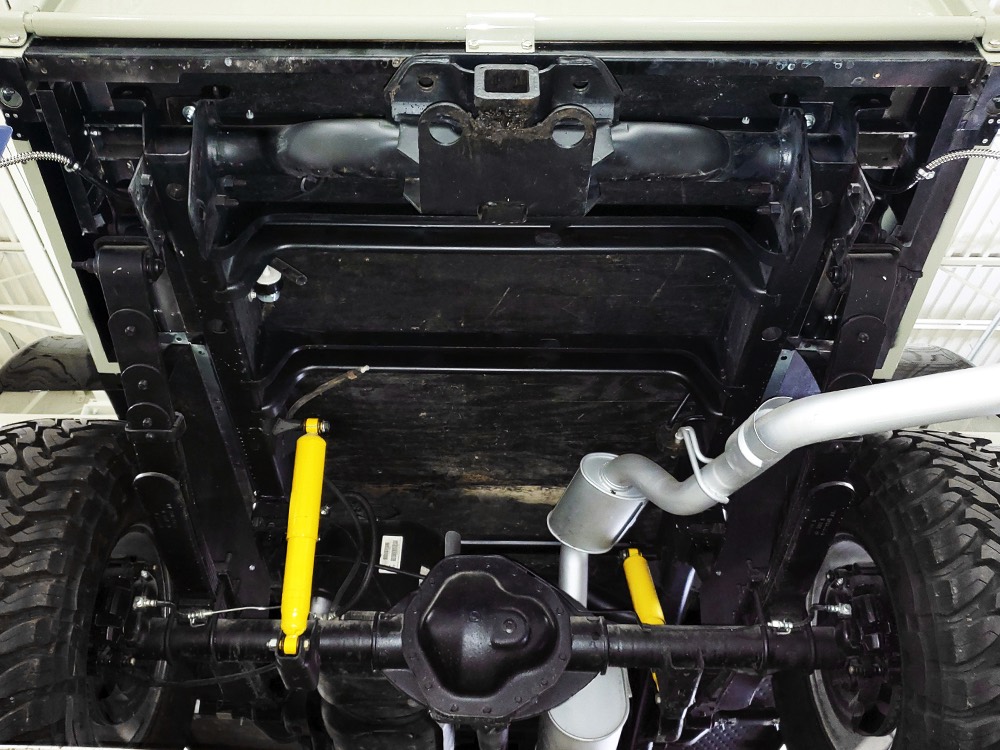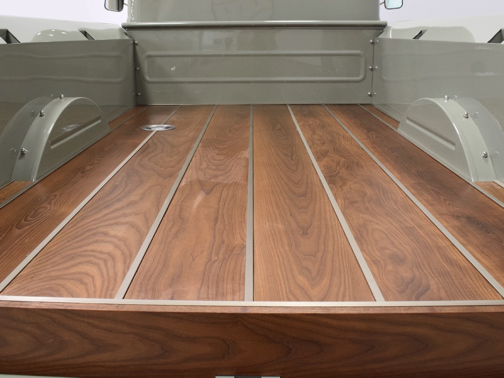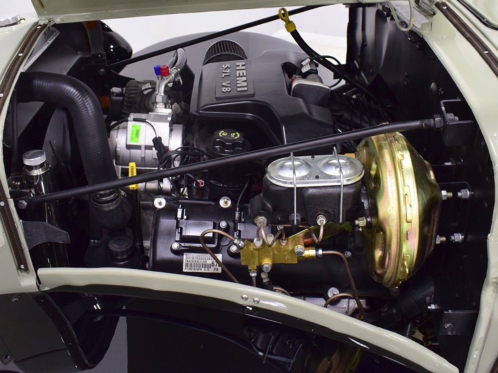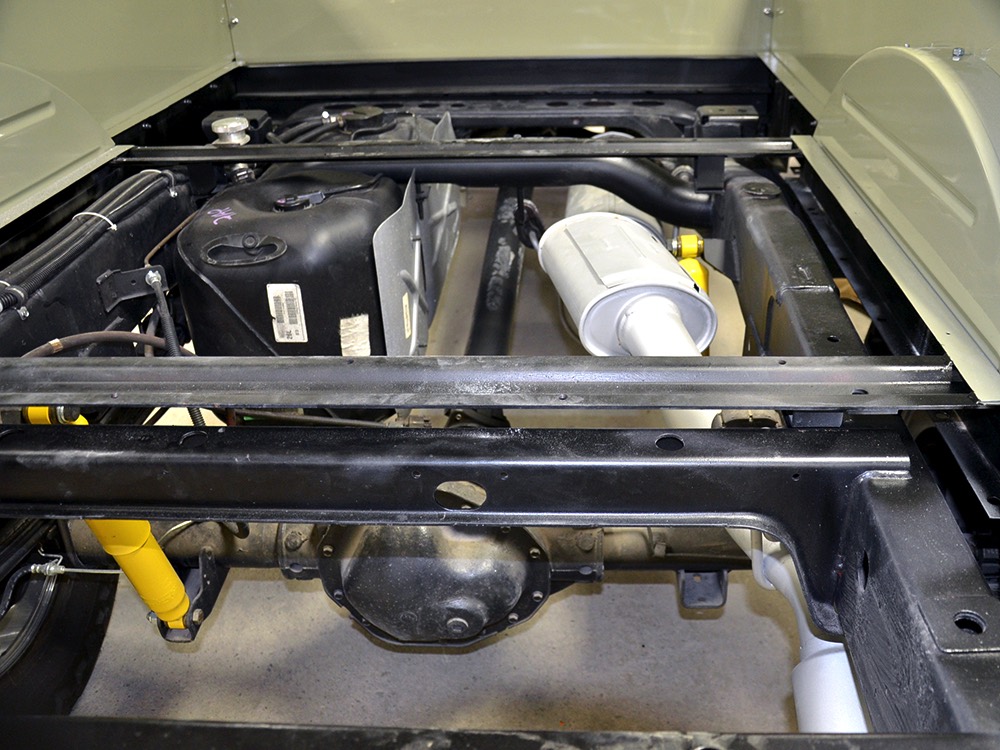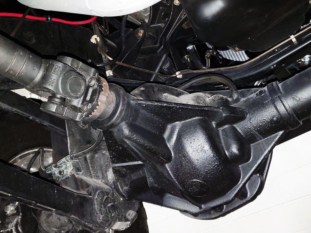 The chassis was extensively modified but the goal was to keep it as OEM as possible. So while it was shortened and reinforced, it retains the original suspension, brakes, steering, axles, and other hardware. In fact, the factory-fresh mission even extended to sourcing a gas tank from a regular cab Ram and modifying the original exhaust system to accommodate the shorter wheelbase. Impressive! The 545RFE automatic overdrive transmission is the same one that serves so reliably in the heavy-duty 3500 Rams and with a deep overdrive gear, it makes this Power Wagon an effortless highway cruiser. Front and rear axles are stock Ram 3500 as well, an AAM 9.25-inch Chrysler unit up front and a monstrous 10.5-inch AAM Chrysler axle in back, all fitted with 4.10 gears. In between there’s an NV271D transfer case with shift-on-the-fly capabilities (you’ll note this truck does without the pesky manual locking front hubs) and factory driveshafts that were custom shortened to work on the shorter wheelbase. With factory shocks, springs, and bushings, ride quality is exceptional for a Power Wagon yet it’ll still haul stuff like a 1-ton pickup (although the bed is just so beautiful, its hauling days are probably over). Steering is light and effortless and even with the giant 37x13.50-18 off-road tires, it tracks beautifully on the highway. Even the factory Class IV receiver hitch made the conversion intact, so this truck can pull far more trailer than its ancestors.