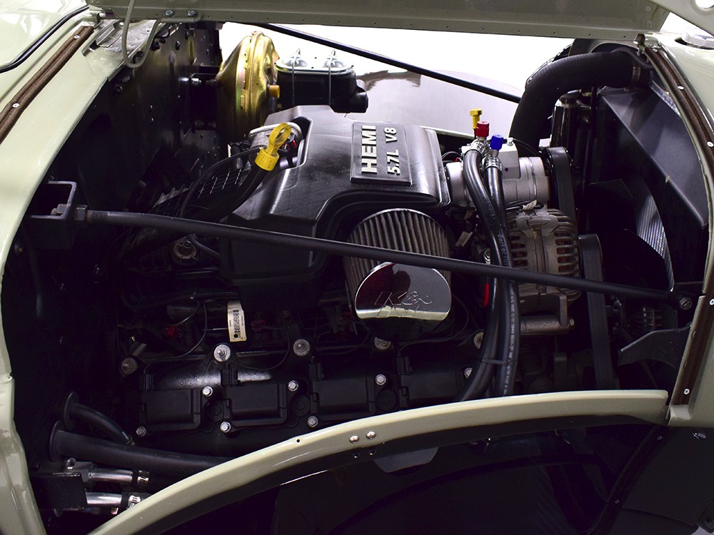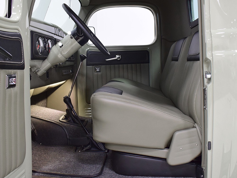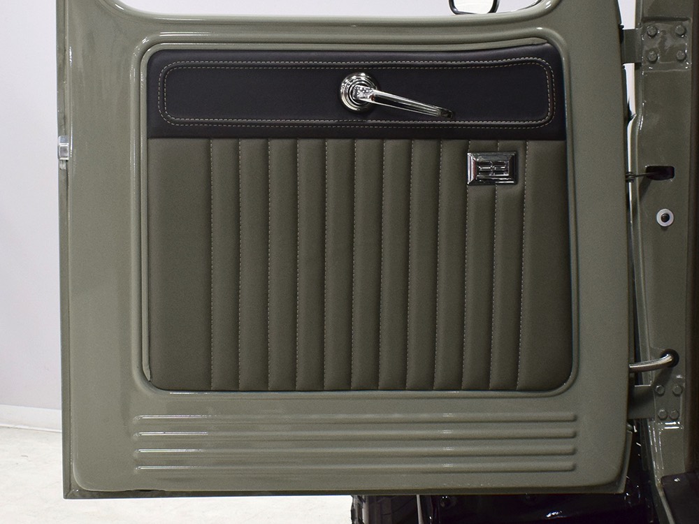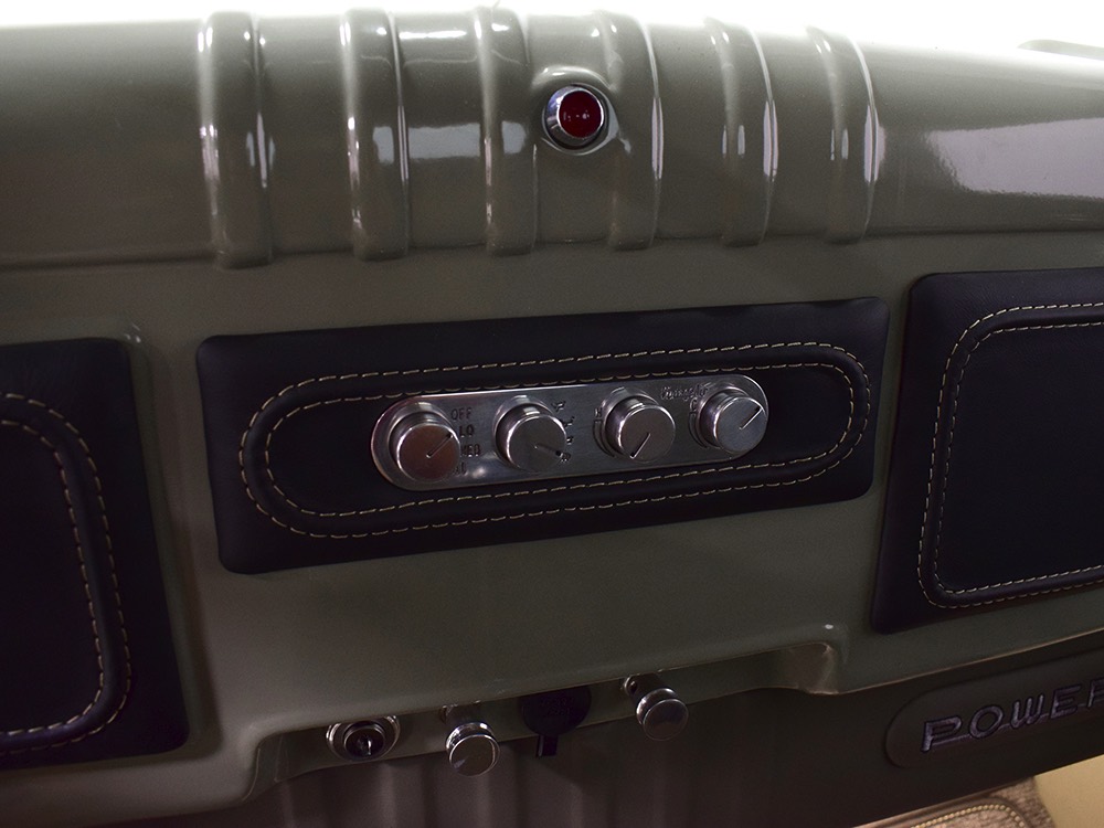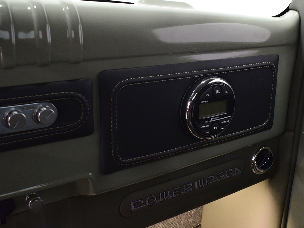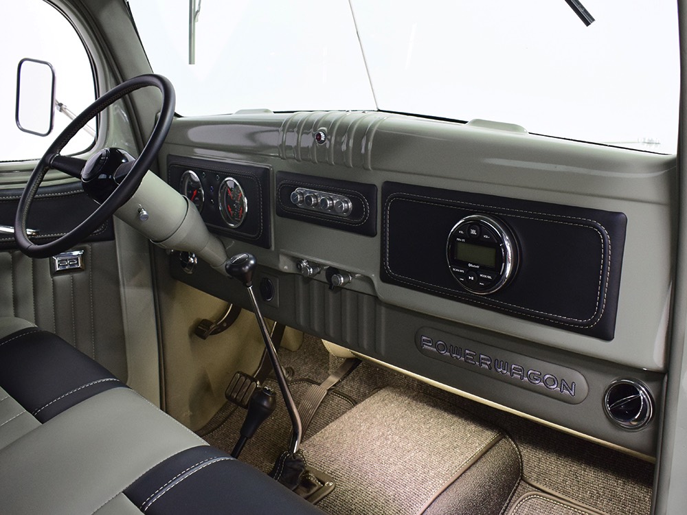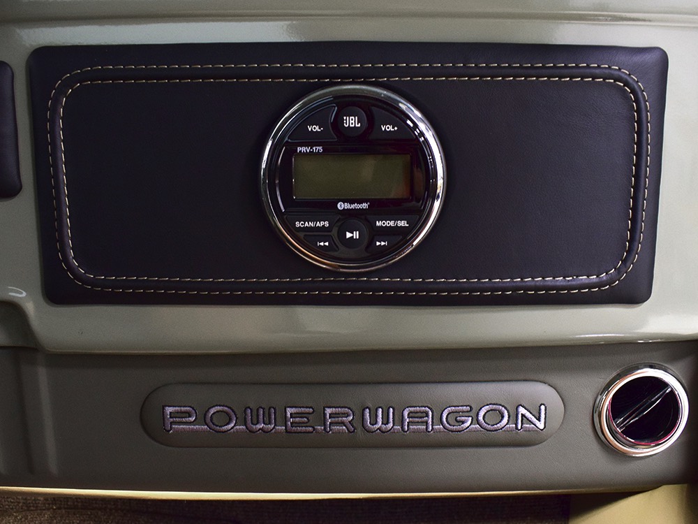 The interior is the most stunning Power Wagon driver’s compartment we’ve seen yet, beautifully crafted by Johnny Miller, whose work is legendary in the hot rod community. Black and green leather that’s just a shade darker than the bodywork is stitched onto aluminum sub-structures custom built just for this truck. Two layers of sound deadening insulation make the cab quiet and comfortable and a custom Glide bench seat was reworked to add legroom to the compact cab. A tilt steering column painted to match carries a modified 1940 Ford steering wheel with a leather-wrapped rim and a tall Lokar shifter looks like a vintage lever for the original 4-speed. Bright Auto Meter gauges are set into a leather gauge panel with more beautiful stitchwork and a matching panel on the passenger side houses the entertainment system with Bluetooth connectivity. Note the POWER WAGON emblems, which are stitched, not decals, and the subtle LED fixtures under the dash that provide awesome ambient lighting. A factory shifter for the 4-wheel-drive transfer case was modified to tuck in tight to the transmission tunnel and stay out of the way and even the pedals from the original Ram were retained, so it feels very OEM. Of course cold A/C and power windows are part of the package. Other details you might have missed: the Vee’d windshield, the custom panel that hides the A/C ducts, and the beautiful sculped headliner. It’s very impressive.