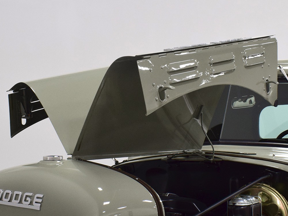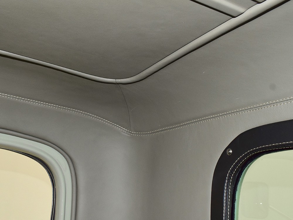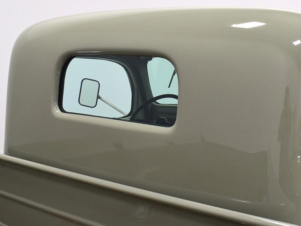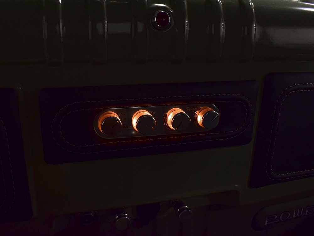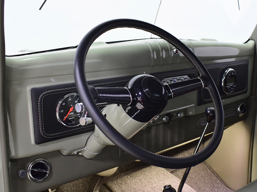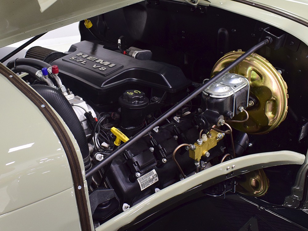 The interior is the most stunning Power Wagon driver’s compartment we’ve seen yet, beautifully crafted by Johnny Miller, whose work is legendary in the hot rod community. Black and green leather that’s just a shade darker than the bodywork is stitched onto aluminum sub-structures custom built just for this truck. Two layers of sound deadening insulation make the cab quiet and comfortable and a custom Glide bench seat was reworked to add legroom to the compact cab. A tilt steering column painted to match carries a modified 1940 Ford steering wheel with a leather-wrapped rim and a tall Lokar shifter looks like a vintage lever for the original 4-speed. Bright Auto Meter gauges are set into a leather gauge panel with more beautiful stitchwork and a matching panel on the passenger side houses the entertainment system with Bluetooth connectivity. Note the POWER WAGON emblems, which are stitched, not decals, and the subtle LED fixtures under the dash that provide awesome ambient lighting. A factory shifter for the 4-wheel-drive transfer case was modified to tuck in tight to the transmission tunnel and stay out of the way and even the pedals from the original Ram were retained, so it feels very OEM. Of course cold A/C and power windows are part of the package. Other details you might have missed: the Vee’d windshield, the custom panel that hides the A/C ducts, and the beautiful sculped headliner. It’s very impressive.