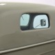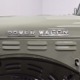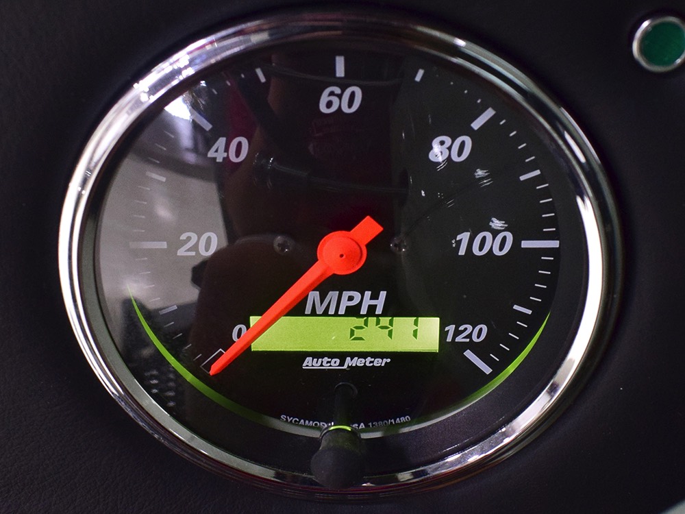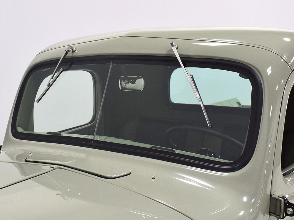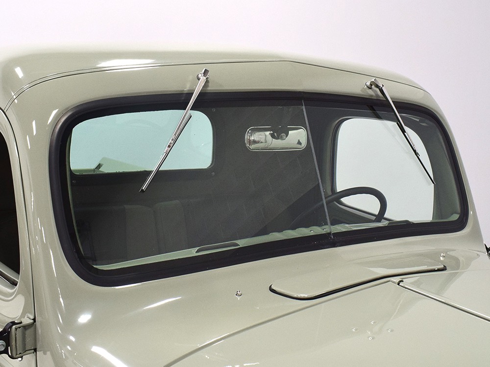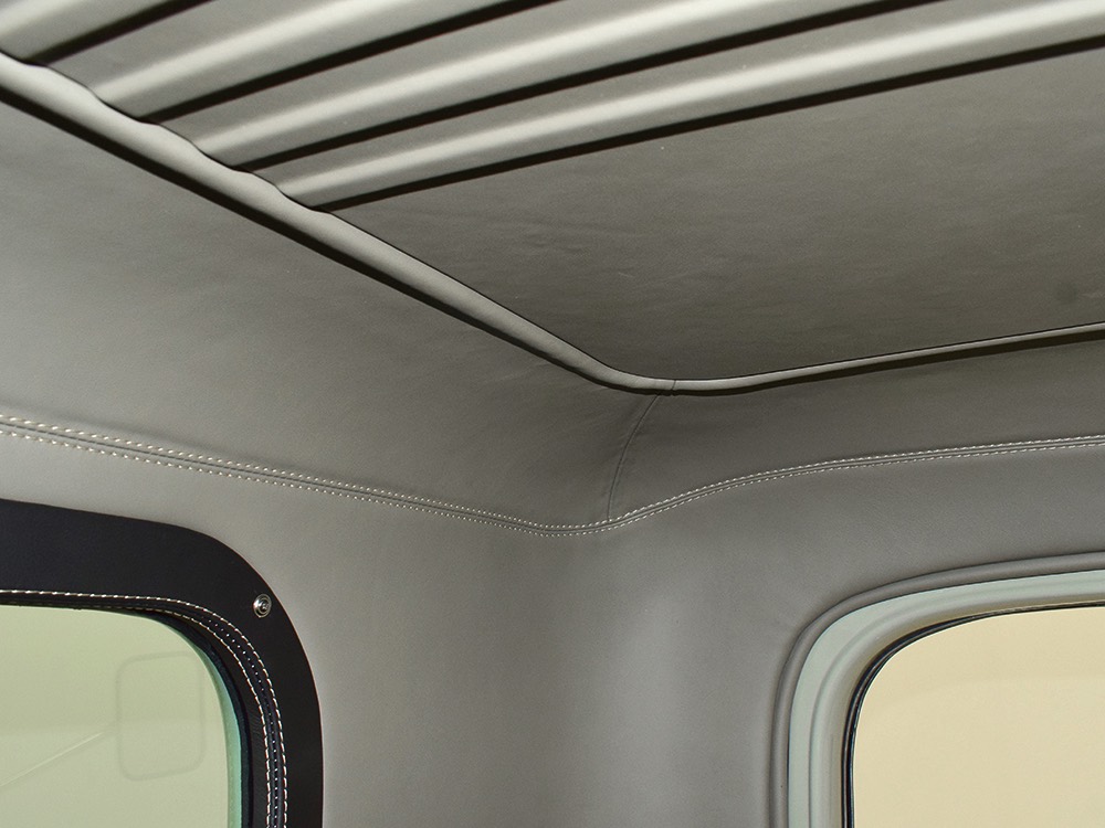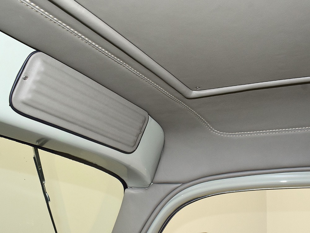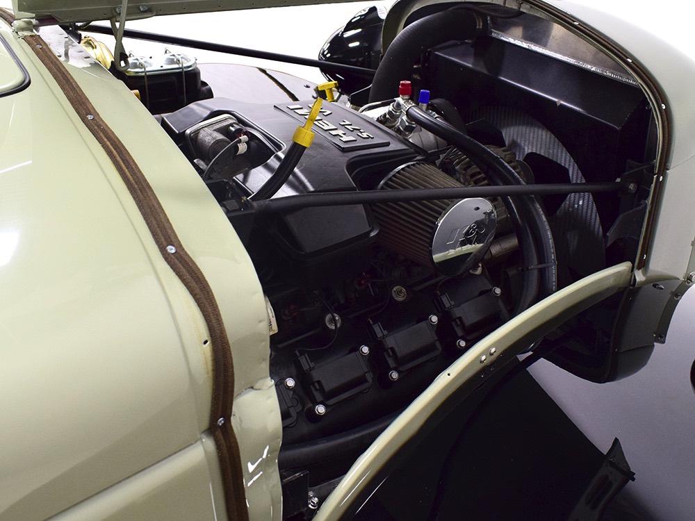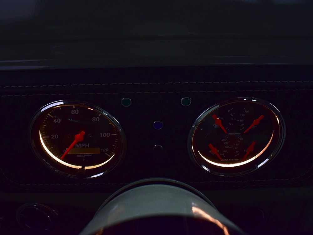 The interior is the most stunning Power Wagon driver’s compartment we’ve seen yet, beautifully crafted by Johnny Miller, whose work is legendary in the hot rod community. Black and green leather that’s just a shade darker than the bodywork is stitched onto aluminum sub-structures custom built just for this truck. Two layers of sound deadening insulation make the cab quiet and comfortable and a custom Glide bench seat was reworked to add legroom to the compact cab. A tilt steering column painted to match carries a modified 1940 Ford steering wheel with a leather-wrapped rim and a tall Lokar shifter looks like a vintage lever for the original 4-speed. Bright Auto Meter gauges are set into a leather gauge panel with more beautiful stitchwork and a matching panel on the passenger side houses the entertainment system with Bluetooth connectivity. Note the POWER WAGON emblems, which are stitched, not decals, and the subtle LED fixtures under the dash that provide awesome ambient lighting. A factory shifter for the 4-wheel-drive transfer case was modified to tuck in tight to the transmission tunnel and stay out of the way and even the pedals from the original Ram were retained, so it feels very OEM. Of course cold A/C and power windows are part of the package. Other details you might have missed: the Vee’d windshield, the custom panel that hides the A/C ducts, and the beautiful sculped headliner. It’s very impressive.