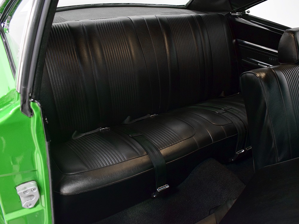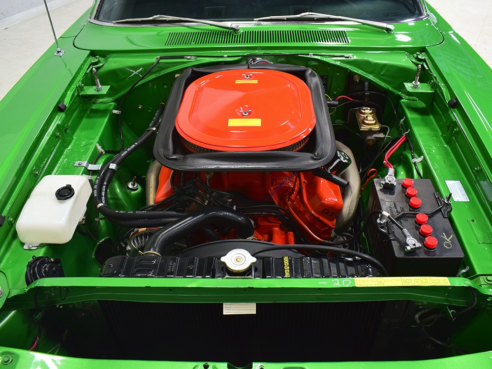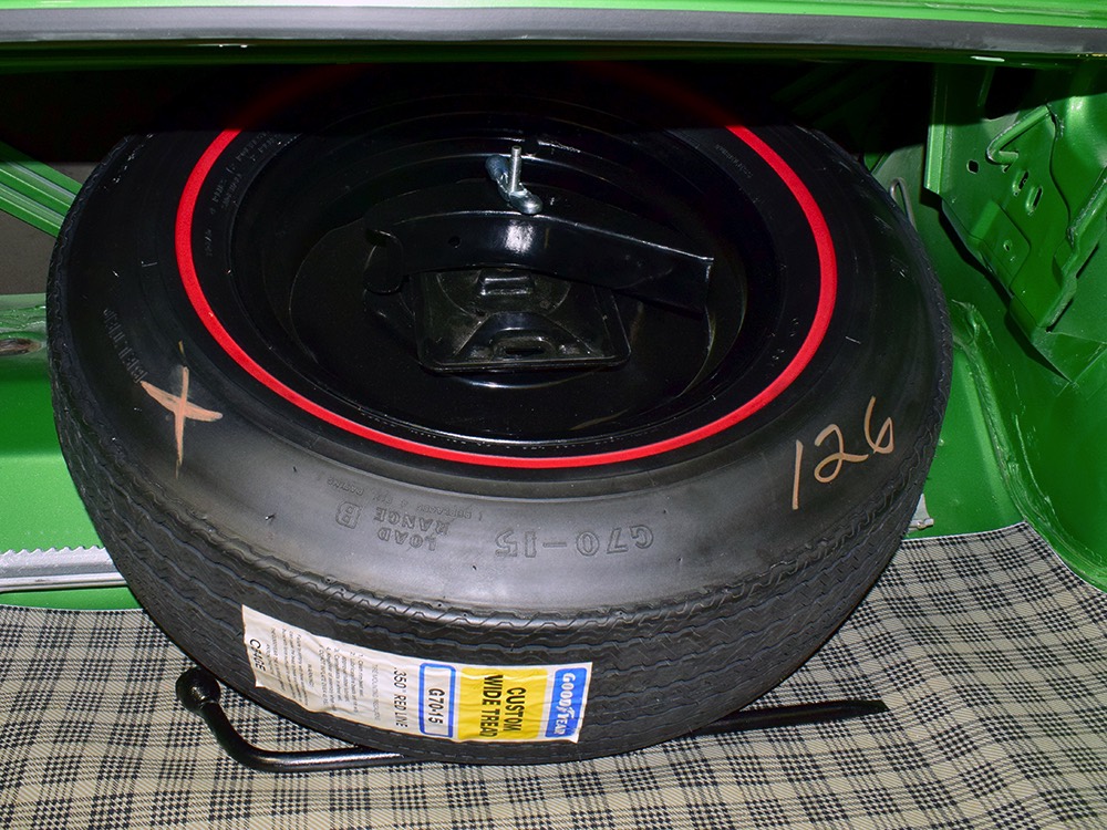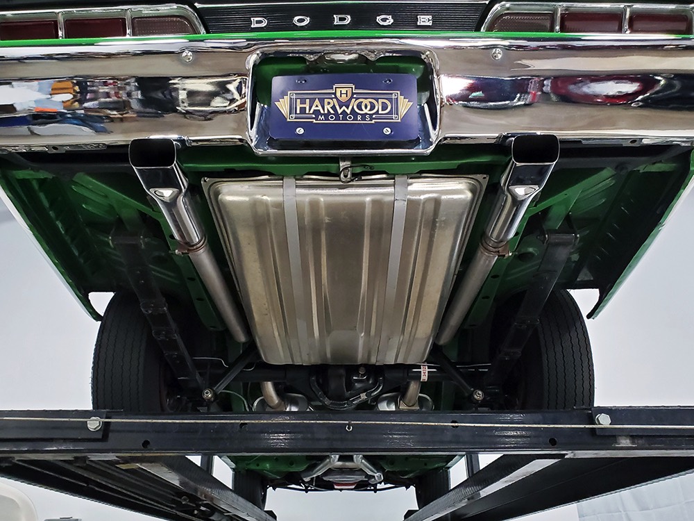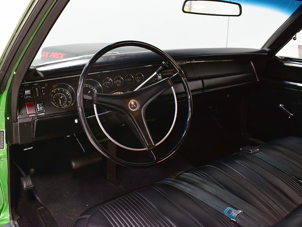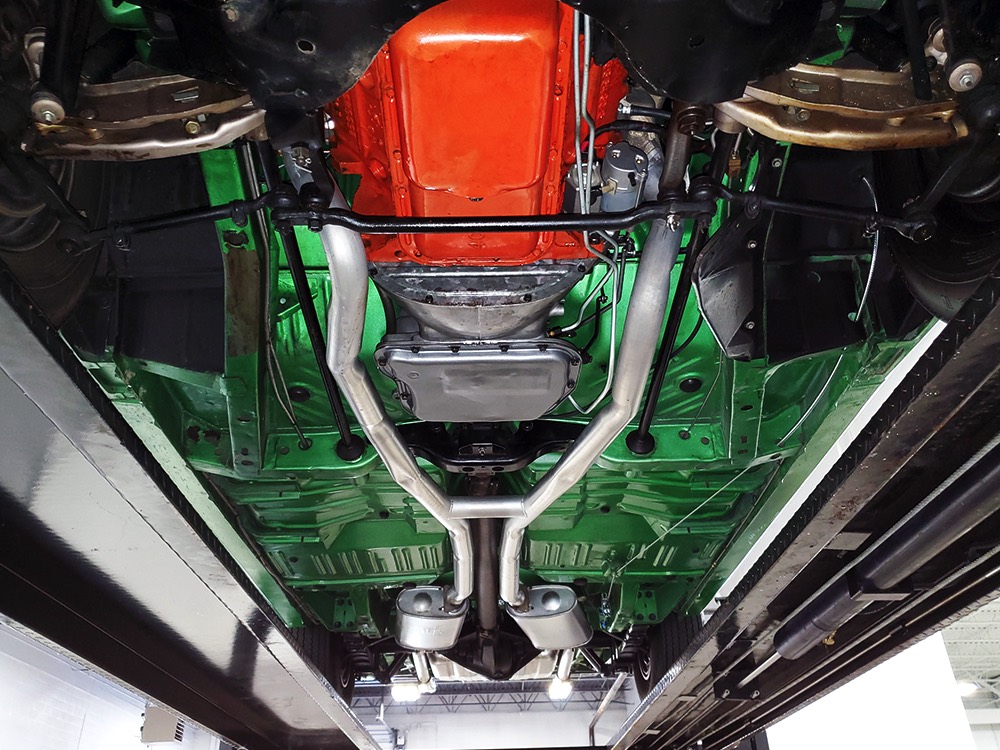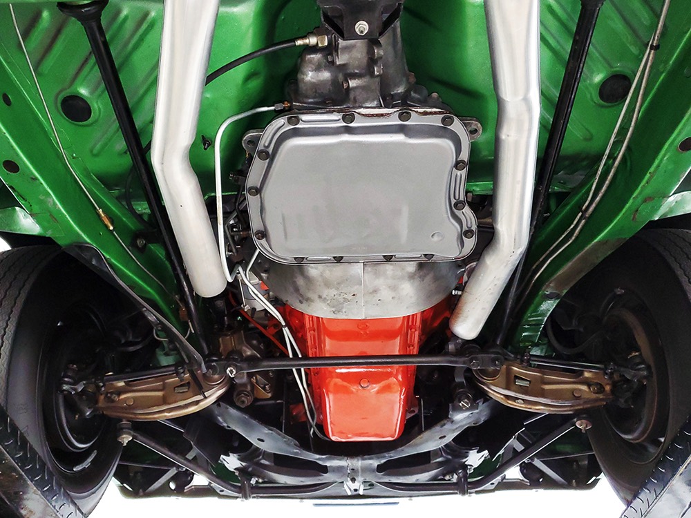 Now check out that undercarriage—this car’s racing days are long behind it, but the floors have never been cut or patched, the rockers still show original spotwelds, and the suspension is highly detailed. Manual drum brakes with the drums painted red were the only choice on the A12s, so don’t complain about the lack of discs—that’s how they came, period. The TorqueFlite 3-speed automatic transmission shifts crisply and is always ready to serve up a quick downshift, and a Dana 60 with 4.10 gears and a Sure Grip limited slip was likewise standard equipment. This one has a set of more mild 3.54 gears that make it a much better street car yet still entertainingly fast. A reproduction exhaust system sounds suitably muscular and offers correct chrome tips under the rear bumper. And again, all the factory markings and decals have been accurately reproduced here. Yes, there are a few signs of use (the restoration is a few years old) but good sheetmetal and attention to detail show through. Correct H-code steel wheels (unique to the A12s) are fitted with chrome lug nuts as original plus a set of G70-15 Goodyear redline tires so it looks very much as it would have in 1969.