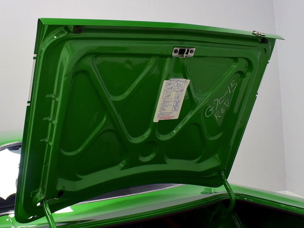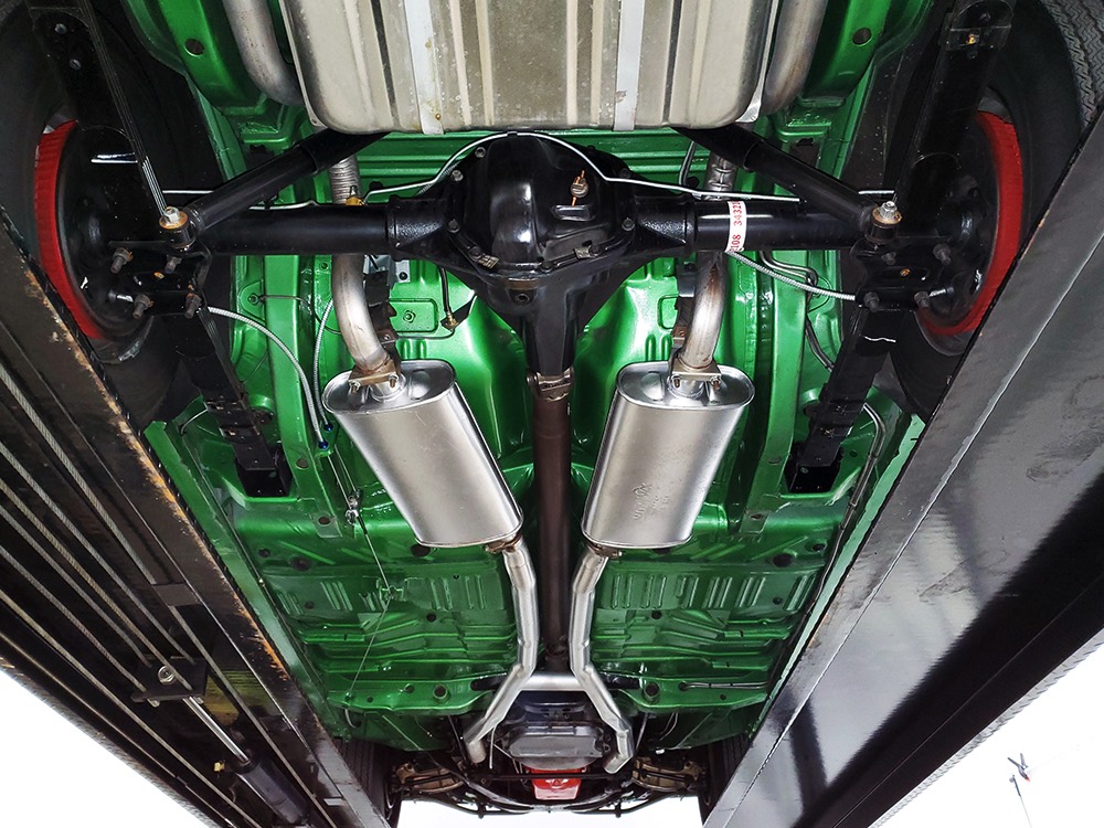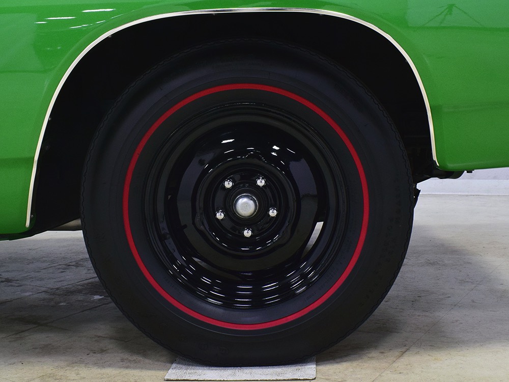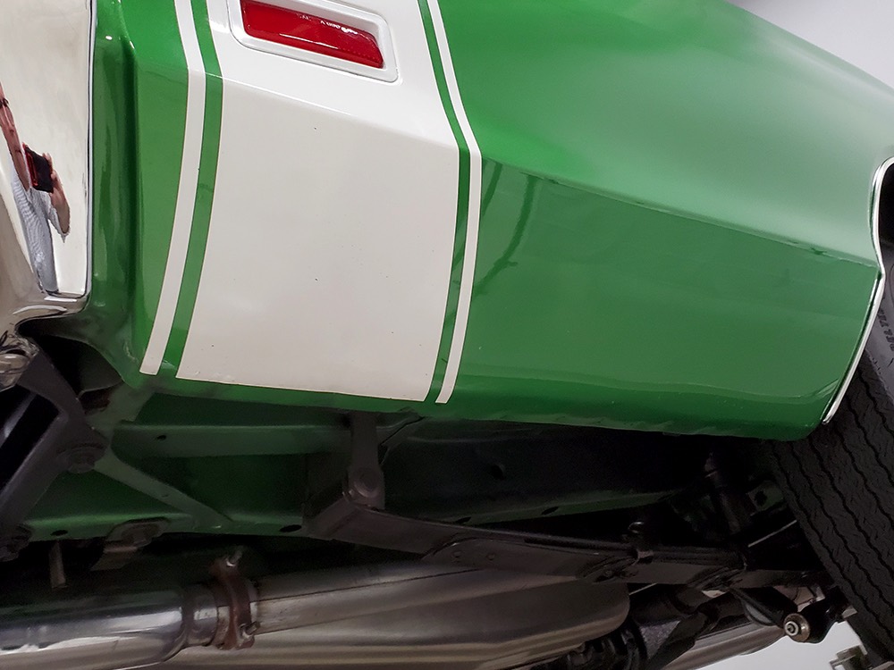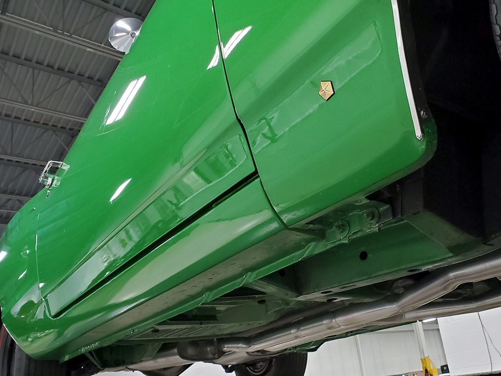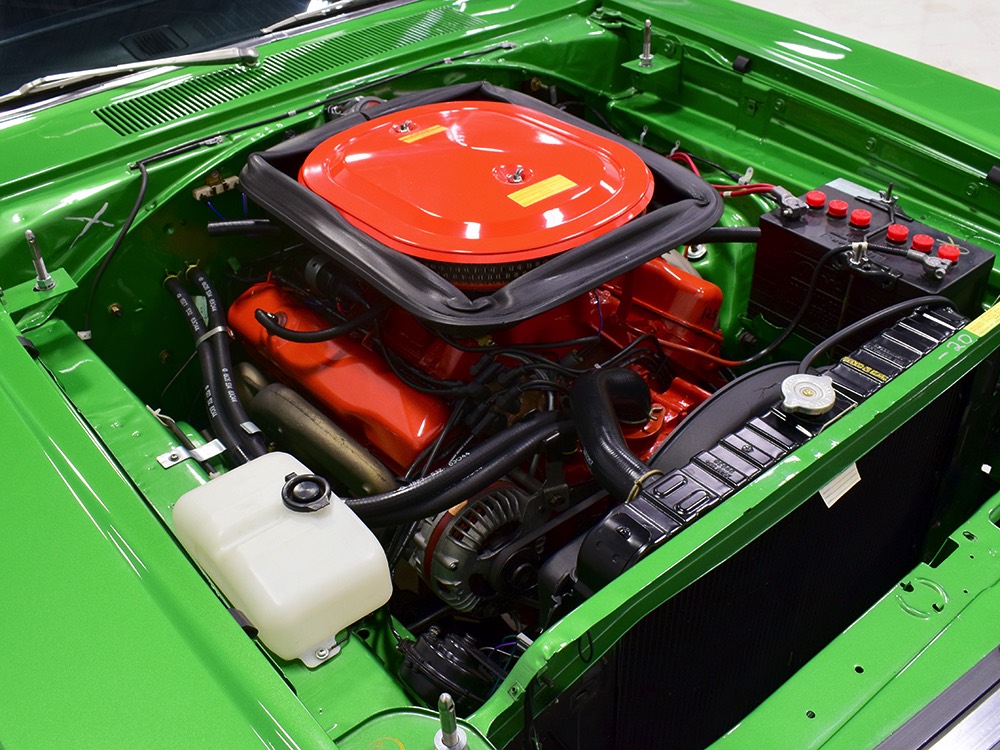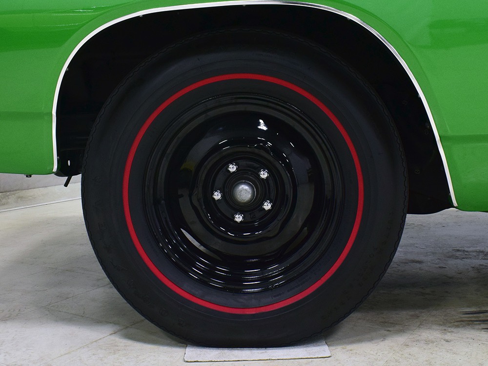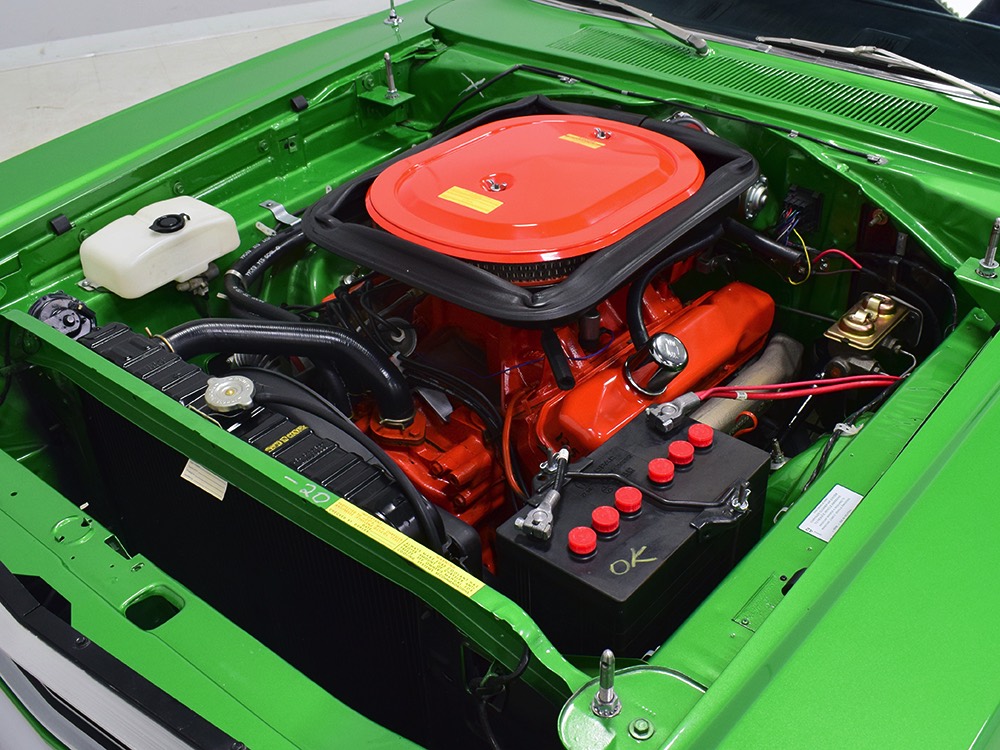 Now check out that undercarriage—this car’s racing days are long behind it, but the floors have never been cut or patched, the rockers still show original spotwelds, and the suspension is highly detailed. Manual drum brakes with the drums painted red were the only choice on the A12s, so don’t complain about the lack of discs—that’s how they came, period. The TorqueFlite 3-speed automatic transmission shifts crisply and is always ready to serve up a quick downshift, and a Dana 60 with 4.10 gears and a Sure Grip limited slip was likewise standard equipment. This one has a set of more mild 3.54 gears that make it a much better street car yet still entertainingly fast. A reproduction exhaust system sounds suitably muscular and offers correct chrome tips under the rear bumper. And again, all the factory markings and decals have been accurately reproduced here. Yes, there are a few signs of use (the restoration is a few years old) but good sheetmetal and attention to detail show through. Correct H-code steel wheels (unique to the A12s) are fitted with chrome lug nuts as original plus a set of G70-15 Goodyear redline tires so it looks very much as it would have in 1969.
