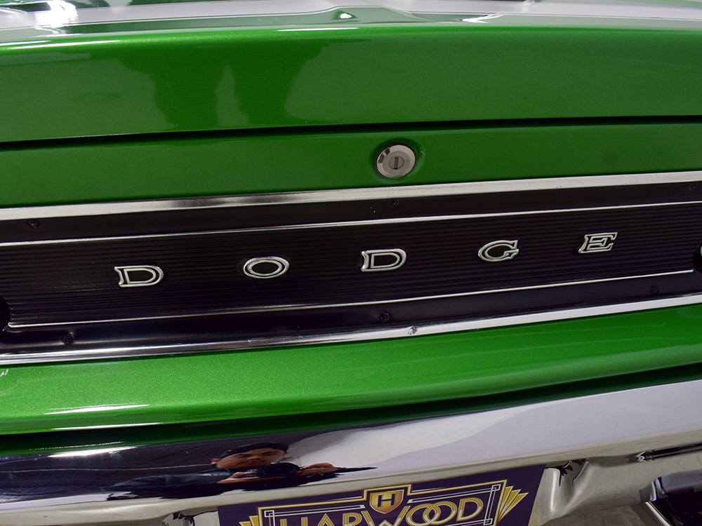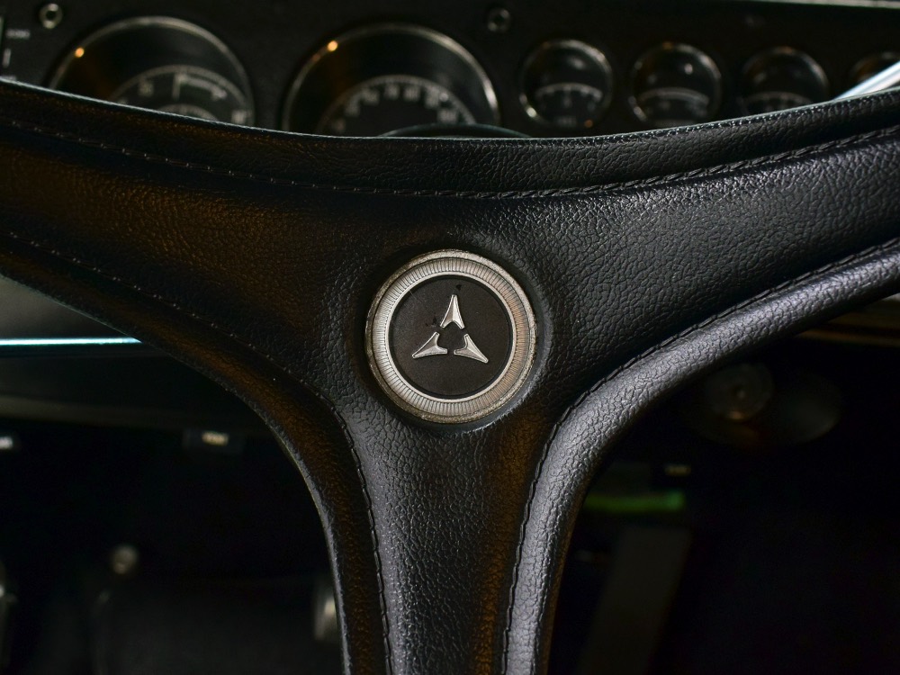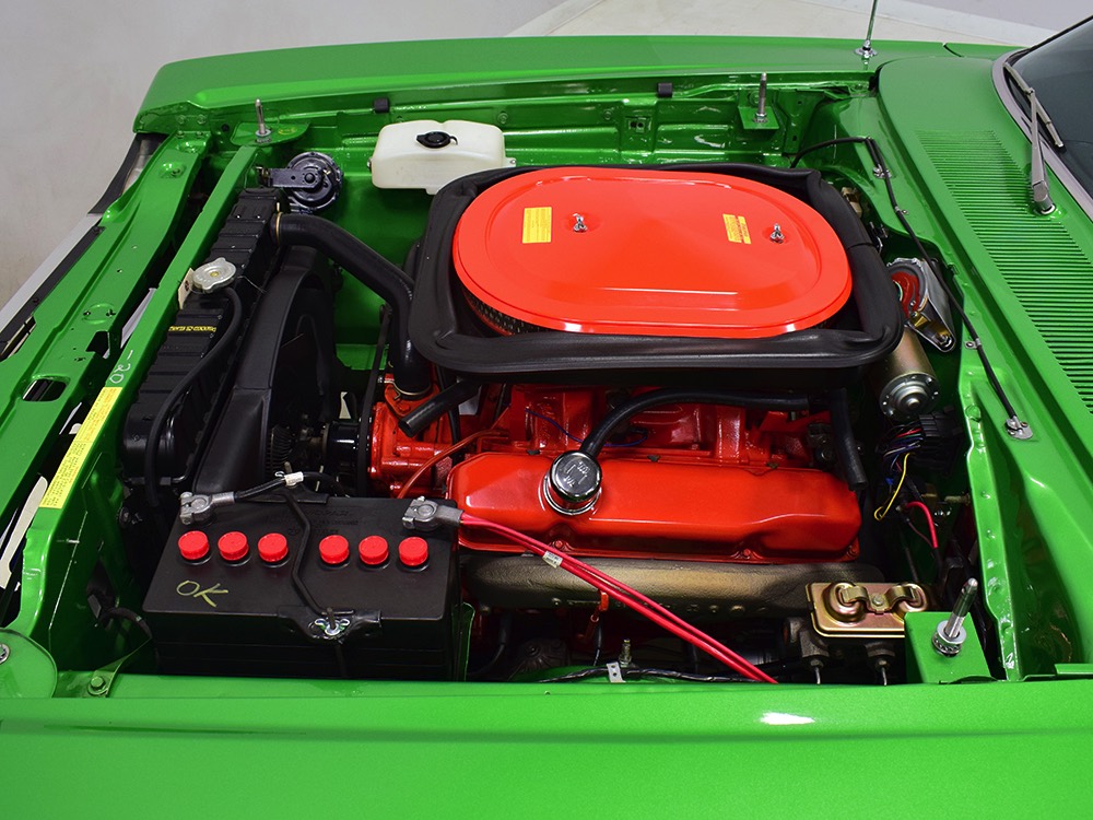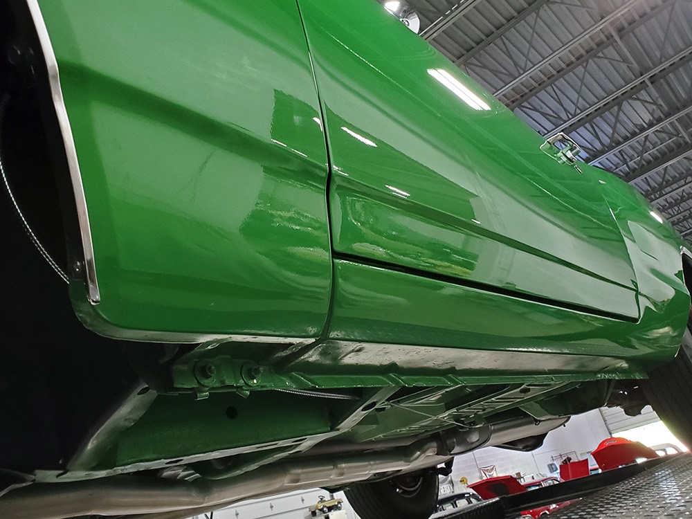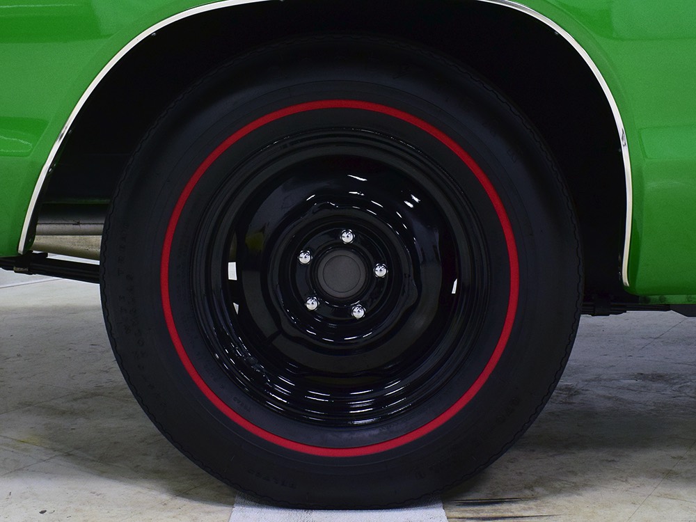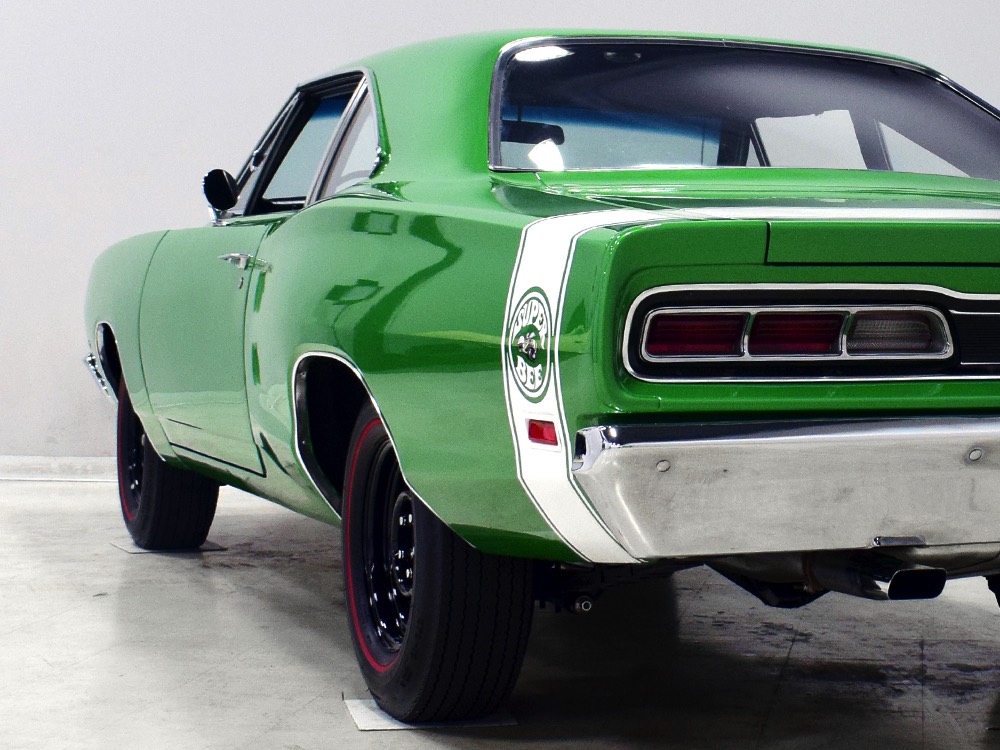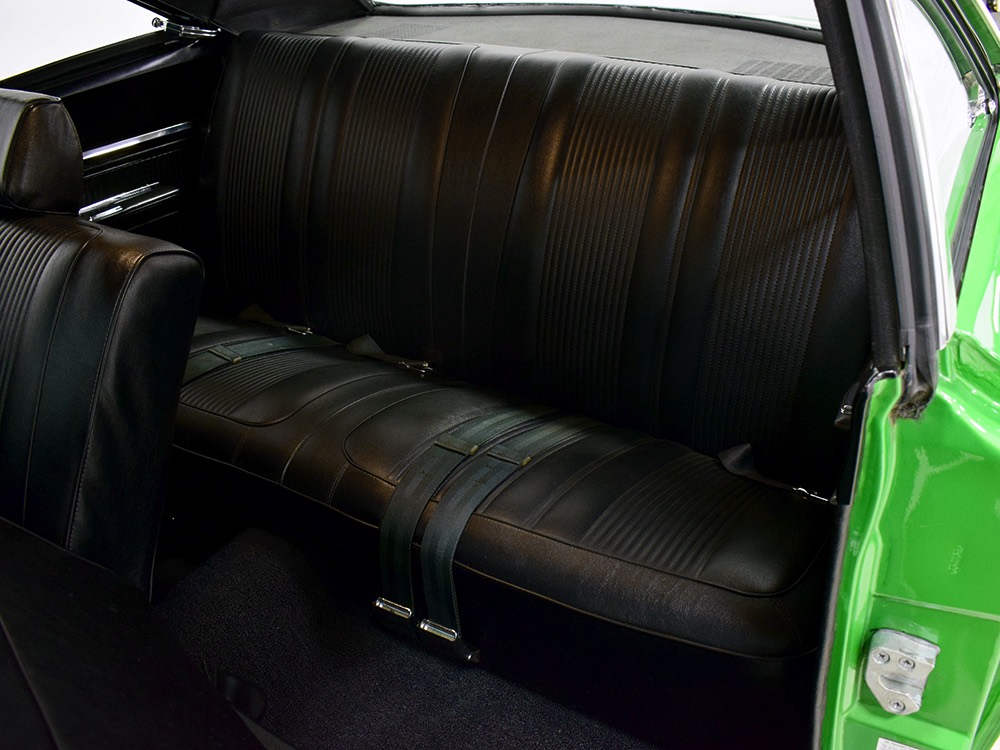 Now check out that undercarriage—this car’s racing days are long behind it, but the floors have never been cut or patched, the rockers still show original spotwelds, and the suspension is highly detailed. Manual drum brakes with the drums painted red were the only choice on the A12s, so don’t complain about the lack of discs—that’s how they came, period. The TorqueFlite 3-speed automatic transmission shifts crisply and is always ready to serve up a quick downshift, and a Dana 60 with 4.10 gears and a Sure Grip limited slip was likewise standard equipment. This one has a set of more mild 3.54 gears that make it a much better street car yet still entertainingly fast. A reproduction exhaust system sounds suitably muscular and offers correct chrome tips under the rear bumper. And again, all the factory markings and decals have been accurately reproduced here. Yes, there are a few signs of use (the restoration is a few years old) but good sheetmetal and attention to detail show through. Correct H-code steel wheels (unique to the A12s) are fitted with chrome lug nuts as original plus a set of G70-15 Goodyear redline tires so it looks very much as it would have in 1969.
