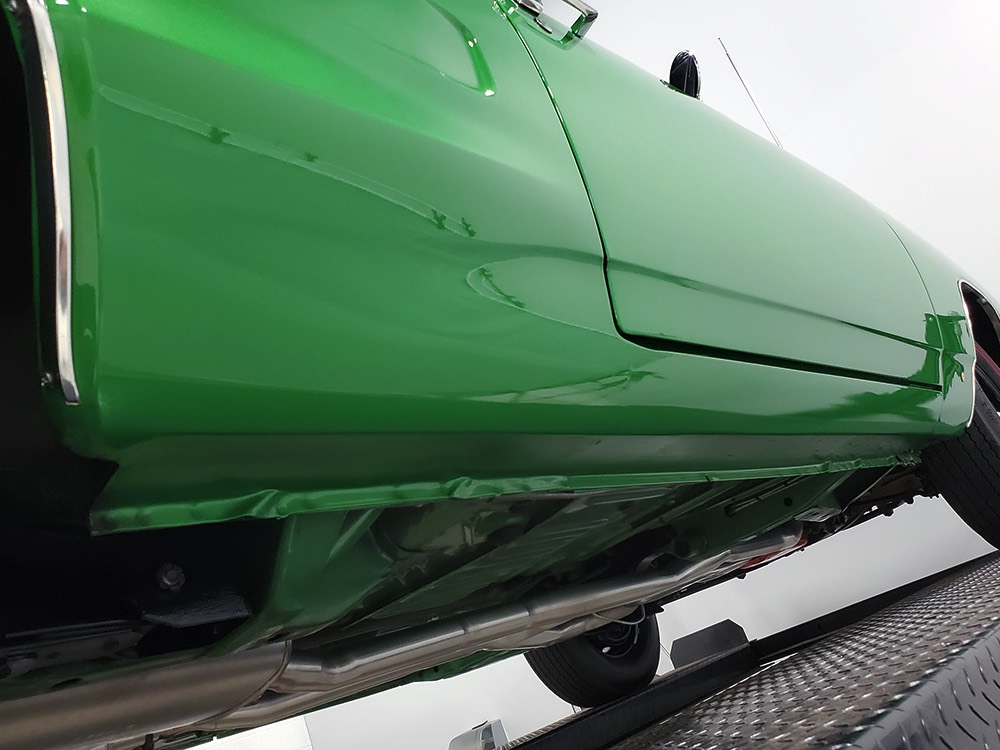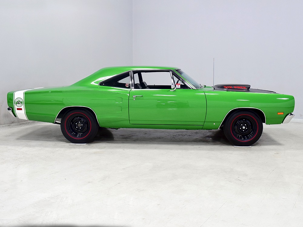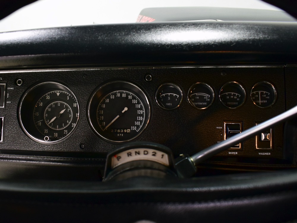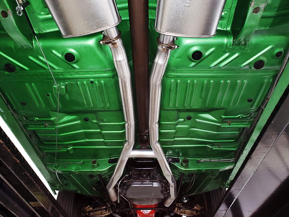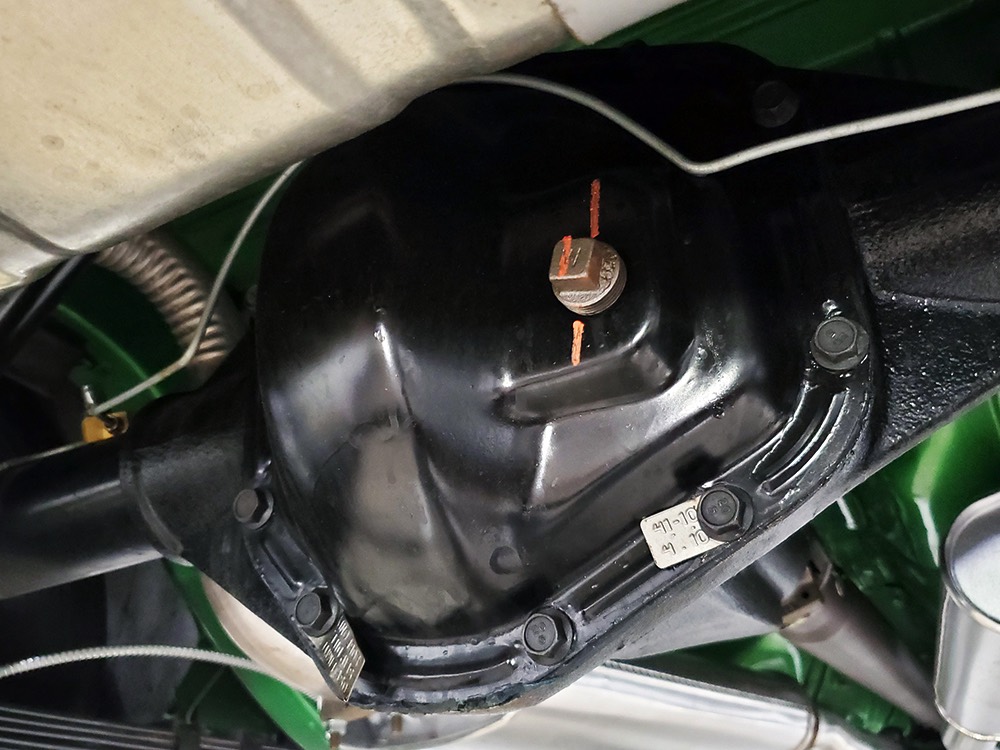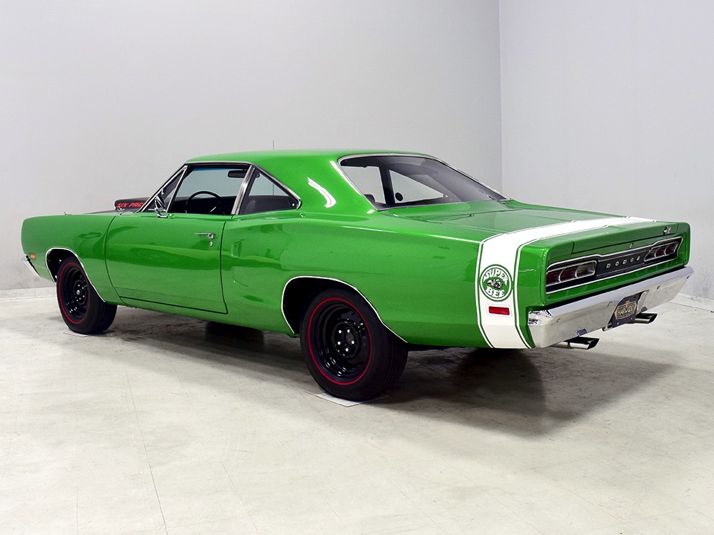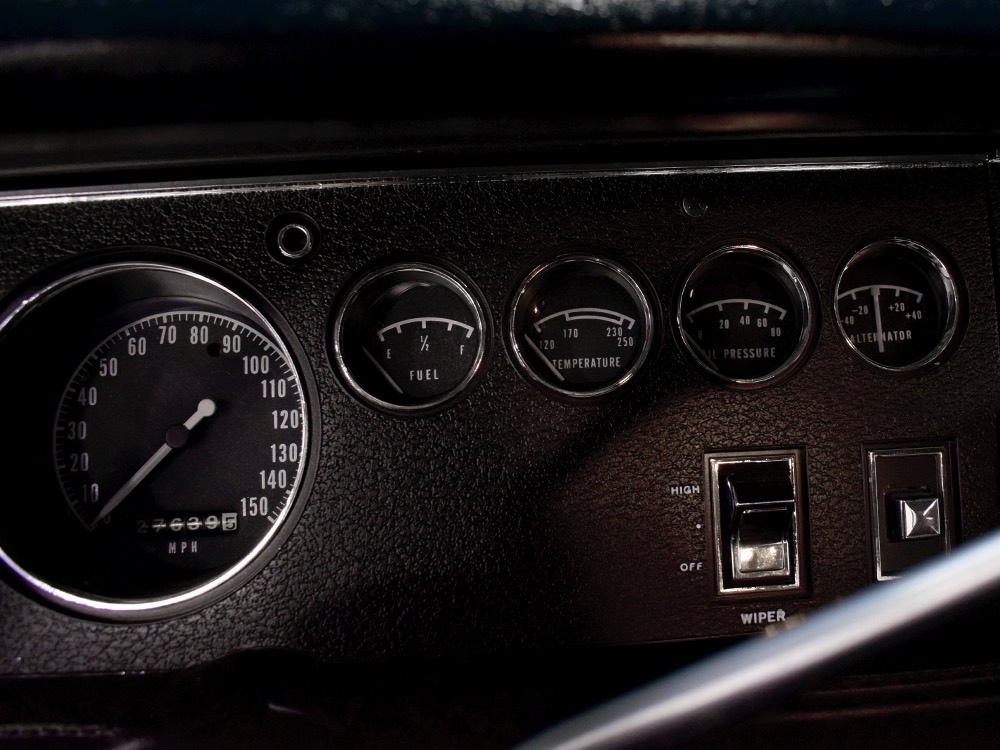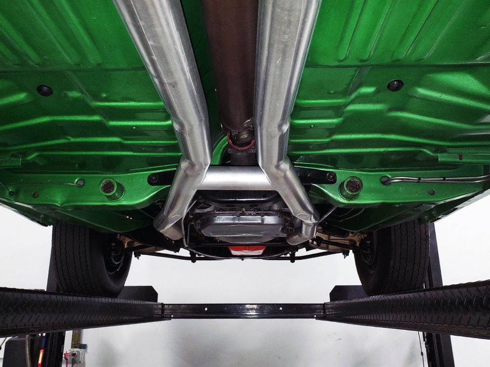 Now check out that undercarriage—this car’s racing days are long behind it, but the floors have never been cut or patched, the rockers still show original spotwelds, and the suspension is highly detailed. Manual drum brakes with the drums painted red were the only choice on the A12s, so don’t complain about the lack of discs—that’s how they came, period. The TorqueFlite 3-speed automatic transmission shifts crisply and is always ready to serve up a quick downshift, and a Dana 60 with 4.10 gears and a Sure Grip limited slip was likewise standard equipment. This one has a set of more mild 3.54 gears that make it a much better street car yet still entertainingly fast. A reproduction exhaust system sounds suitably muscular and offers correct chrome tips under the rear bumper. And again, all the factory markings and decals have been accurately reproduced here. Yes, there are a few signs of use (the restoration is a few years old) but good sheetmetal and attention to detail show through. Correct H-code steel wheels (unique to the A12s) are fitted with chrome lug nuts as original plus a set of G70-15 Goodyear redline tires so it looks very much as it would have in 1969.