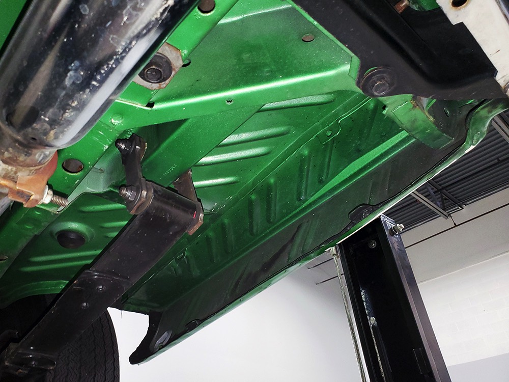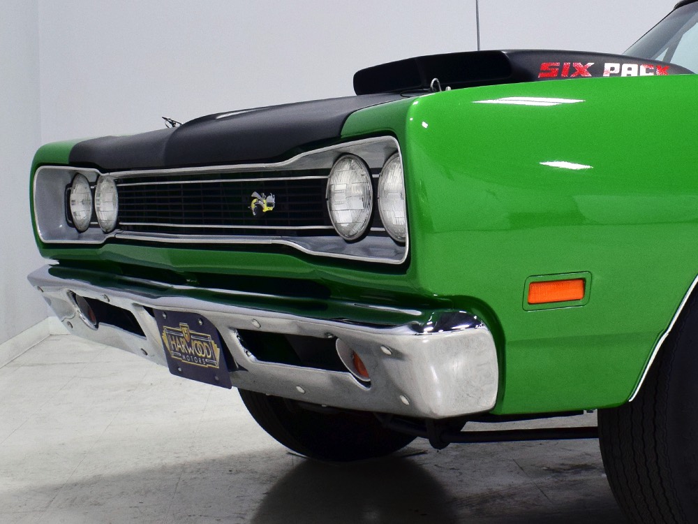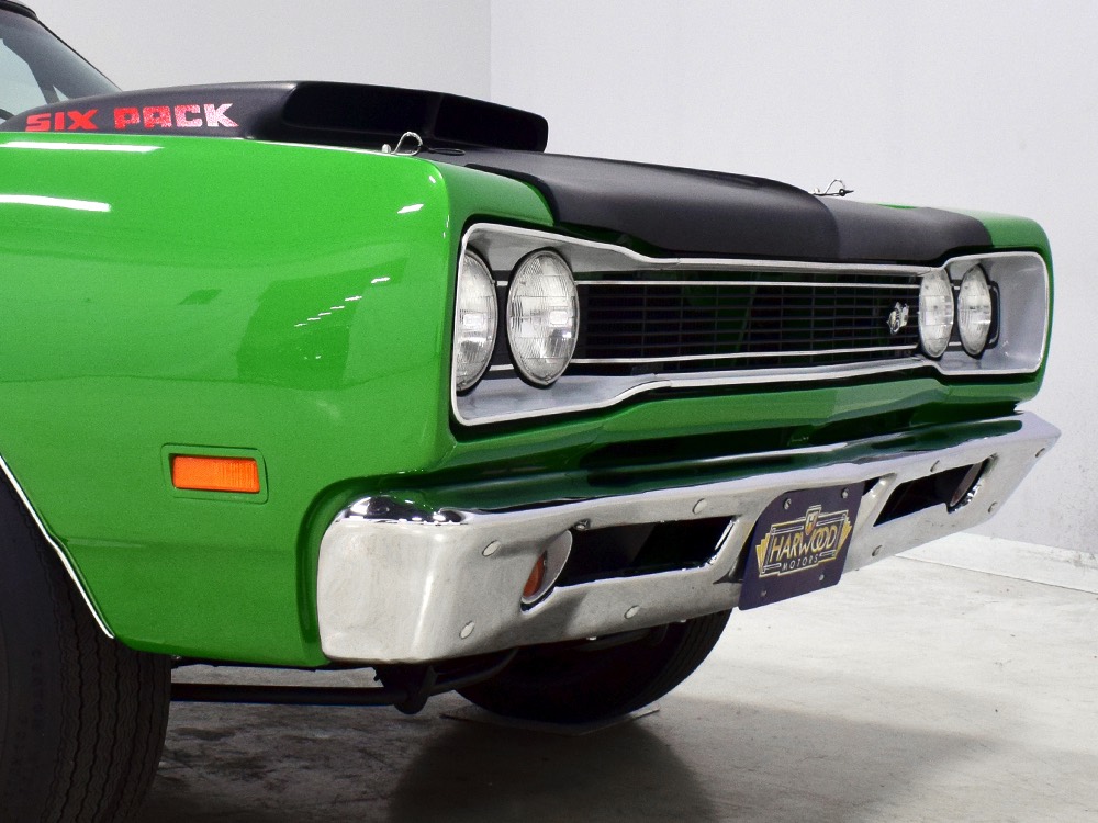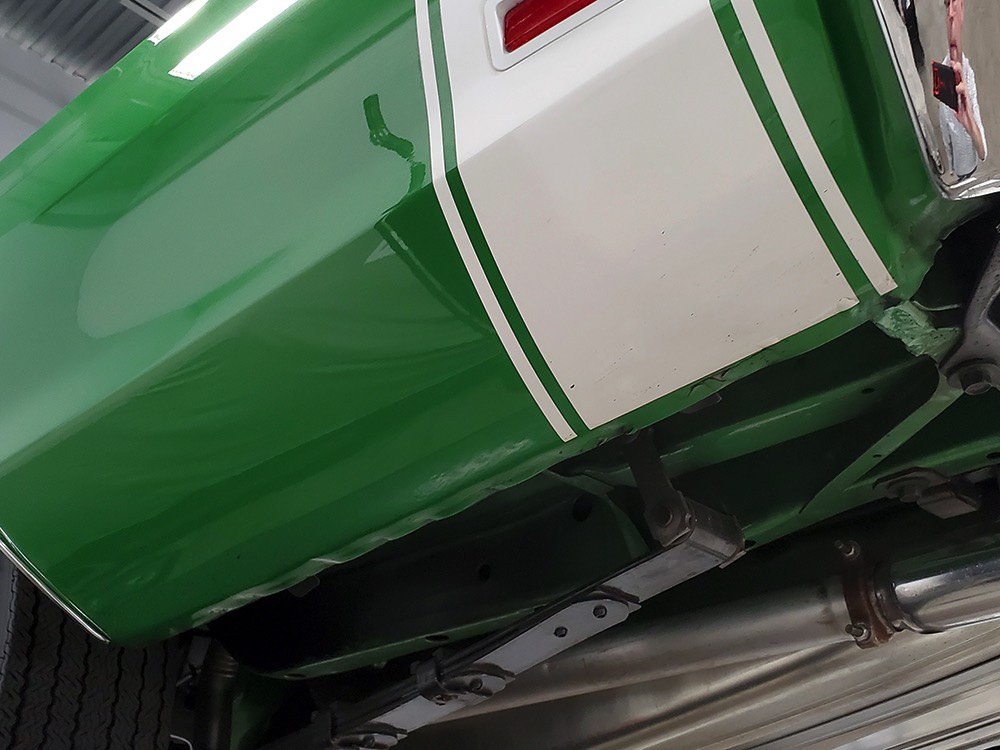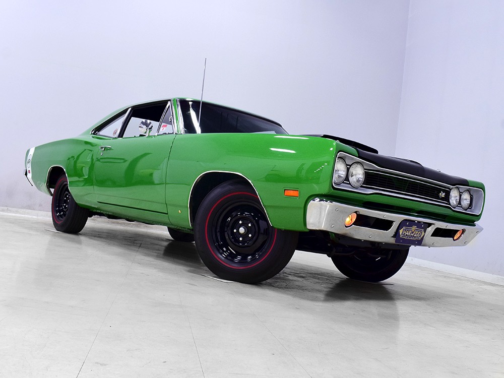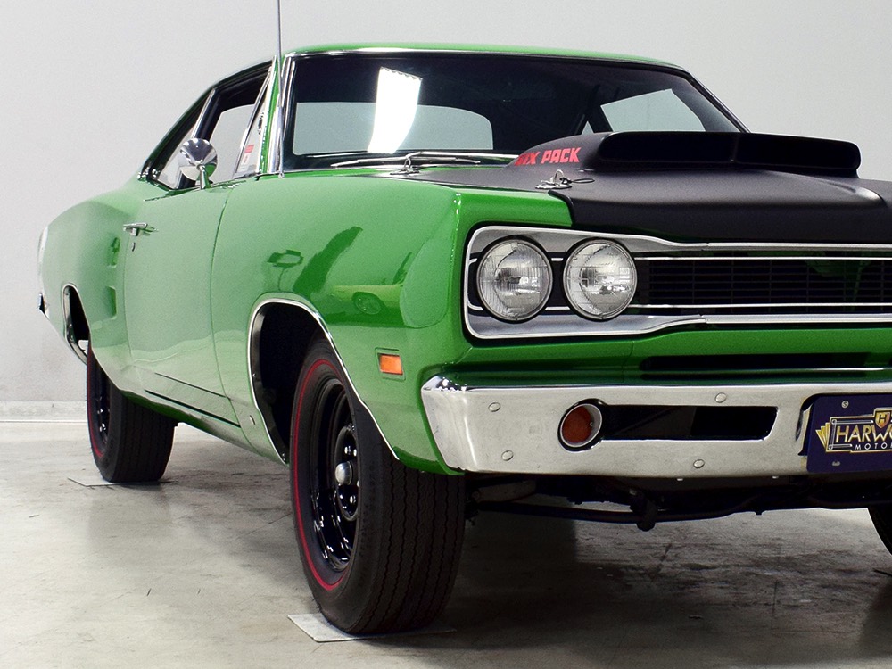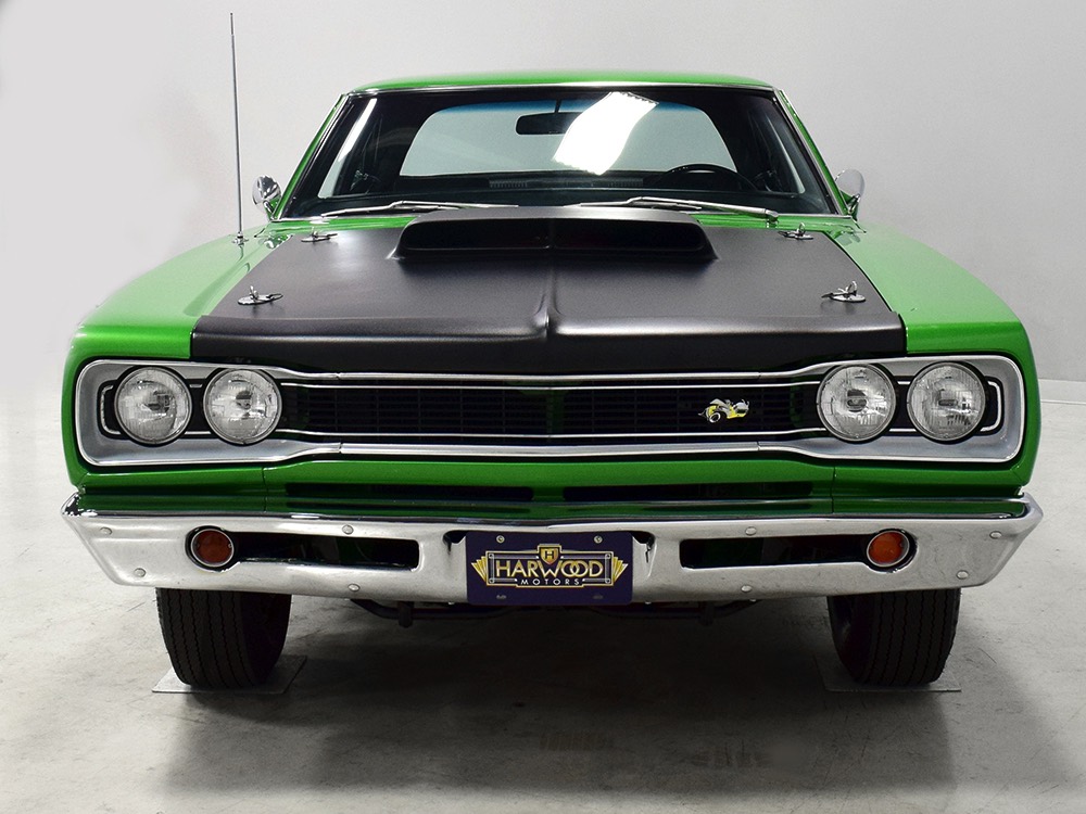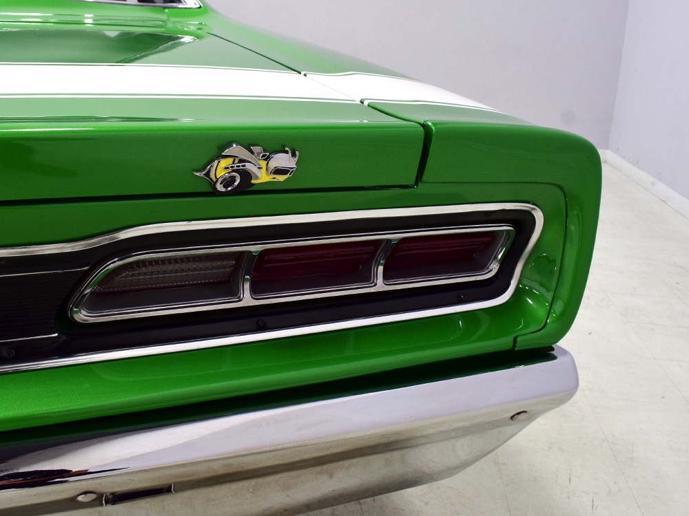 Now check out that undercarriage—this car’s racing days are long behind it, but the floors have never been cut or patched, the rockers still show original spotwelds, and the suspension is highly detailed. Manual drum brakes with the drums painted red were the only choice on the A12s, so don’t complain about the lack of discs—that’s how they came, period. The TorqueFlite 3-speed automatic transmission shifts crisply and is always ready to serve up a quick downshift, and a Dana 60 with 4.10 gears and a Sure Grip limited slip was likewise standard equipment. This one has a set of more mild 3.54 gears that make it a much better street car yet still entertainingly fast. A reproduction exhaust system sounds suitably muscular and offers correct chrome tips under the rear bumper. And again, all the factory markings and decals have been accurately reproduced here. Yes, there are a few signs of use (the restoration is a few years old) but good sheetmetal and attention to detail show through. Correct H-code steel wheels (unique to the A12s) are fitted with chrome lug nuts as original plus a set of G70-15 Goodyear redline tires so it looks very much as it would have in 1969.