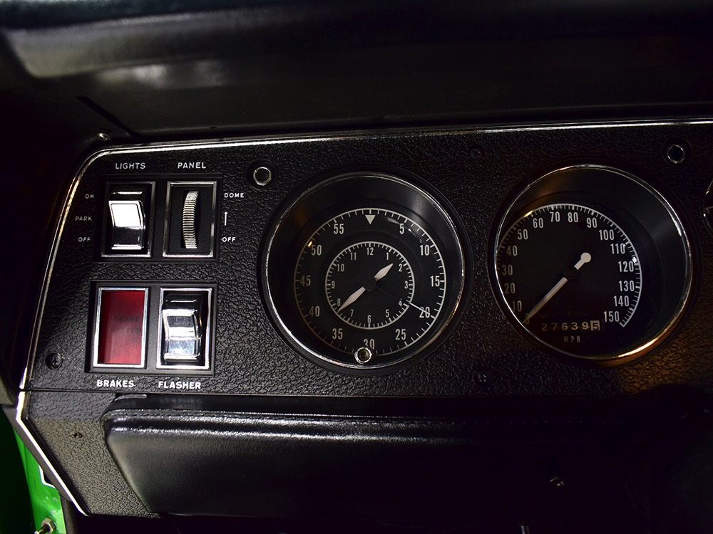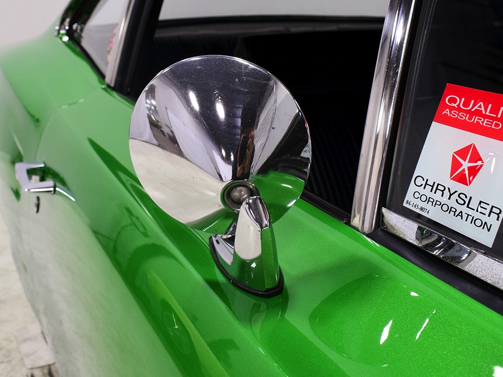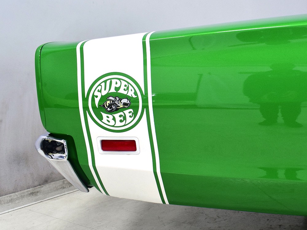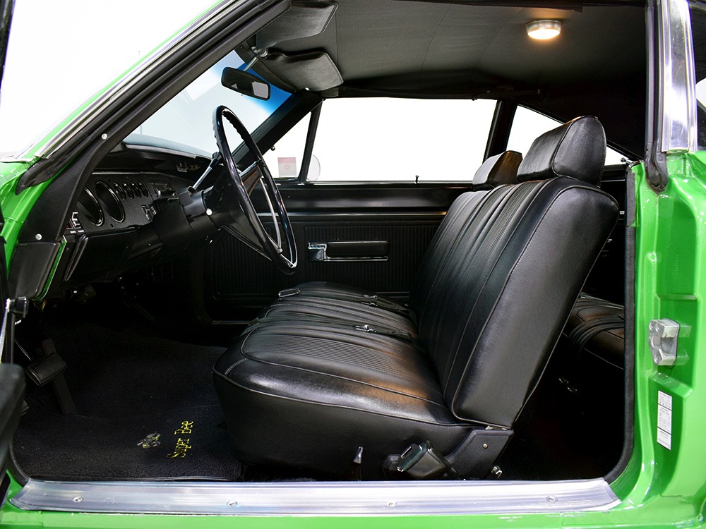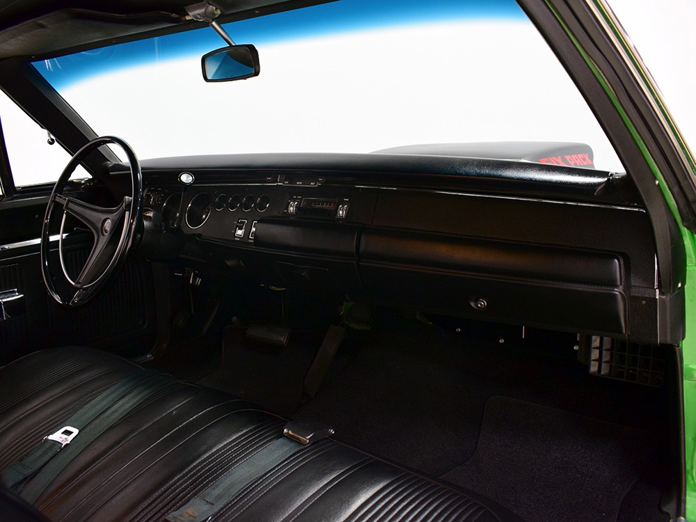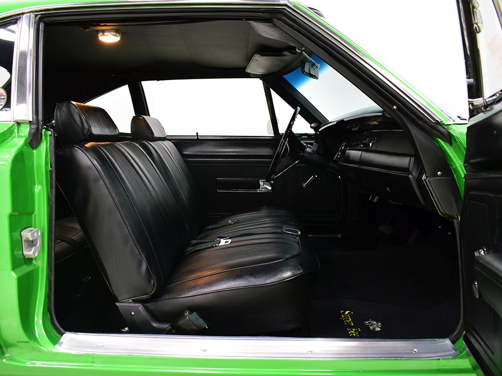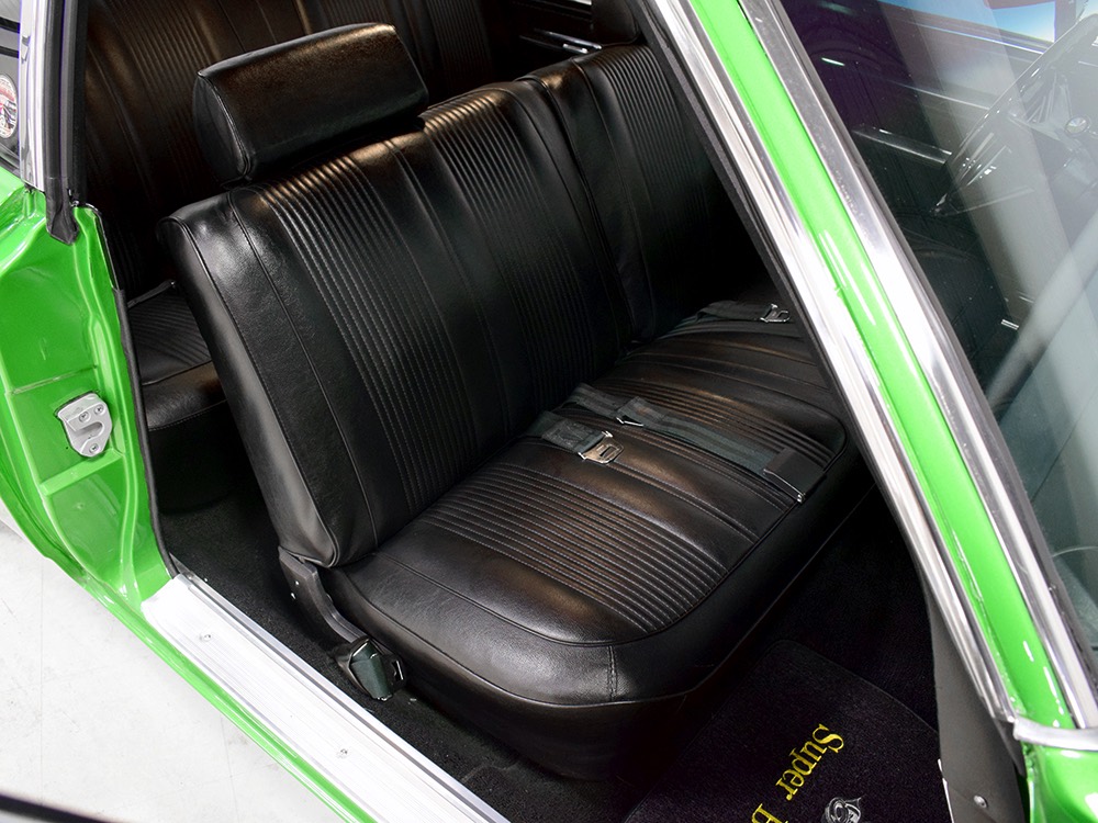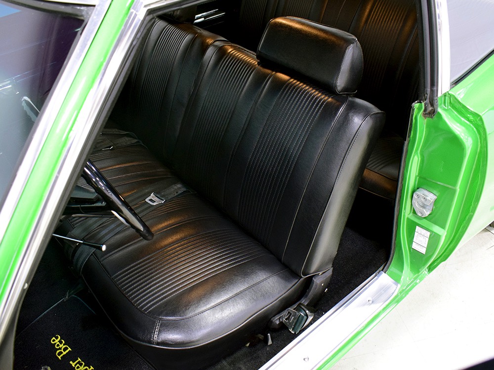 Which brings us to this spectacular Spring Green 1969 Dodge Super Bee A12. Easy to spot with its painted black wheels and black fiberglass lift-off hood, this happens to be the rarest of the bunch: a 2-door “post” sedan with a bench seat. See, this is the one that the guys who were actually going racing built. The 2-door post was the stiffest and lightest of the bunch, which was obviously key on the strip. And who cares about a bench seat? It was lighter if you kept it, but most guys didn’t so it didn’t matter. This car shows just 27,369 original miles (authenticated with an actual miles title and known ownership history) and you can imagine how those miles were accumulated. But being a car that spent most of its life on the track meant no winters, no rain, no dicing with amateurs in traffic, so the sheetmetal and bodywork is in fantastic condition with no replacement panels. Decoding the fender tag, you’ll see it was originally F6, which is indeed the bright Spring Green on it today. It looks awesome, but isn’t at all subtle, so you’ll have to be ready for the attention. The black hood features big, red SIX PACK lettering so no fooling the guy in the lane next to you, and that hood scoop is big enough to be a garage in Europe. A white bumble bee stripe around the tail is a great touch and since we’re skipping subtlety anyway, why not? And just check out the attention to detail in the restoration—the crisp, brightly detailed Super Bee emblems, the crystal clear original glass, reproduction decals, and someone splurged a little, because it has two external mirrors. Nice!