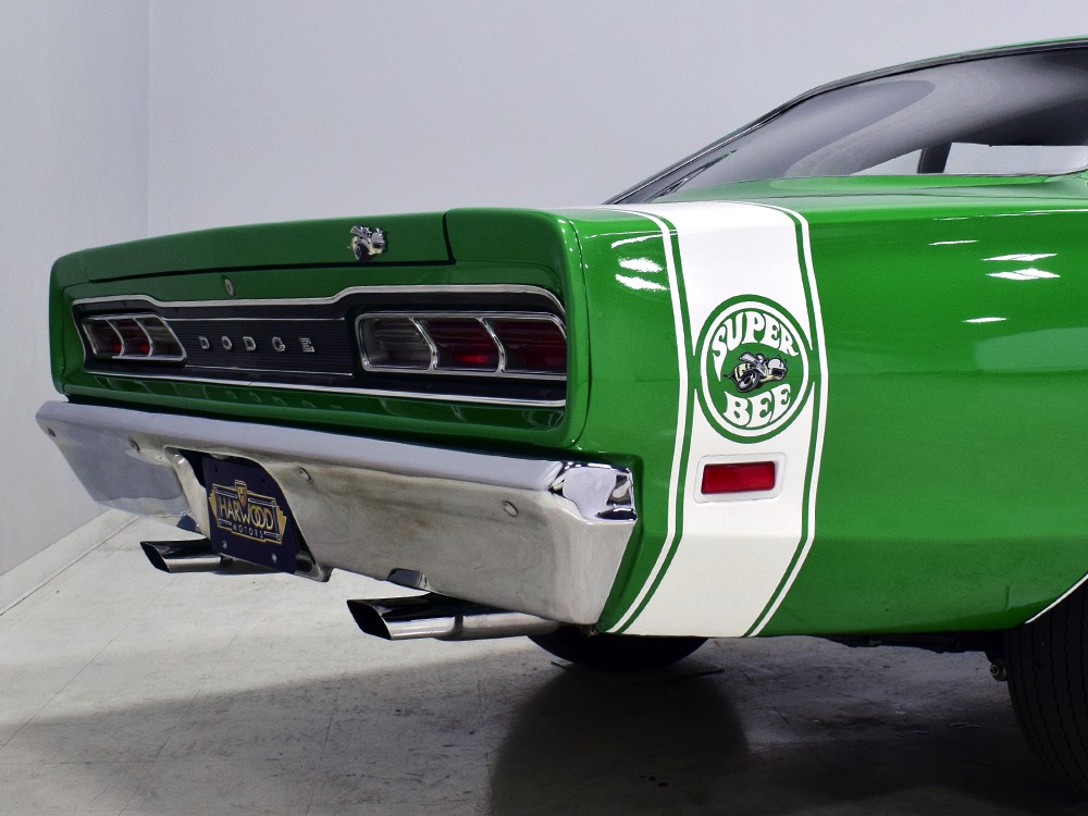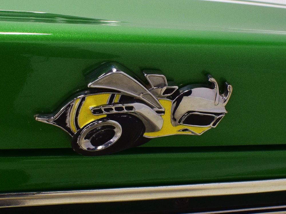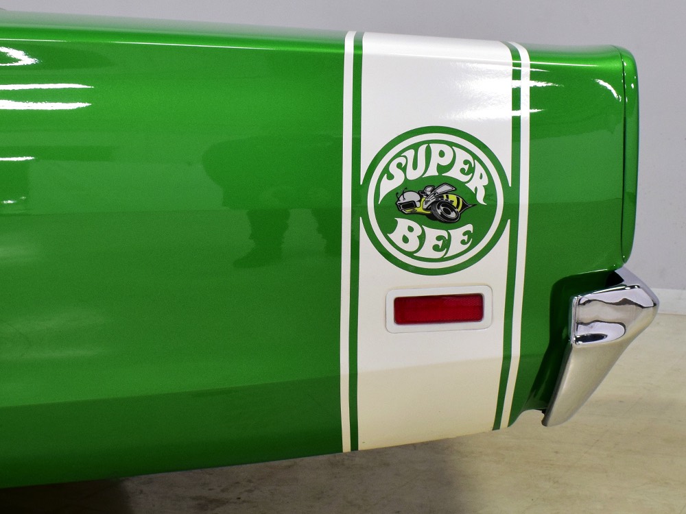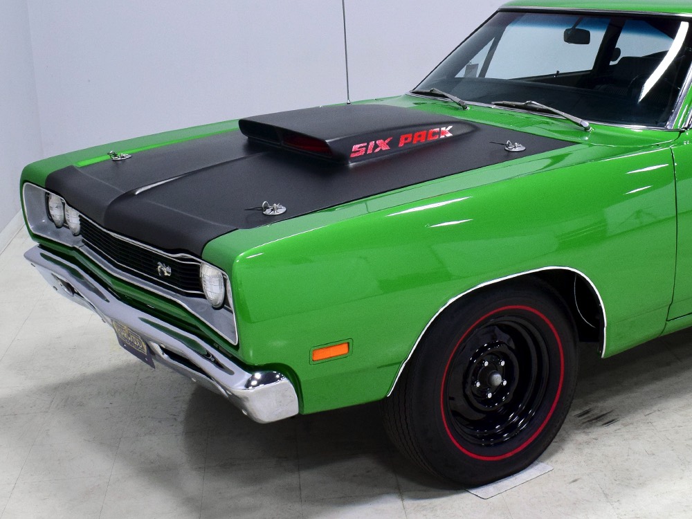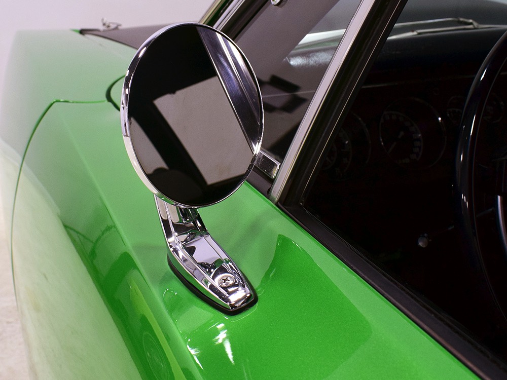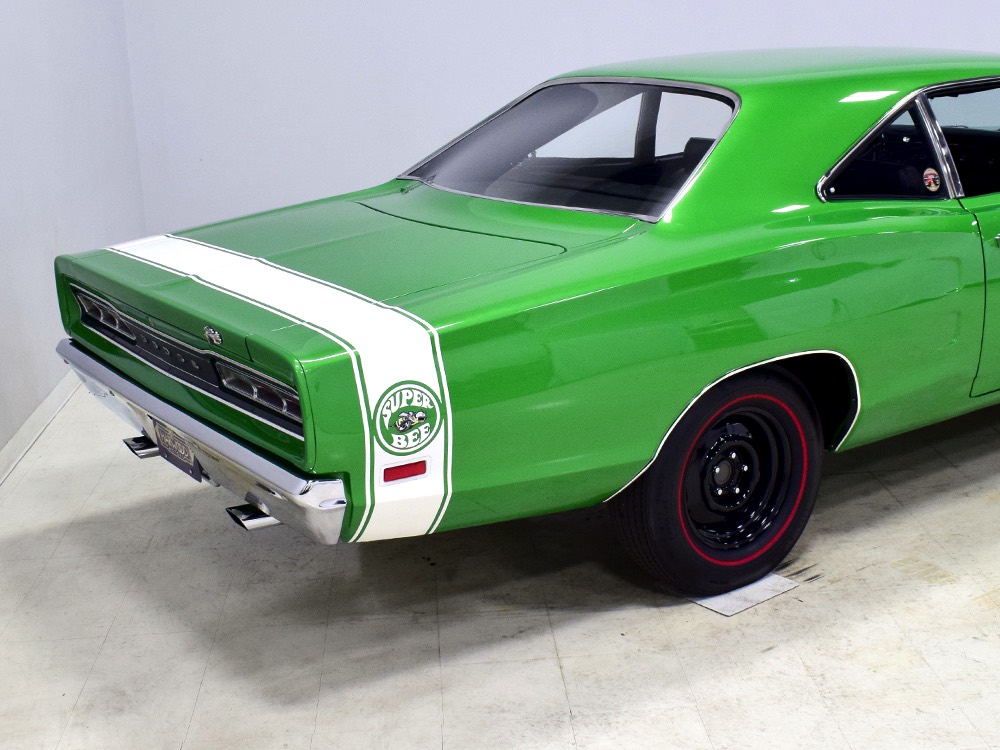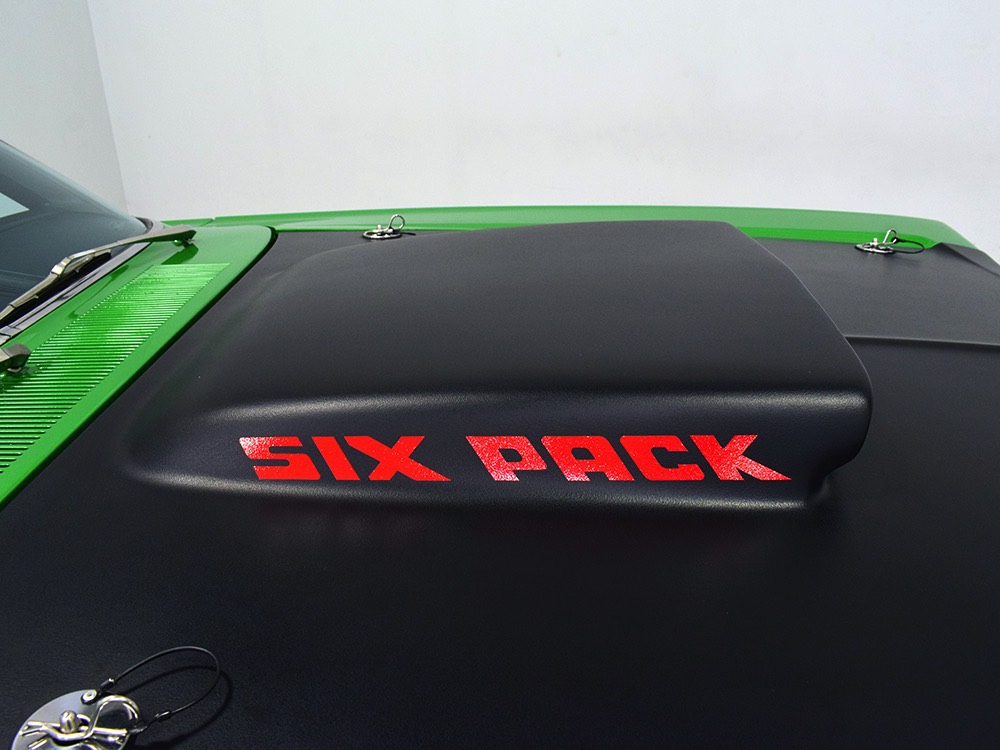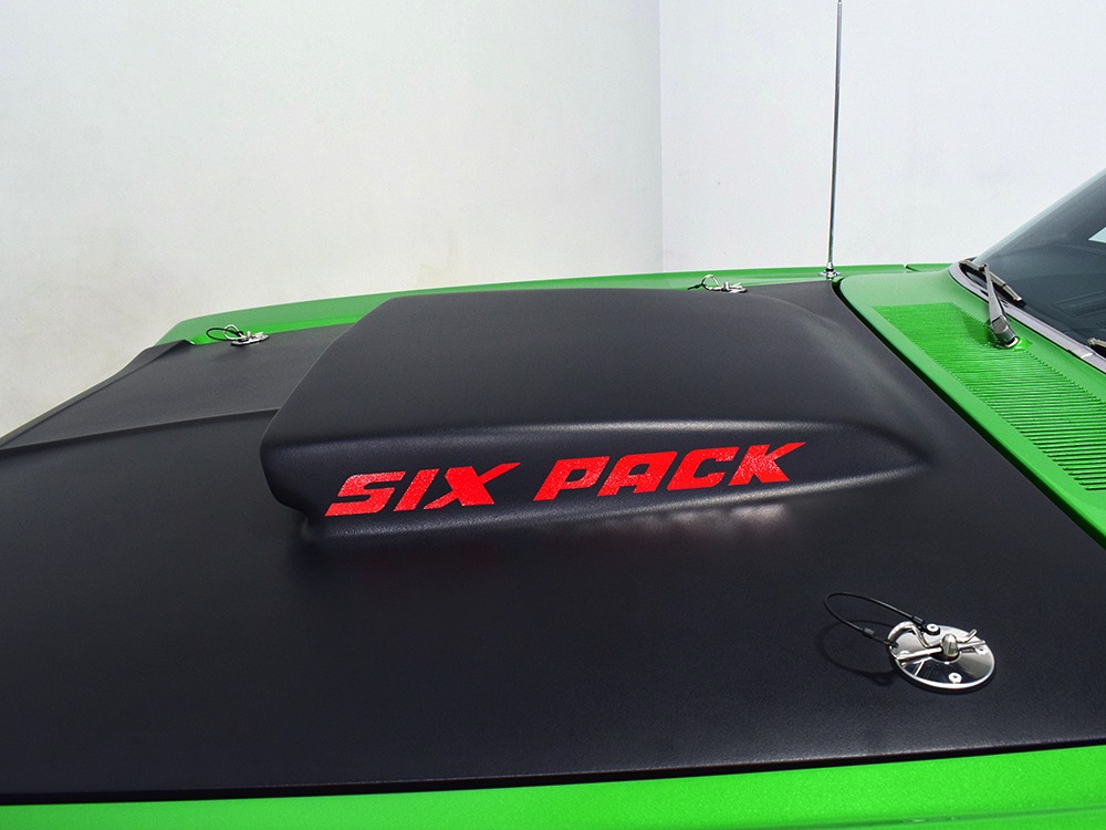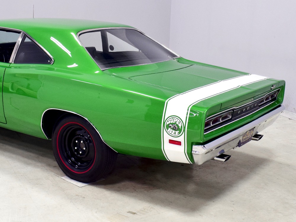 Which brings us to this spectacular Spring Green 1969 Dodge Super Bee A12. Easy to spot with its painted black wheels and black fiberglass lift-off hood, this happens to be the rarest of the bunch: a 2-door “post” sedan with a bench seat. See, this is the one that the guys who were actually going racing built. The 2-door post was the stiffest and lightest of the bunch, which was obviously key on the strip. And who cares about a bench seat? It was lighter if you kept it, but most guys didn’t so it didn’t matter. This car shows just 27,369 original miles (authenticated with an actual miles title and known ownership history) and you can imagine how those miles were accumulated. But being a car that spent most of its life on the track meant no winters, no rain, no dicing with amateurs in traffic, so the sheetmetal and bodywork is in fantastic condition with no replacement panels. Decoding the fender tag, you’ll see it was originally F6, which is indeed the bright Spring Green on it today. It looks awesome, but isn’t at all subtle, so you’ll have to be ready for the attention. The black hood features big, red SIX PACK lettering so no fooling the guy in the lane next to you, and that hood scoop is big enough to be a garage in Europe. A white bumble bee stripe around the tail is a great touch and since we’re skipping subtlety anyway, why not? And just check out the attention to detail in the restoration—the crisp, brightly detailed Super Bee emblems, the crystal clear original glass, reproduction decals, and someone splurged a little, because it has two external mirrors. Nice!