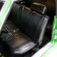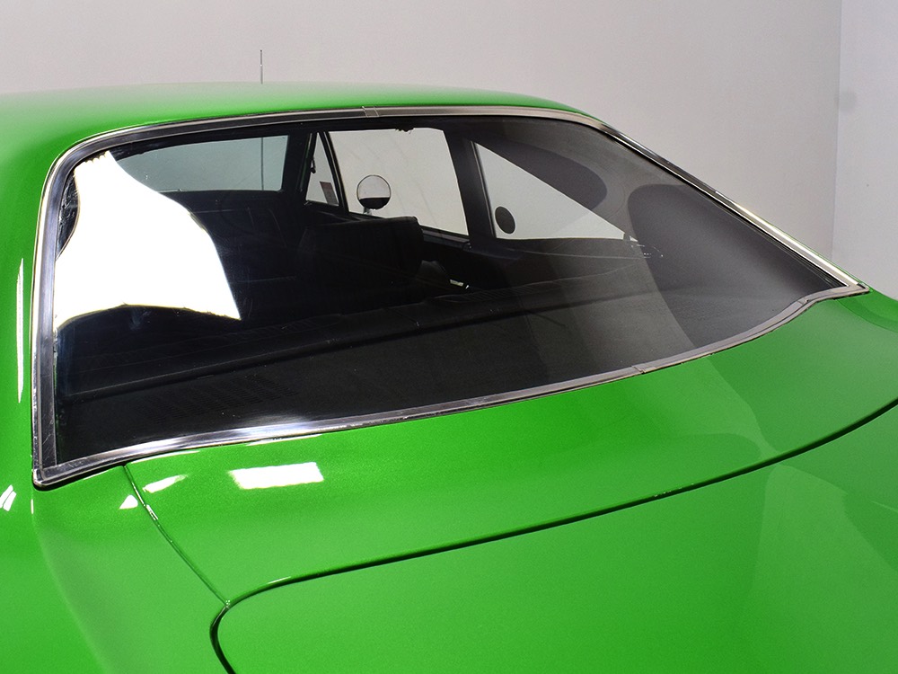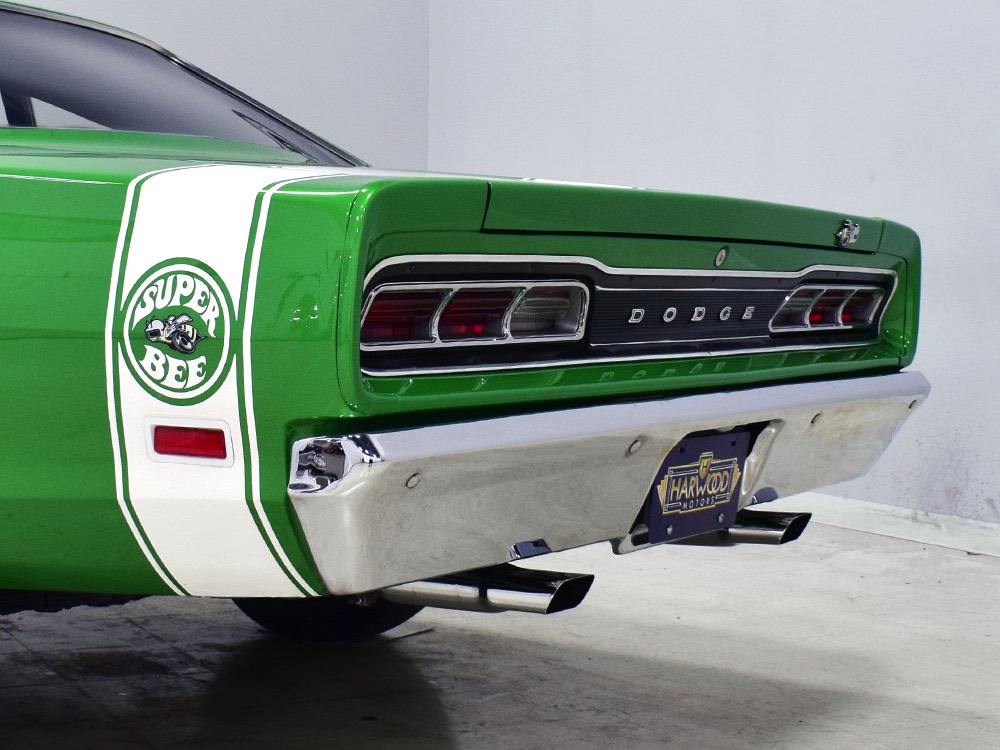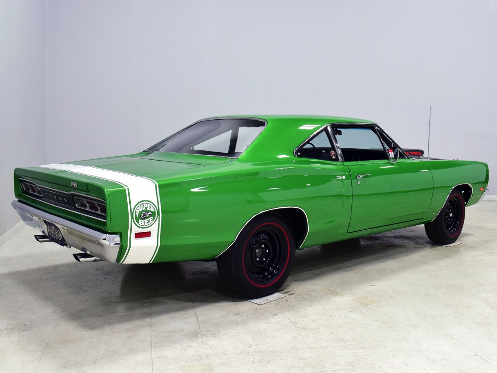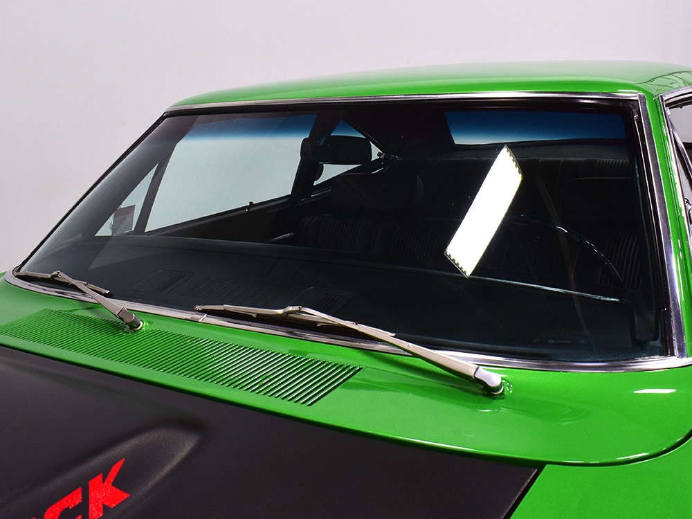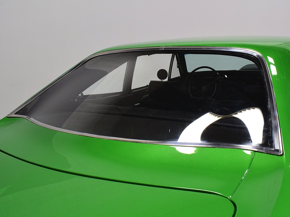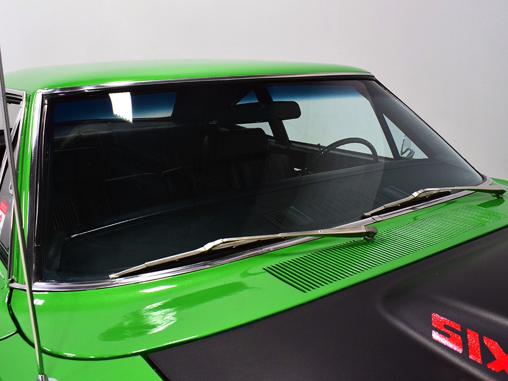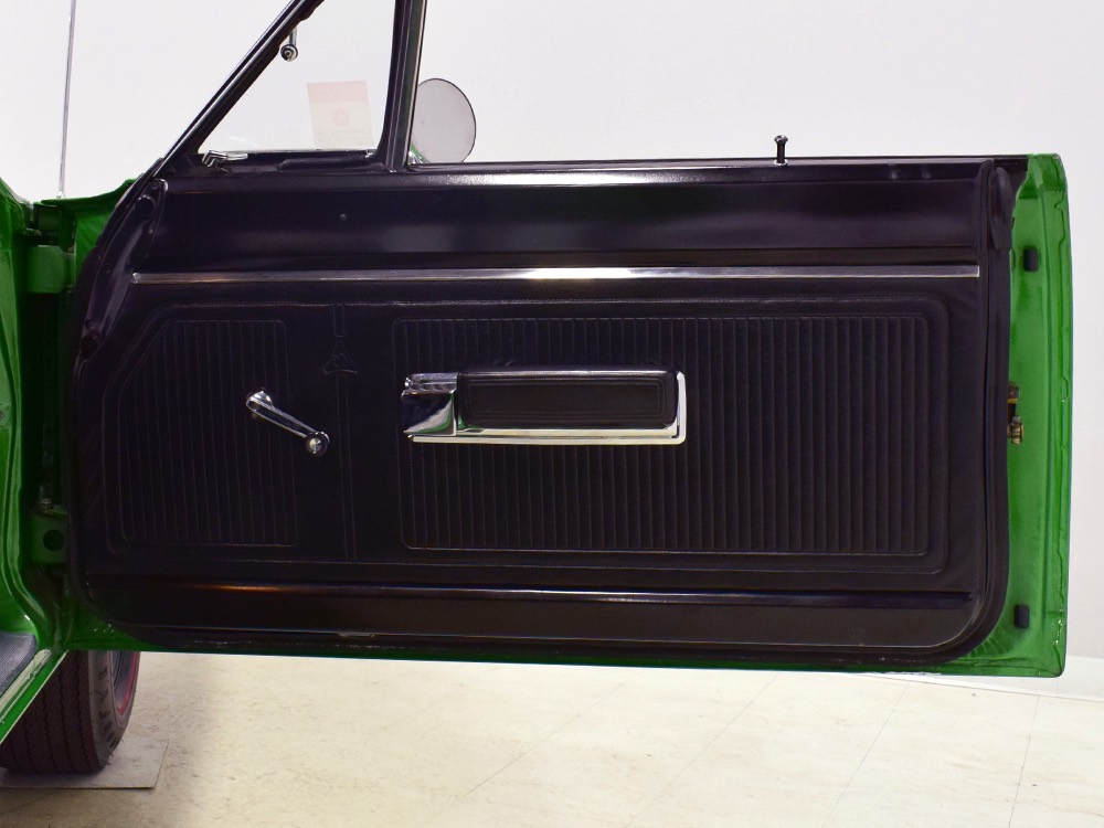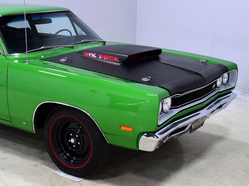 Which brings us to this spectacular Spring Green 1969 Dodge Super Bee A12. Easy to spot with its painted black wheels and black fiberglass lift-off hood, this happens to be the rarest of the bunch: a 2-door “post” sedan with a bench seat. See, this is the one that the guys who were actually going racing built. The 2-door post was the stiffest and lightest of the bunch, which was obviously key on the strip. And who cares about a bench seat? It was lighter if you kept it, but most guys didn’t so it didn’t matter. This car shows just 27,369 original miles (authenticated with an actual miles title and known ownership history) and you can imagine how those miles were accumulated. But being a car that spent most of its life on the track meant no winters, no rain, no dicing with amateurs in traffic, so the sheetmetal and bodywork is in fantastic condition with no replacement panels. Decoding the fender tag, you’ll see it was originally F6, which is indeed the bright Spring Green on it today. It looks awesome, but isn’t at all subtle, so you’ll have to be ready for the attention. The black hood features big, red SIX PACK lettering so no fooling the guy in the lane next to you, and that hood scoop is big enough to be a garage in Europe. A white bumble bee stripe around the tail is a great touch and since we’re skipping subtlety anyway, why not? And just check out the attention to detail in the restoration—the crisp, brightly detailed Super Bee emblems, the crystal clear original glass, reproduction decals, and someone splurged a little, because it has two external mirrors. Nice!