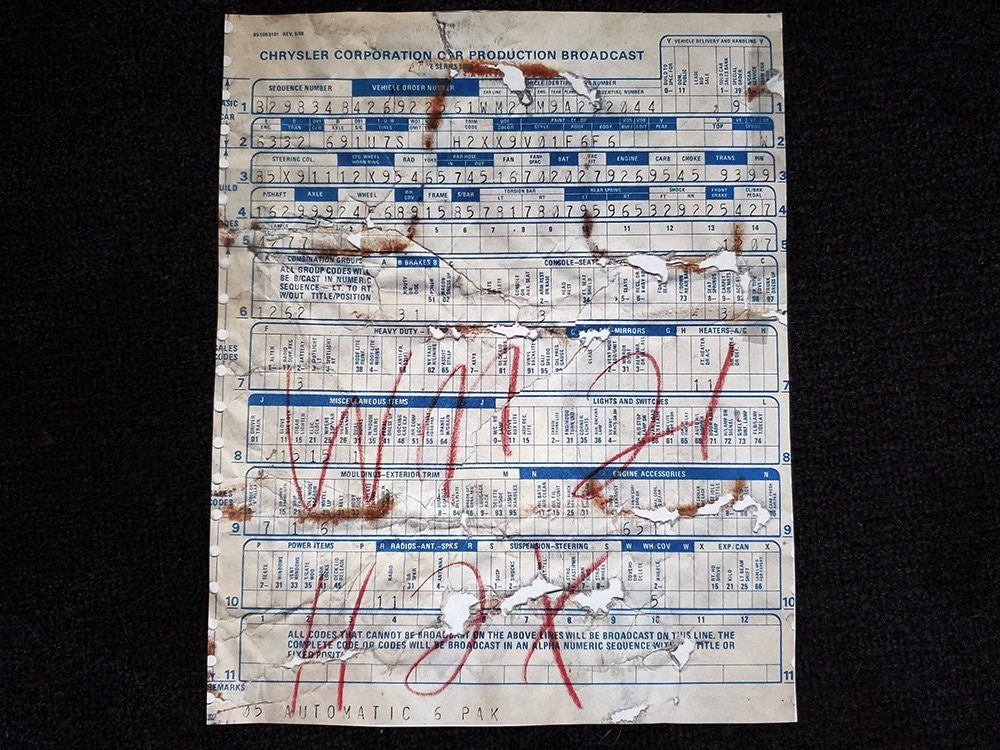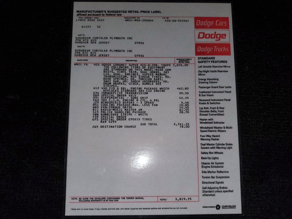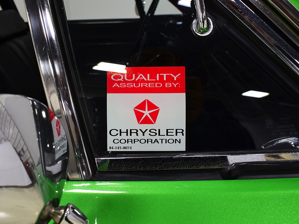Documentation includes the original Chrysler Corporation Broadcast Sheet, reproduction window sticker, and owner’s manual.