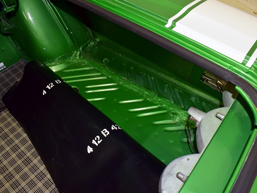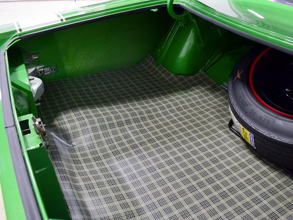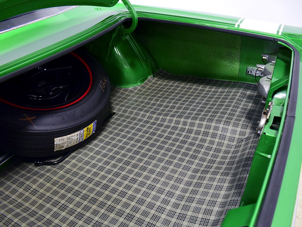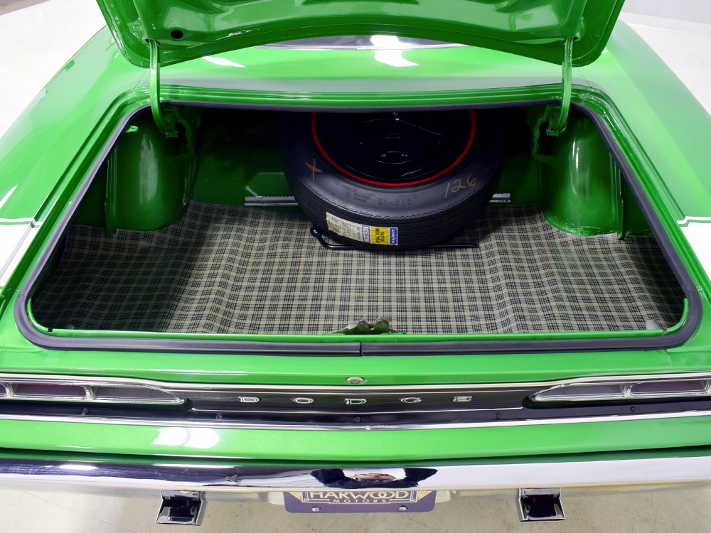 The black vinyl interior is all business, and if you’re worried about luxury and A/C and a killer stereo, well, the A12 isn’t your sort of car anyway. In fact, this interior is beautifully trimmed with a lot of originality and remains quite correct. No frills, of course, but the basic stuff works pretty darned well. The seats are comfortable and firm, the sightlines are excellent, and although this Super Bee was built for combat, it doesn’t feel like they deleted any stuff that made it useable on the street. Factory Rallye Gauges look bright and crisp and they all work properly. The Music Master AM radio works properly, too. There are Super Bee floor mats, which were not original equipment but they’re not a bad idea, and that original headliner is in fantastic shape, don’t you think? Obviously the trunk is massive, with what might just be the original spare tire still stashed up there on its own shelf. It also includes a correct jack assembly and a reproduction mat. Looking underneath, there is no sign of rust or accident damage and the trunk extensions are in excellent condition.