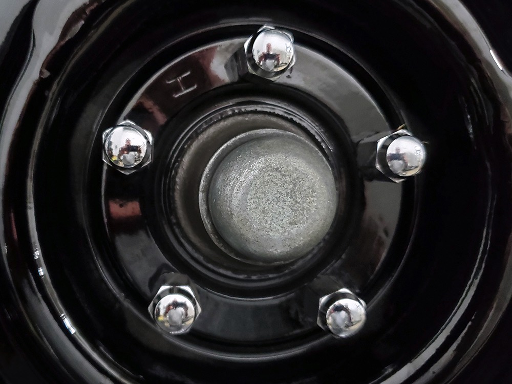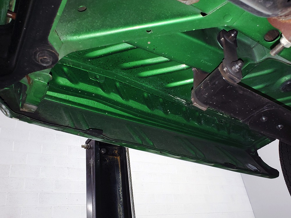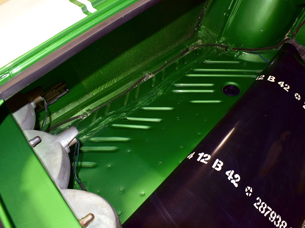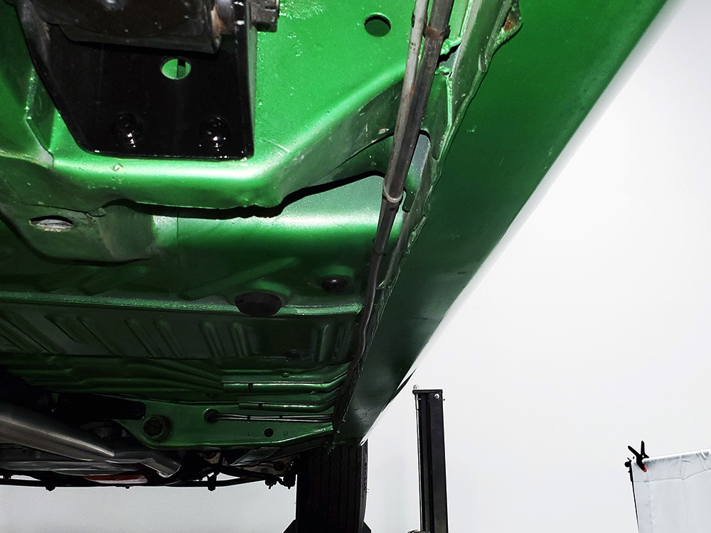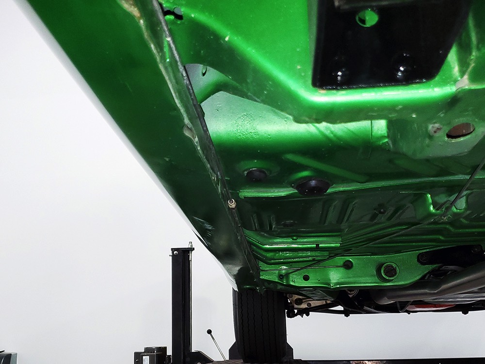 The black vinyl interior is all business, and if you’re worried about luxury and A/C and a killer stereo, well, the A12 isn’t your sort of car anyway. In fact, this interior is beautifully trimmed with a lot of originality and remains quite correct. No frills, of course, but the basic stuff works pretty darned well. The seats are comfortable and firm, the sightlines are excellent, and although this Super Bee was built for combat, it doesn’t feel like they deleted any stuff that made it useable on the street. Factory Rallye Gauges look bright and crisp and they all work properly. The Music Master AM radio works properly, too. There are Super Bee floor mats, which were not original equipment but they’re not a bad idea, and that original headliner is in fantastic shape, don’t you think? Obviously the trunk is massive, with what might just be the original spare tire still stashed up there on its own shelf. It also includes a correct jack assembly and a reproduction mat. Looking underneath, there is no sign of rust or accident damage and the trunk extensions are in excellent condition.