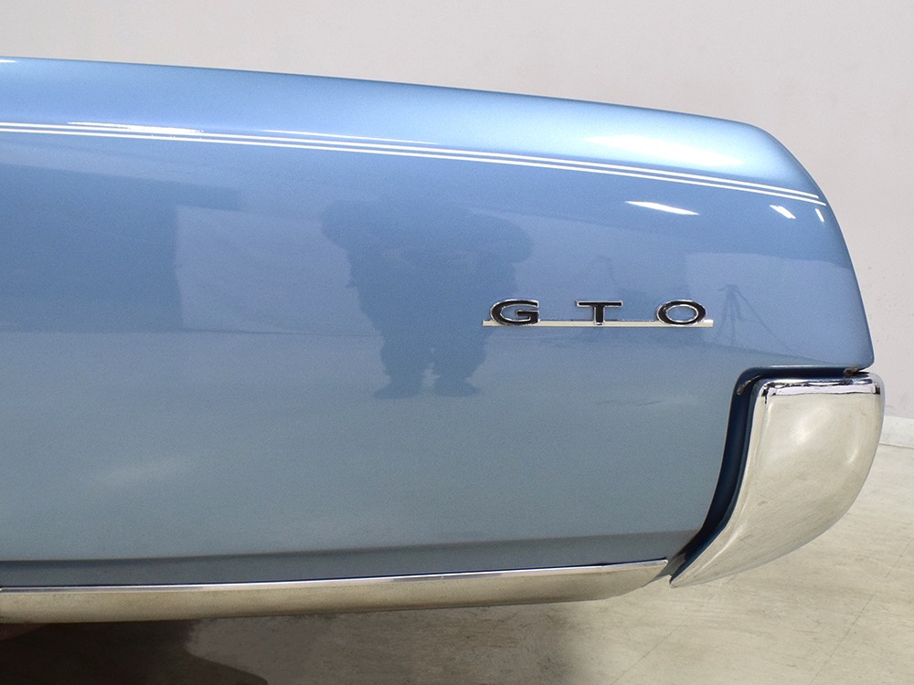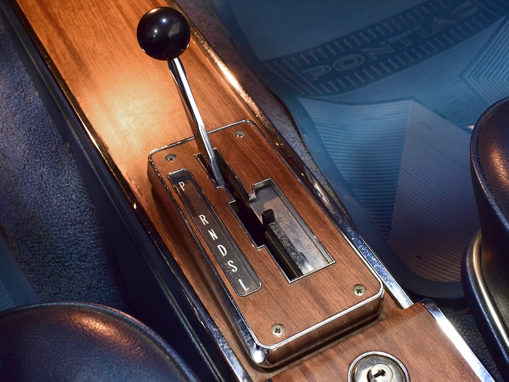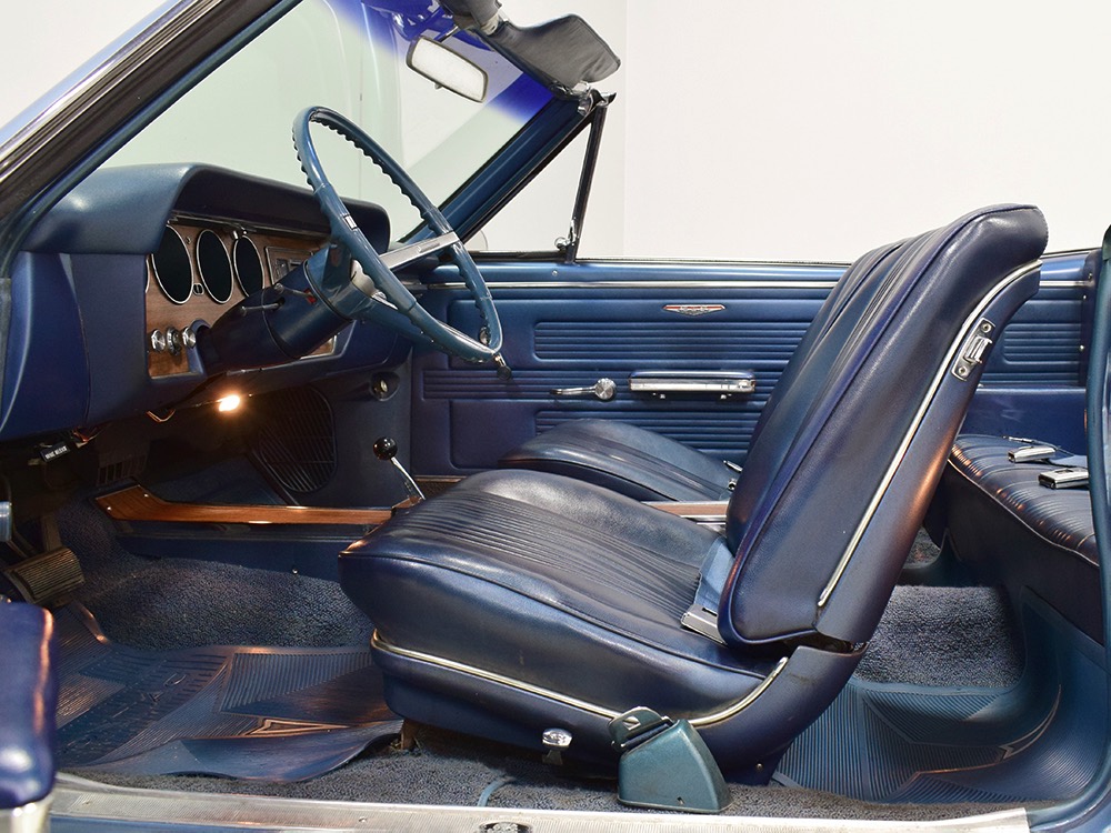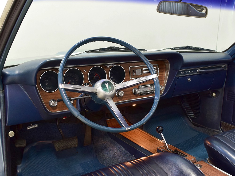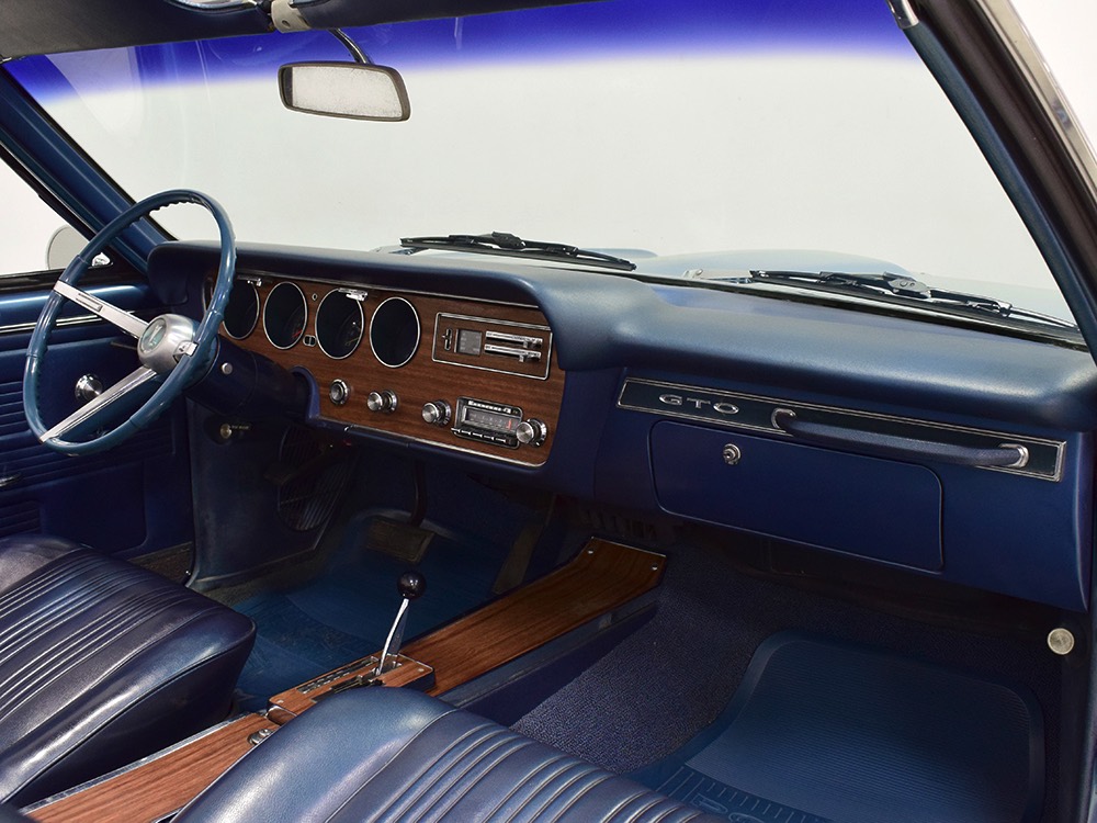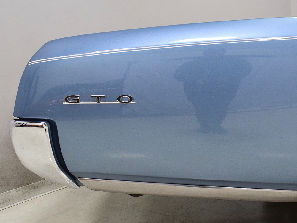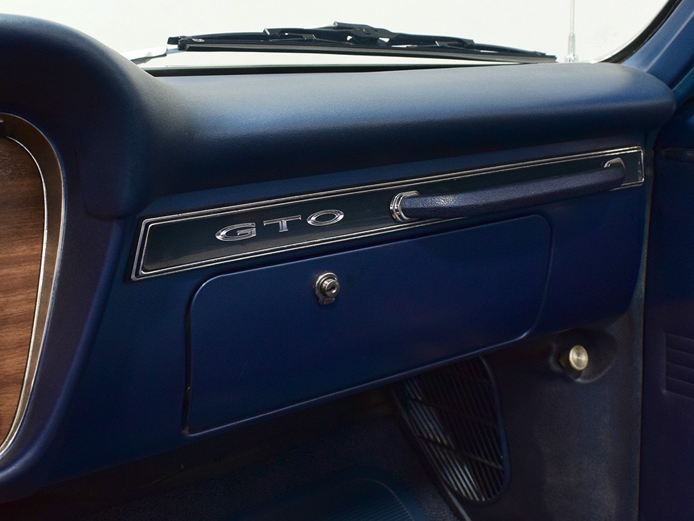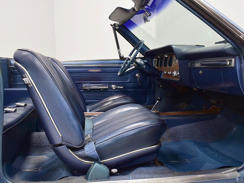 Aside from a high-quality repaint about 15 years ago in the original Montreux Blue, this 1967 GTO remains largely original throughout. For many enthusiasts, original cars hold a certain appeal—no they’re not a shiny as a fresh frame-off restoration but they often drive better and this GTO is no exception. It’s tight, smooth, and competent-feeling on the road, all qualities that are difficult to restore back into a car after it’s been fully disassembled. It has always been treated as an item of value, so it’s unlikely that it was anyone’s daily driver and seems to have been reserved for fair-weather fun. That explains the immaculate sheetmetal, both on top and underneath, and the car is wearing its original quarters, floors, and trunk pan, all evidence that the car has never suffered from rust or rot. The icy Montreux Blue finish is sophisticated and elegant instead of in-your-face aggressive, and that’s where Pontiac really shines—they built performance cars for grown-ups. There was plenty of time and effort invested in the repaint, which still shows extremely well and has a great shine, no ripples or waves, decent panel alignment, and a recent buff that really makes it glow. A white pinstripe was added, as original, and it really highlights the curving quarter panels that are arguably the ‘67’s best feature. All the original emblems are still in place, including the ‘6.5 litre’ chevrons on the rocker panels and GTO block letters fore, aft, and on both quarters. Nobody’s going to mistake this for anything else. It also features nice original chrome—more evidence that this car never suffered through winter weather—and the stainless has polished up nicely to give it an all-of-a-piece look. It’s an extremely handsome car.